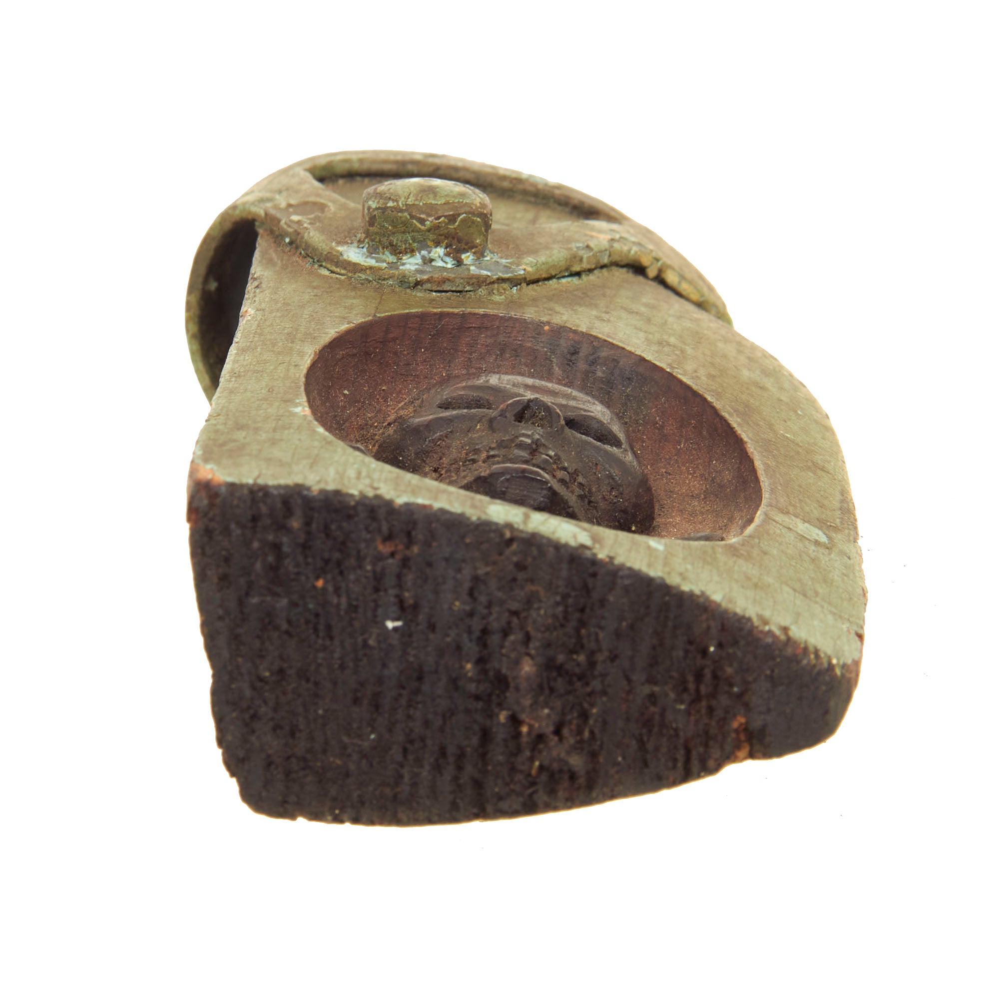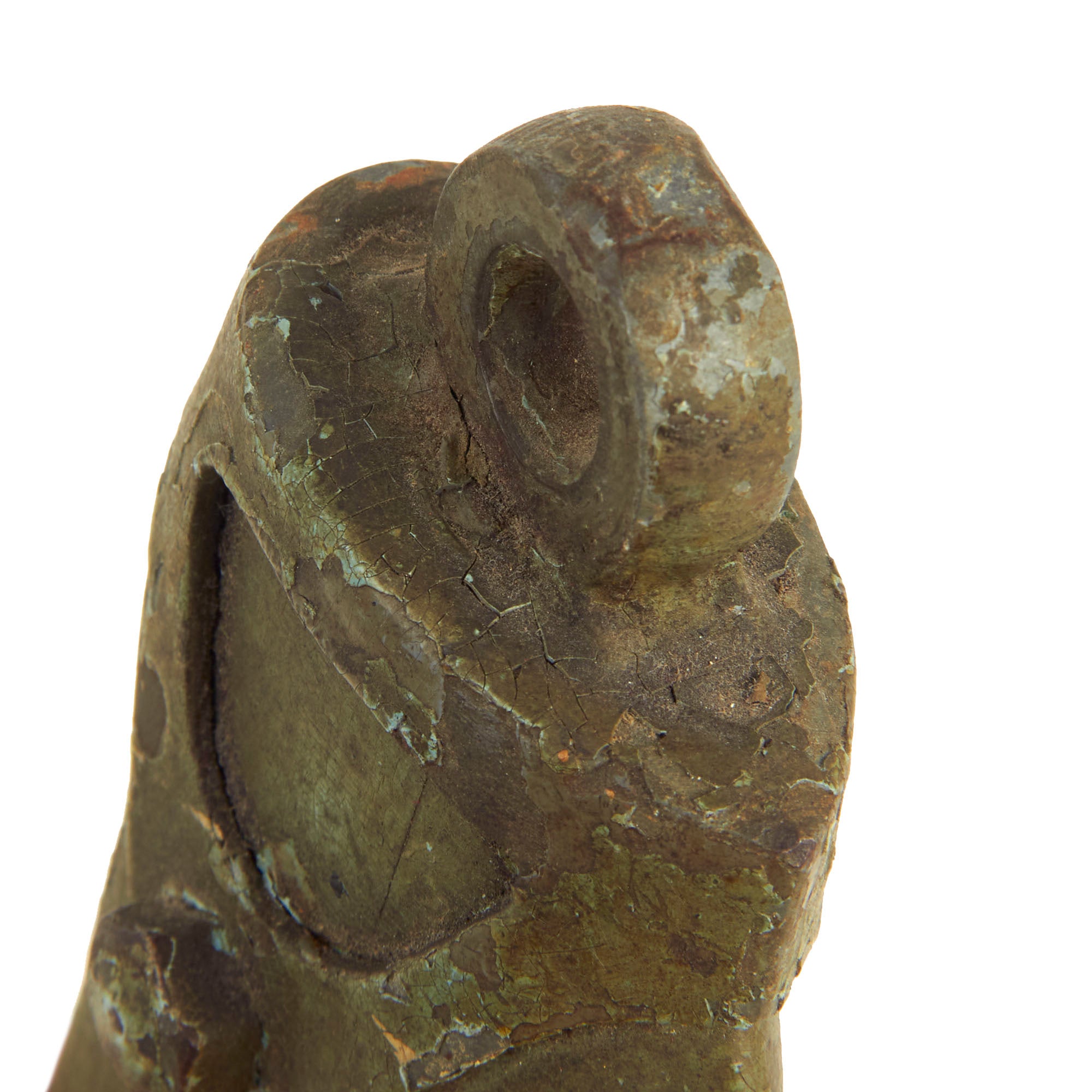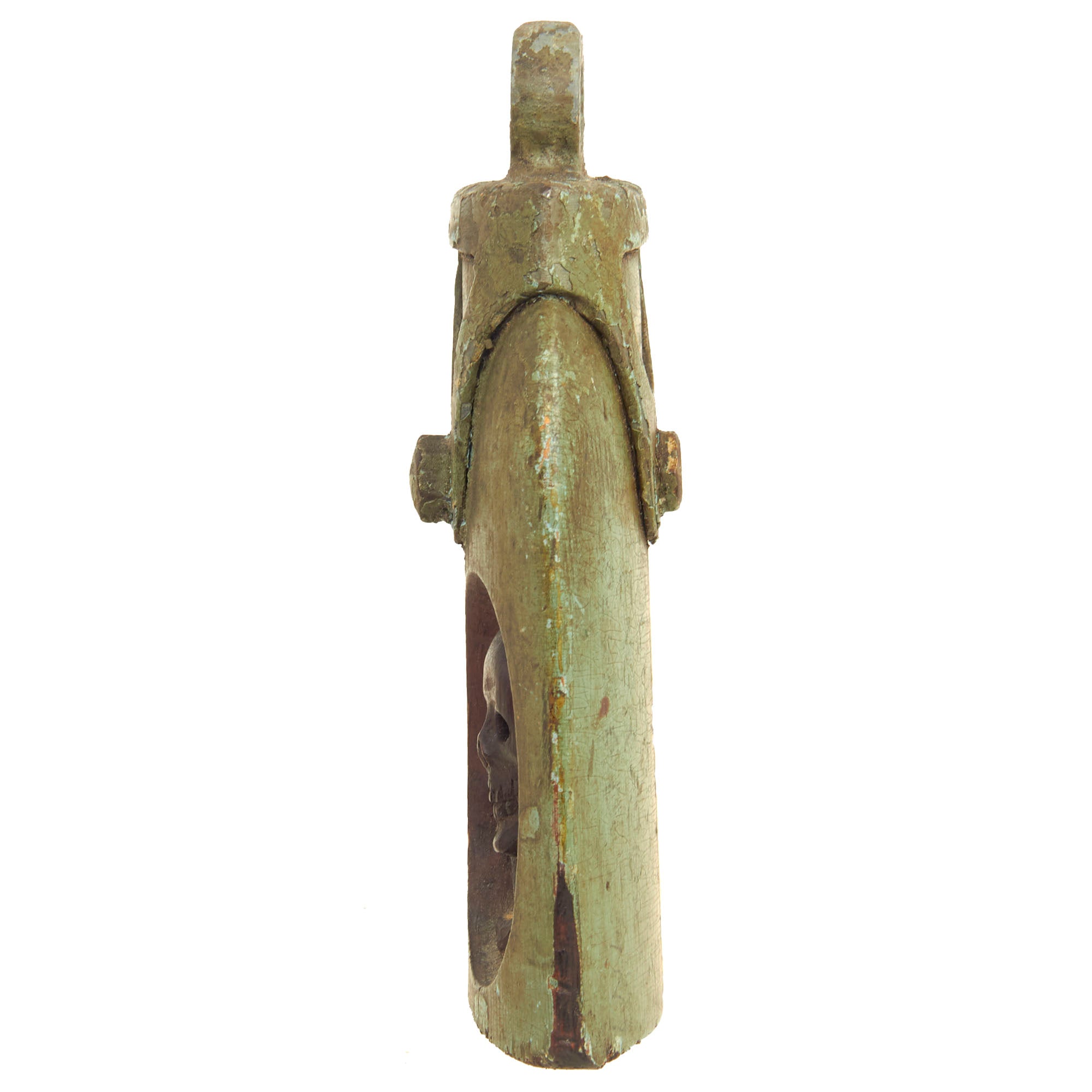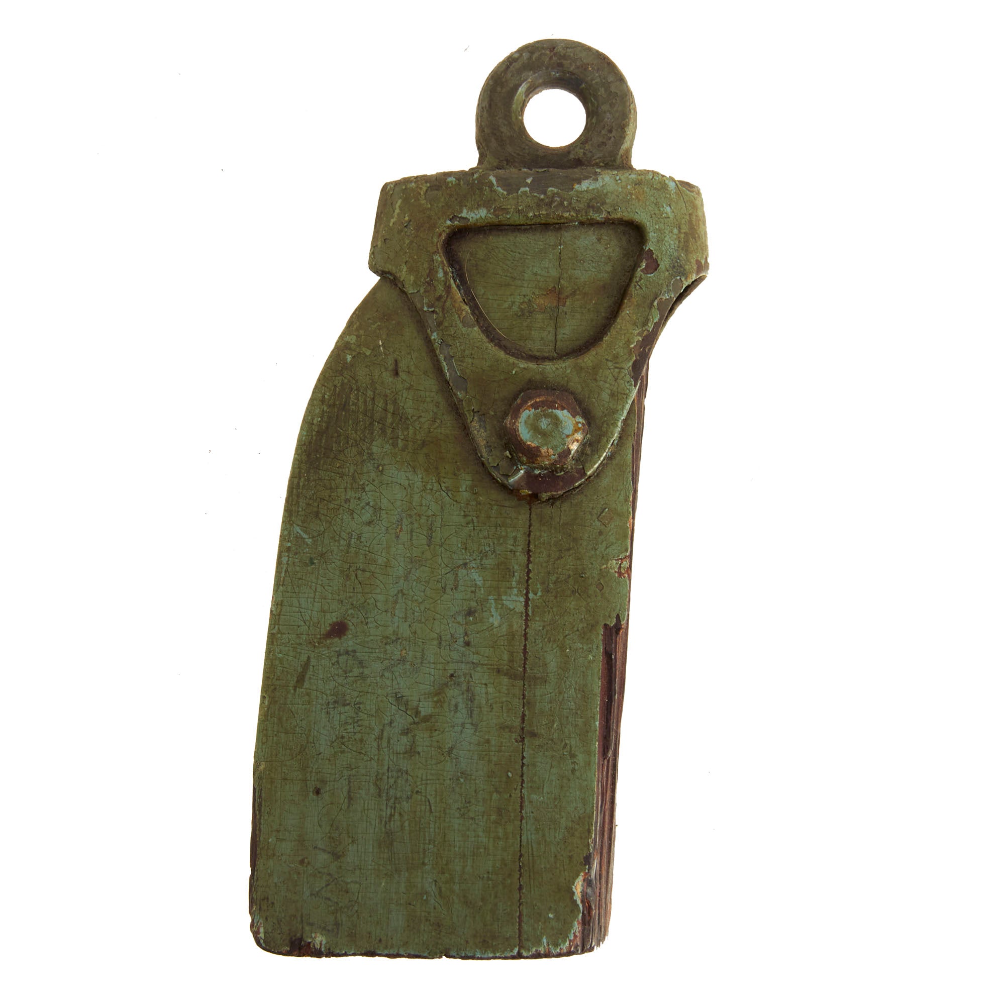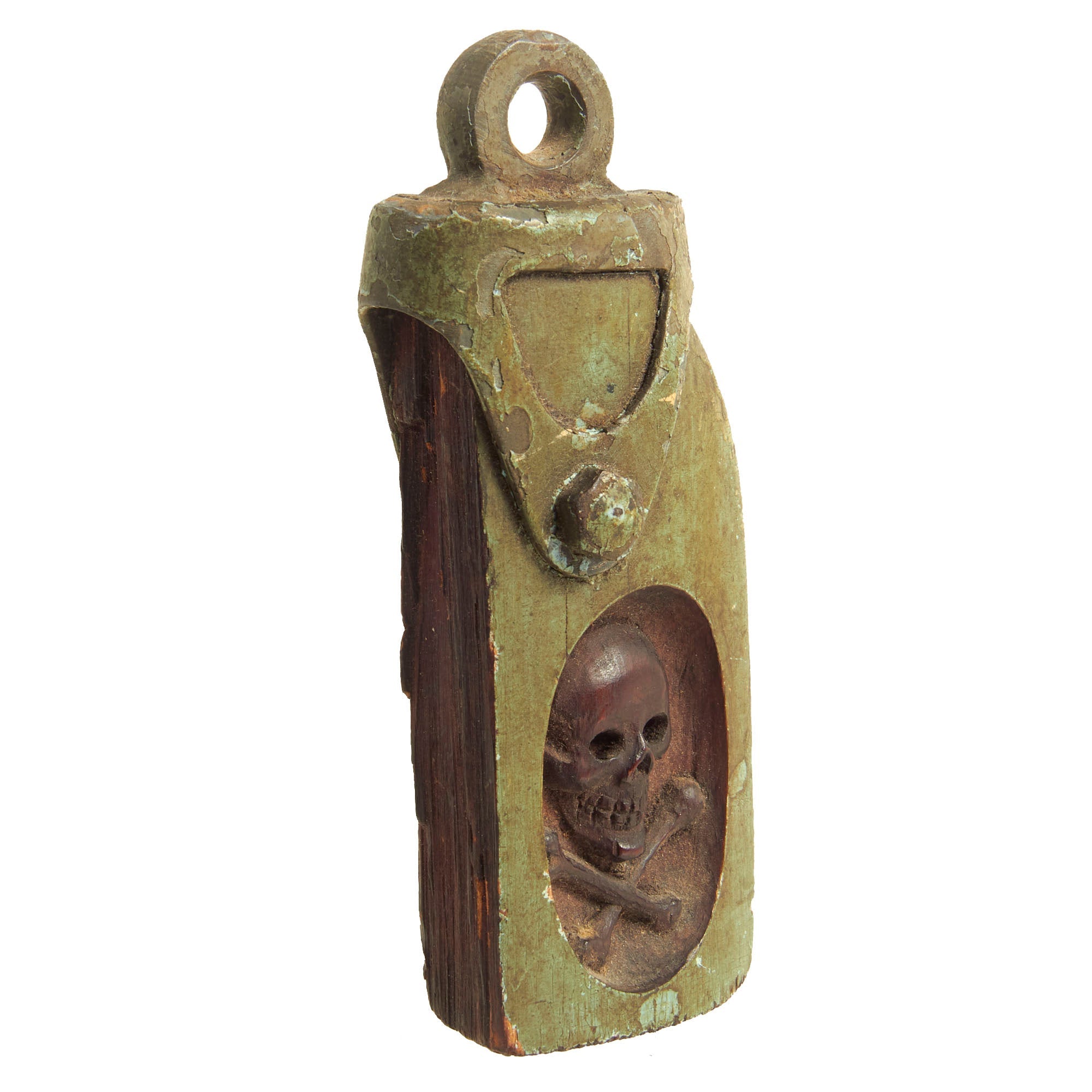 The 5 ½” tall strut is in wonderful condition but does have a broken section. The strut piece itself is OD green in color and still retains the steel hardware used to attach to the wing. The lower portion has a lovely Skull and Crossbones carved by hand into the wood with great detail.