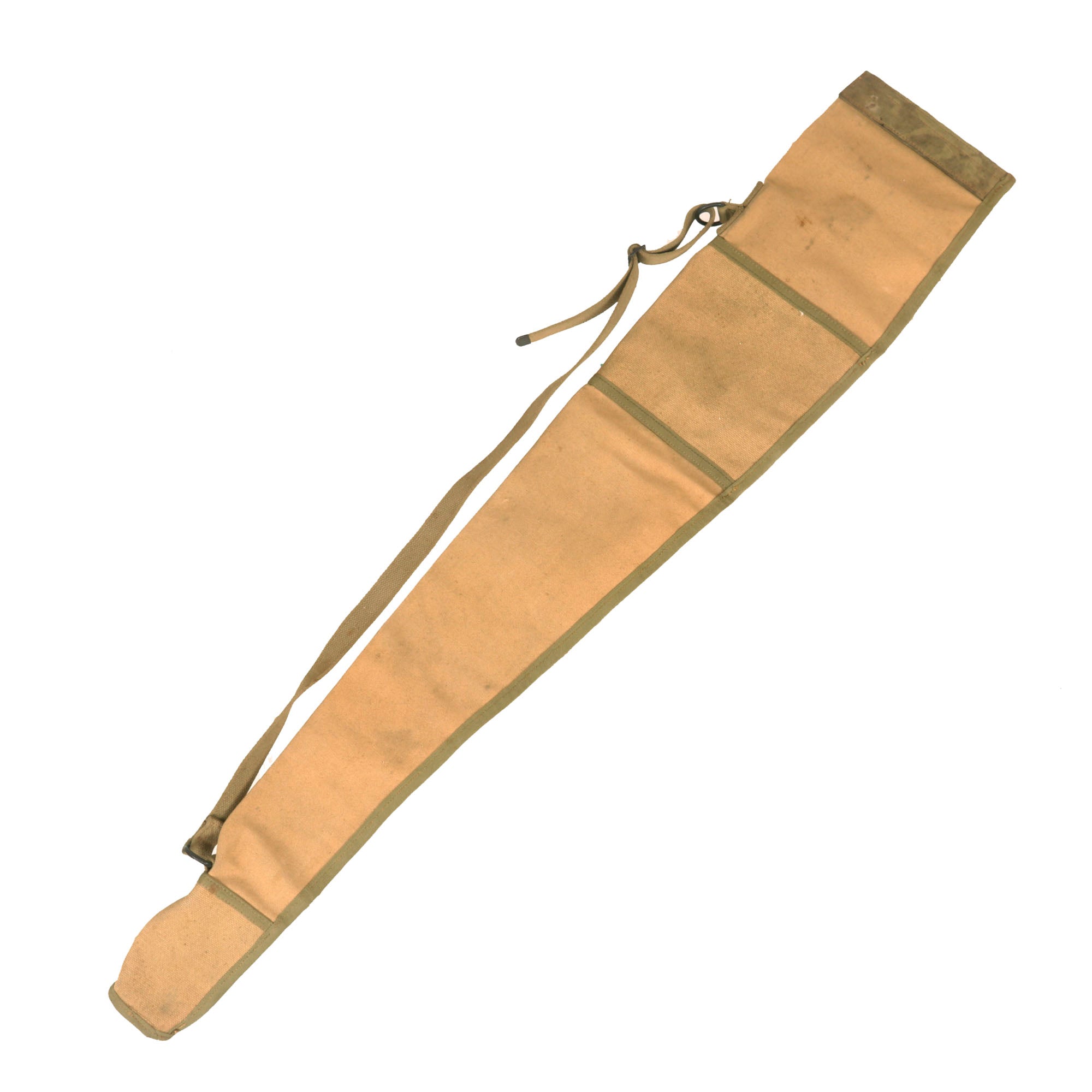 The rifle carry case is of an earlier type as it still has the top leather closure flap, while the later models had used canvas. These cases would have been used to keep your rifle protected from the elements while it was not being used. The case is complete with all buckles, straps and correct carry sling. There is no significant damage present, but there is fading present on the material as well as areas of staining and rust. This example is stenciled:
