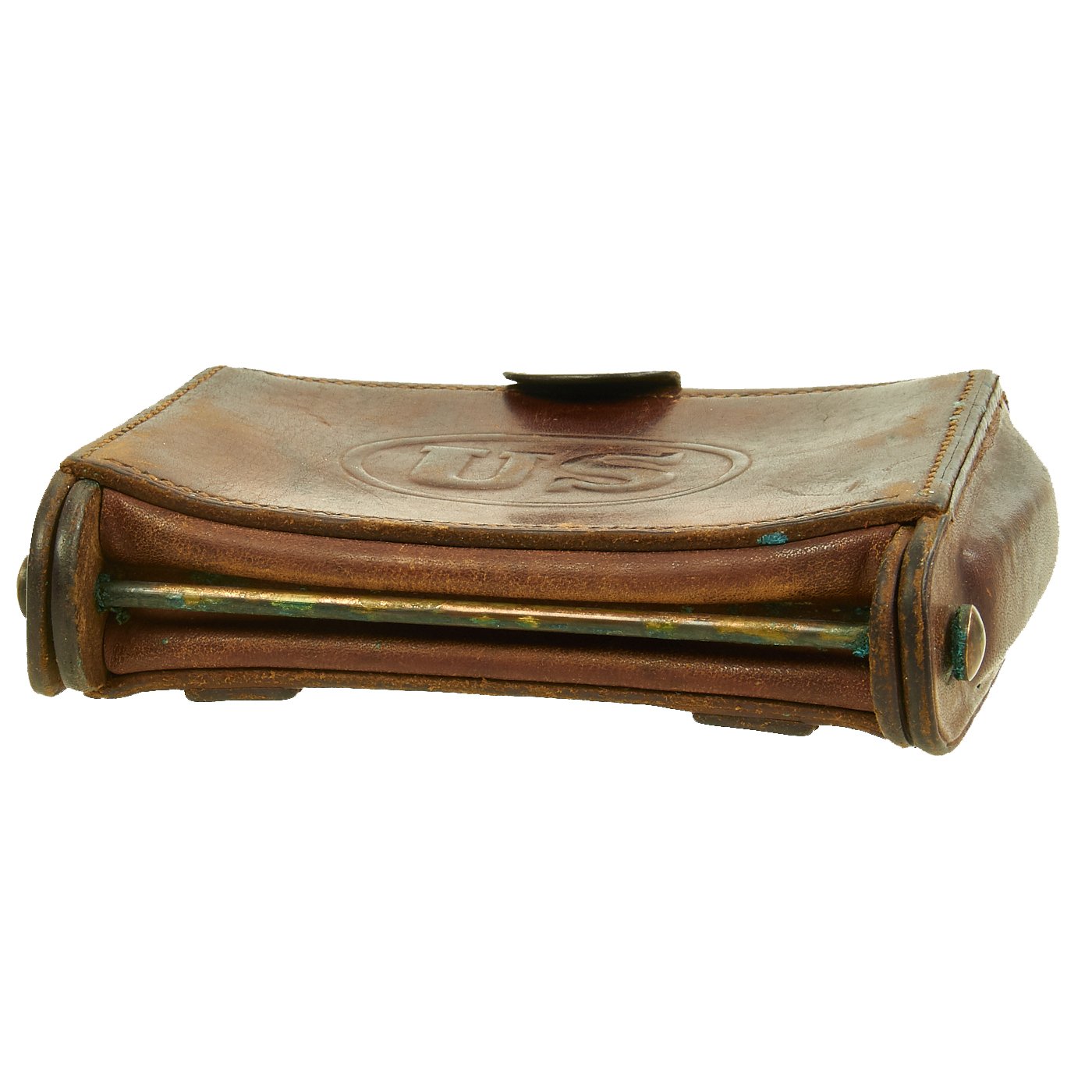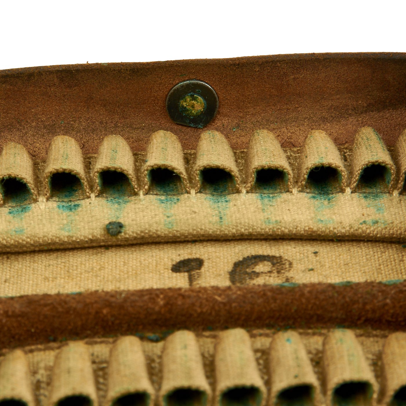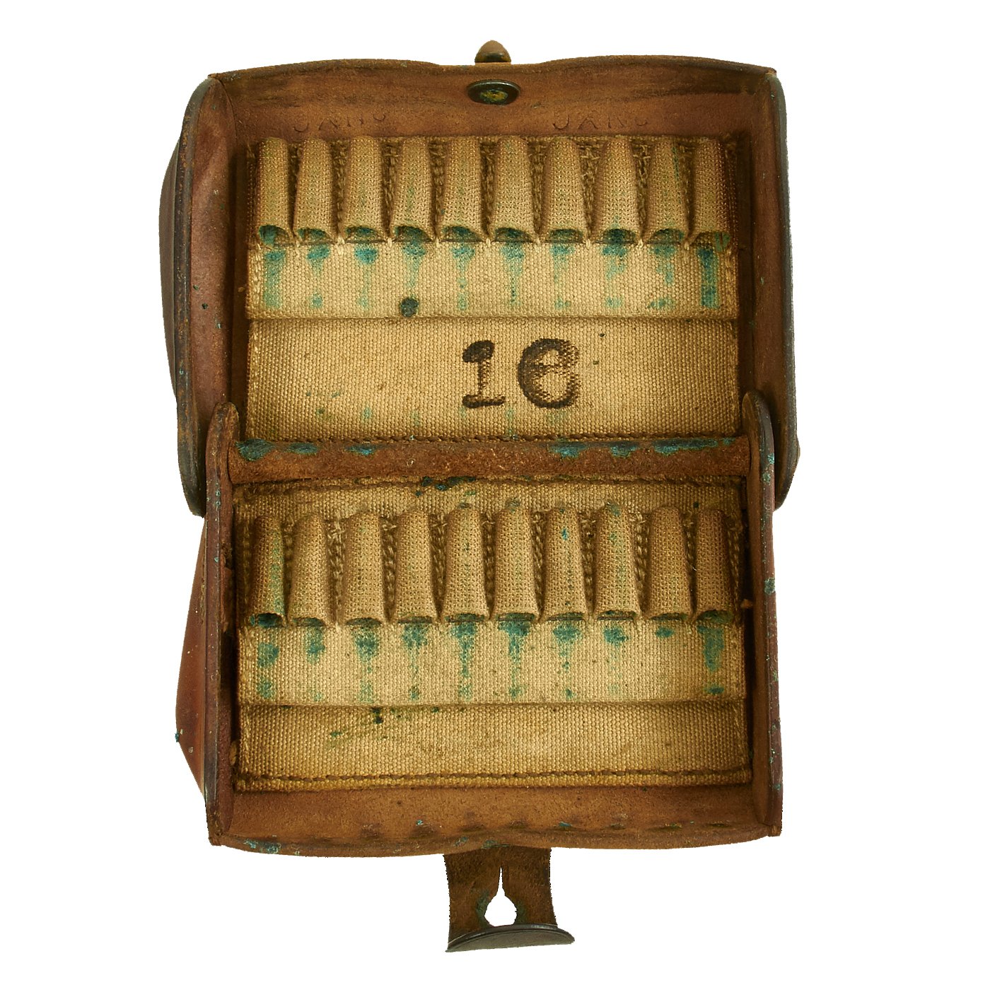 This example is complete and in very good condition. Brown leather box “hinged” at the bottom with a brass rod. Leather closure tab fastens to brass finial on the top. Tab is complete and unbroken, though it does have some cracking and verdigris. Two narrow belt loops sewn and riveted to the back. “U.S.” stamped within an oval in center of front flap. Canvas loops to hold ten .30cal cartridges sewn to each half (20 rounds total) for a Krag or Springfield longarm. There is also a space on the side for a ruptured cartridge extractor. Stitching remains strong and tight.