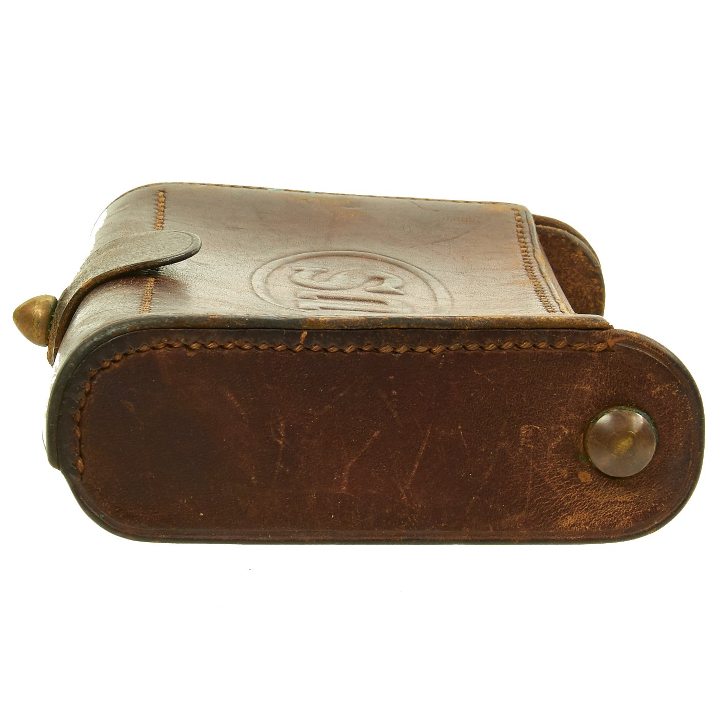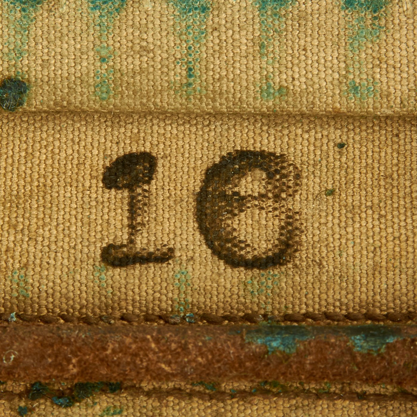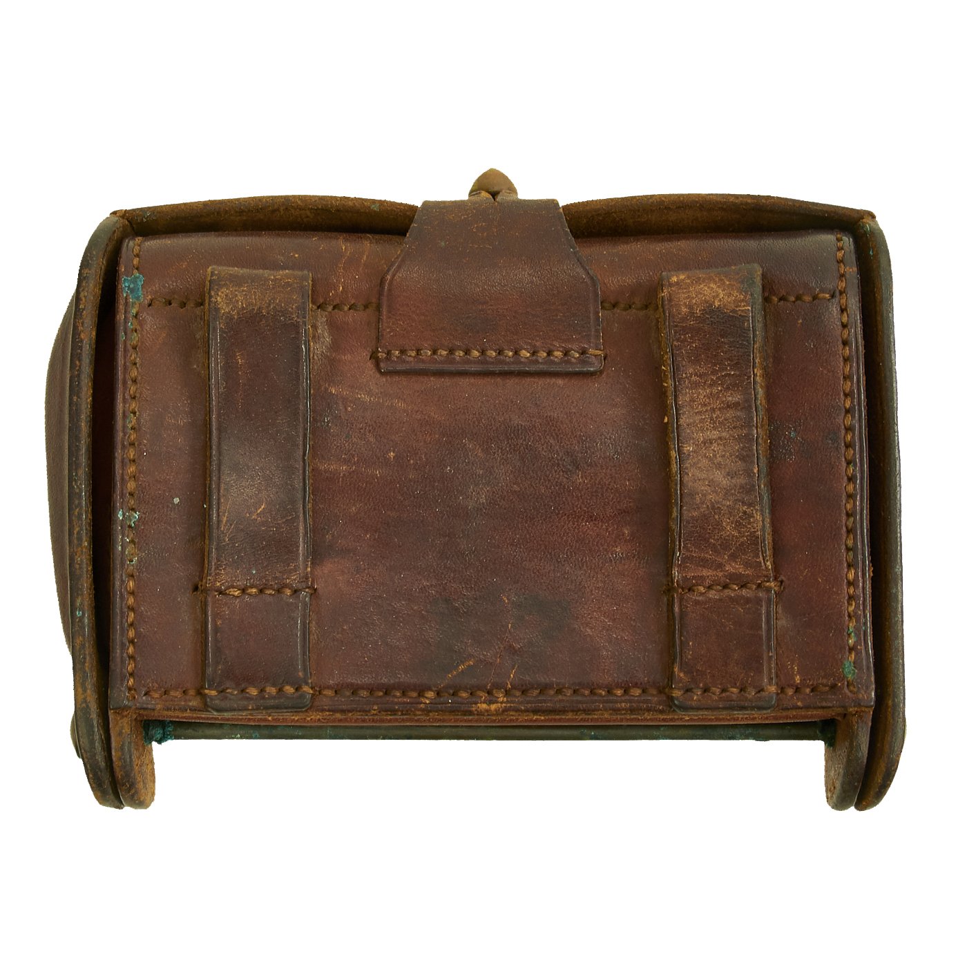 This example is complete and in very good condition. Brown leather box “hinged” at the bottom with a brass rod. Leather closure tab fastens to brass finial on the top. Tab is complete and unbroken, though it does have some cracking and verdigris. Two narrow belt loops sewn and riveted to the back. “U.S.” stamped within an oval in center of front flap. Canvas loops to hold ten .30cal cartridges sewn to each half (20 rounds total) for a Krag or Springfield longarm. There is also a space on the side for a ruptured cartridge extractor. Stitching remains strong and tight.