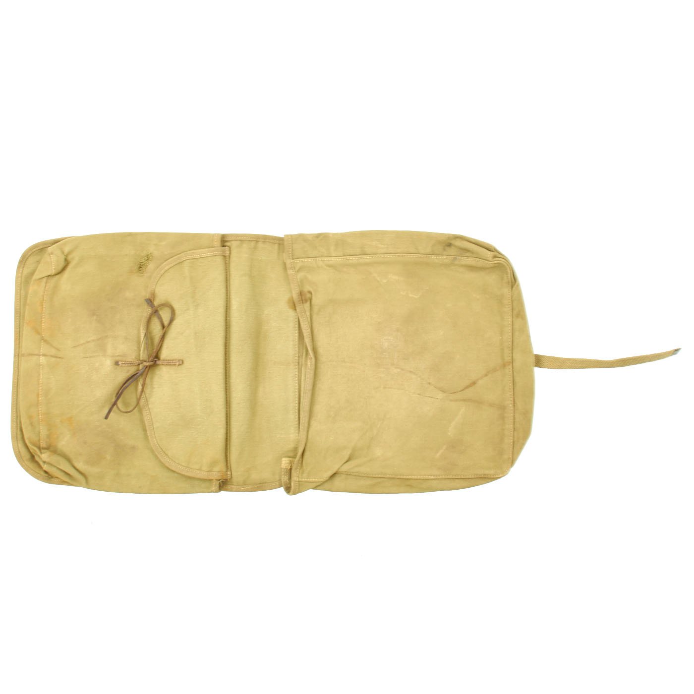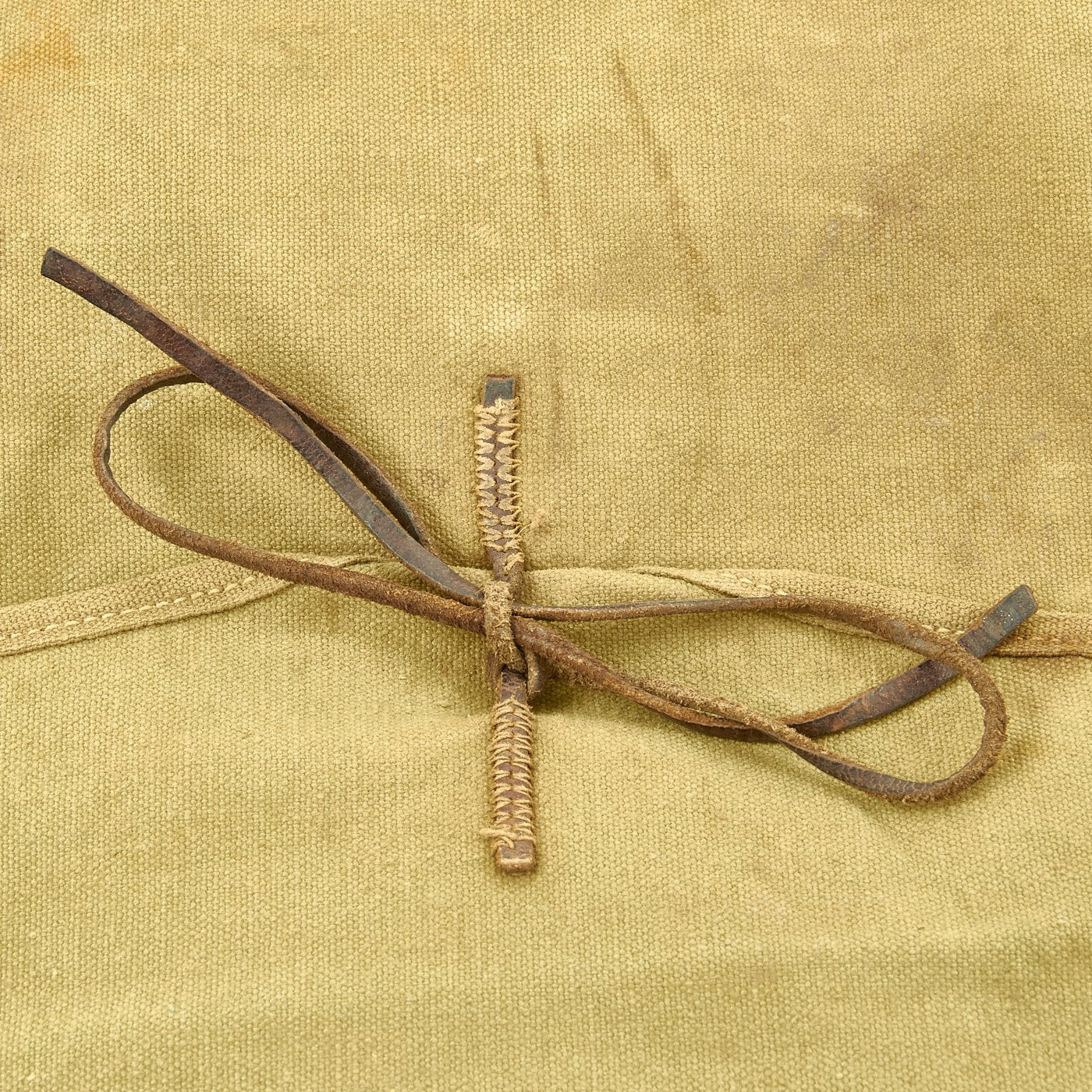 The Model 1904 haversack was the standard issue haversack for soldiers of the United States military prior to the introduction of the M1910 Haversack. The haversack allowed the soldier to carry his rations, mess gear, and small personal items. Although the M1904 haversack was outdated by World War I, many National Guard units arrived in France still using this haversack. This haversack was manufactured by the Rock Island Arsenal in 1904. This haversack still has the leather lace inside to close an inner pocket. The M1904 haversack attached to the cartridge belt using two bent wire hooks. Haversacks PRIOR to 1904 were carried using a leather strep. These too were issued to some soldiers during World War I.