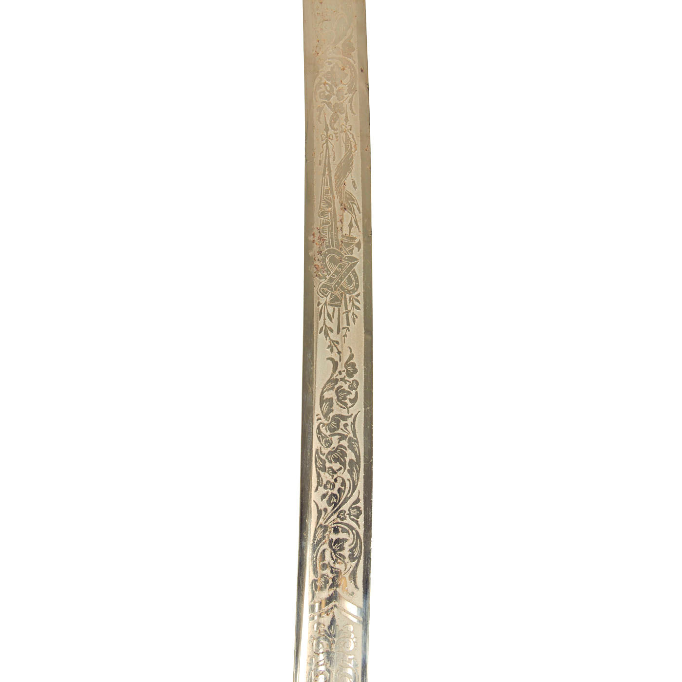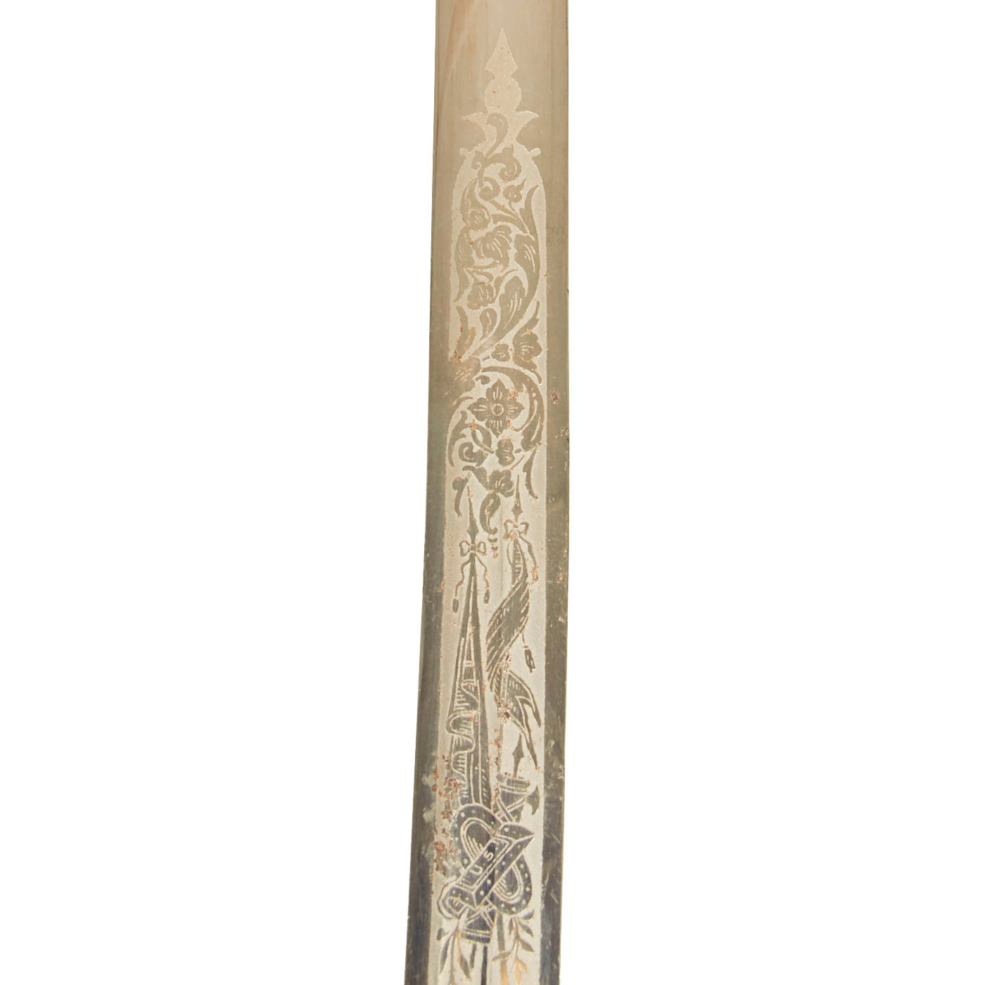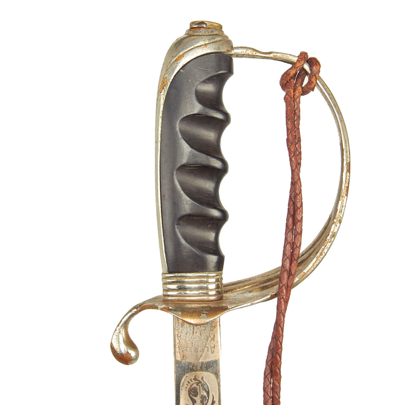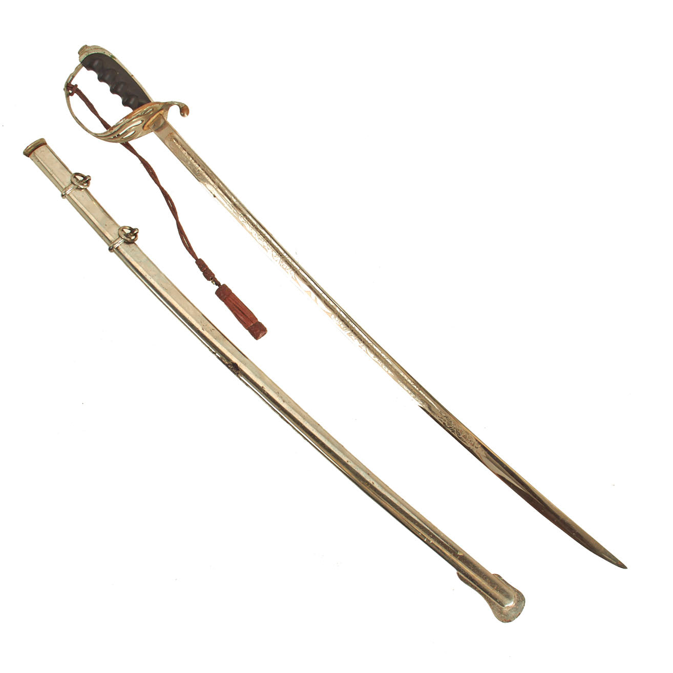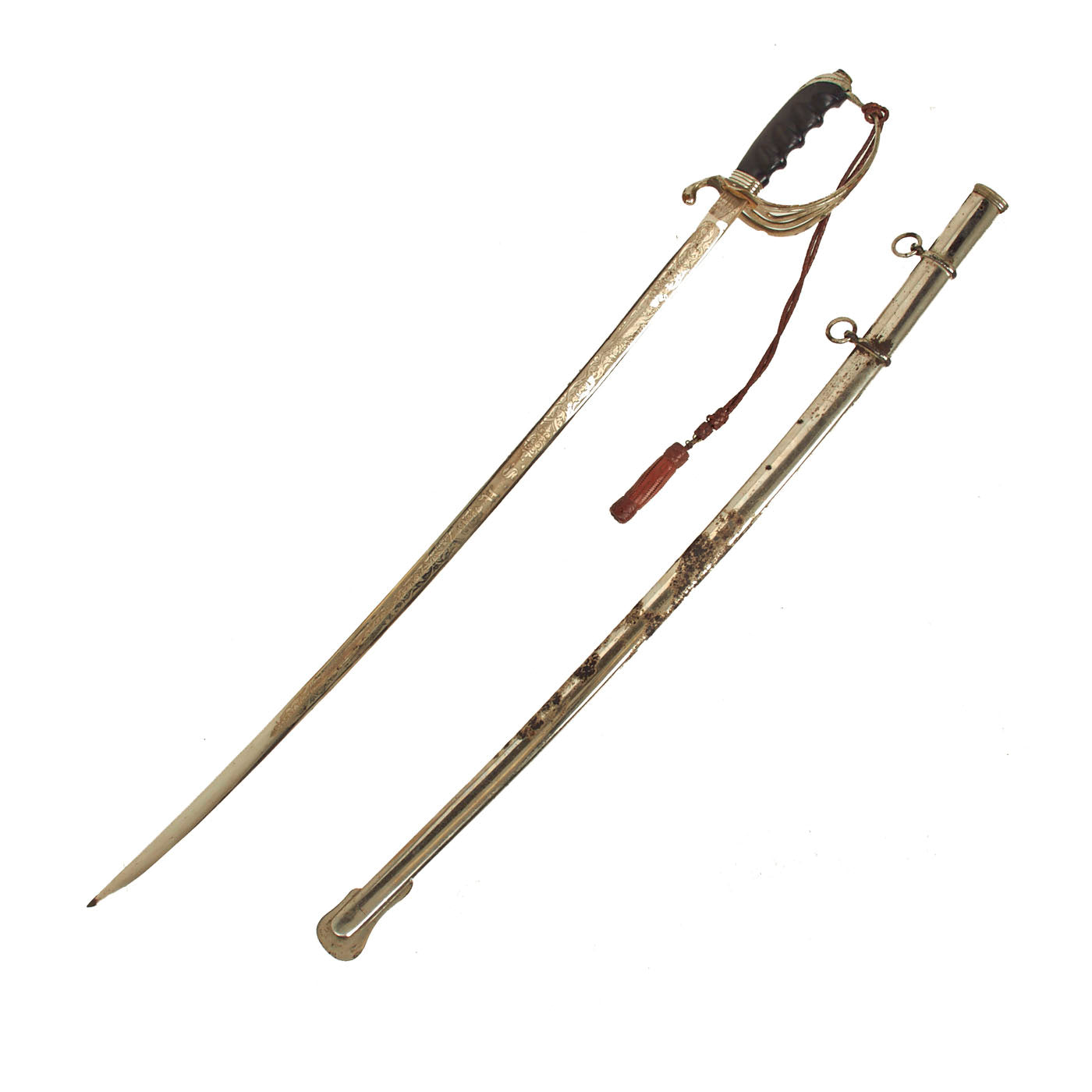 There is a large panel on one side, where usually the officer's name or initials would be etched or engraved, but this example was never personalized in that fashion. Condition is very good, though there is some oxidation and wear to the nickel plate, which has started to bubble up and flake on the scabbard. There is also some wear through on the hilt, which has minor movement. The leather blade buffer is still present as is the sword knot.