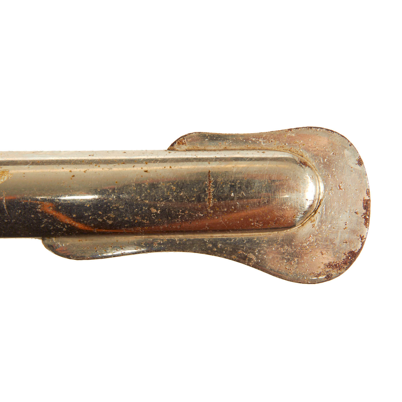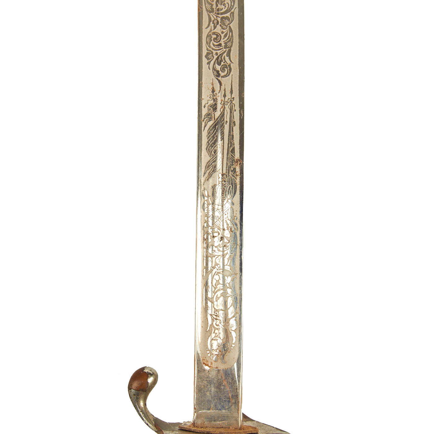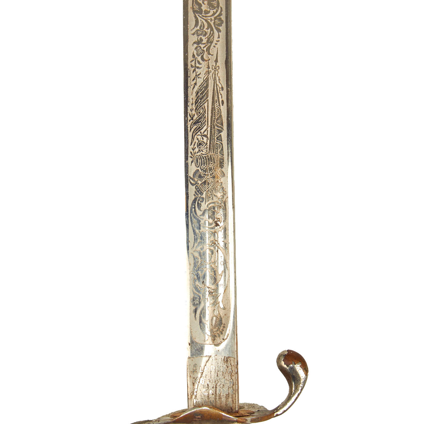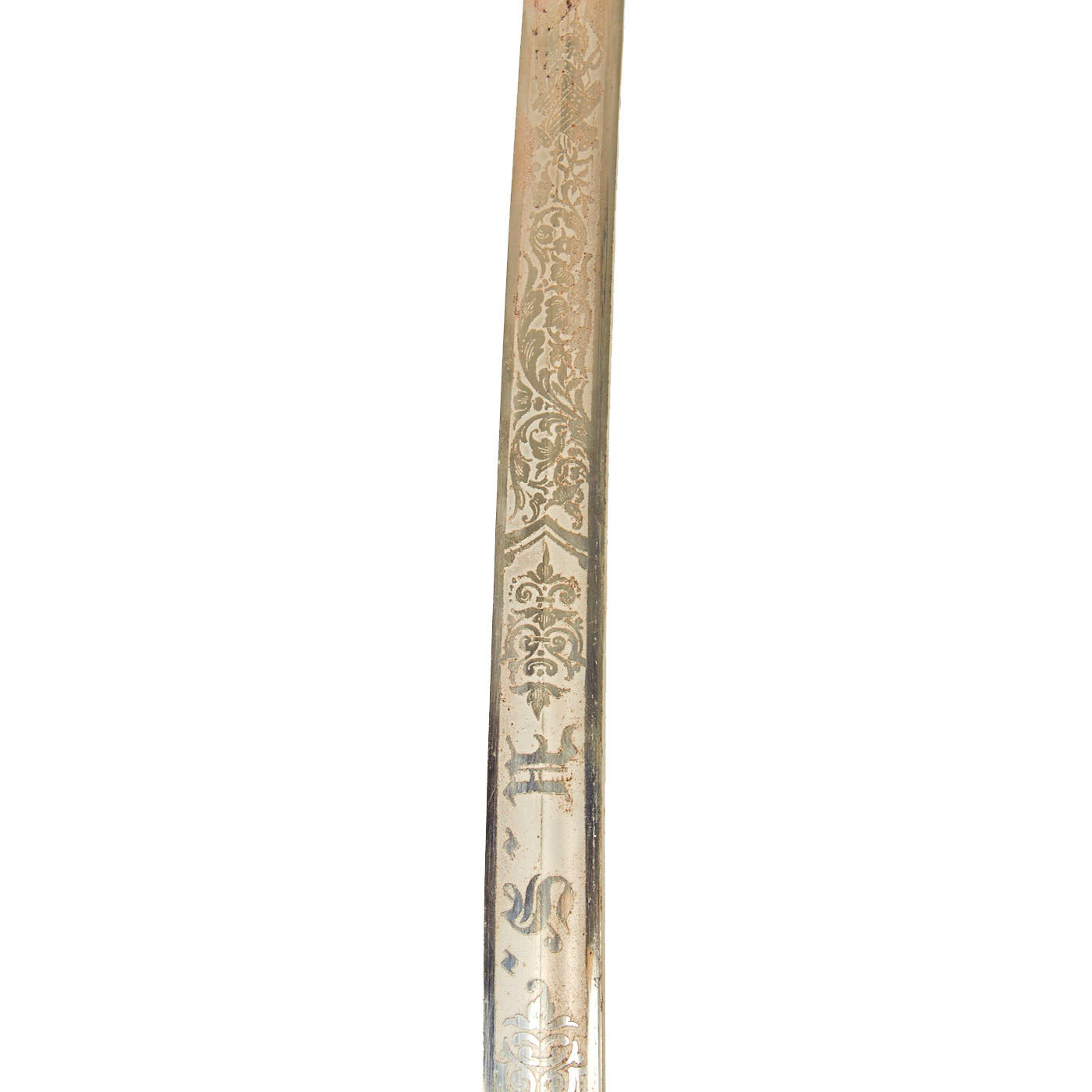 There is a large panel on one side, where usually the officer's name or initials would be etched or engraved, but this example was never personalized in that fashion. Condition is very good, though there is some oxidation and wear to the nickel plate, which has started to bubble up and flake on the scabbard. There is also some wear through on the hilt, which has minor movement. The leather blade buffer is still present as is the sword knot.