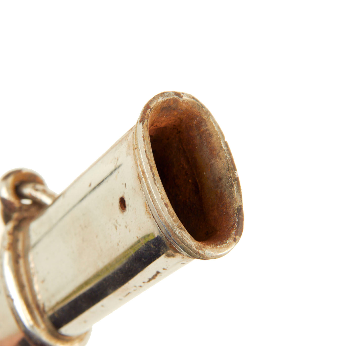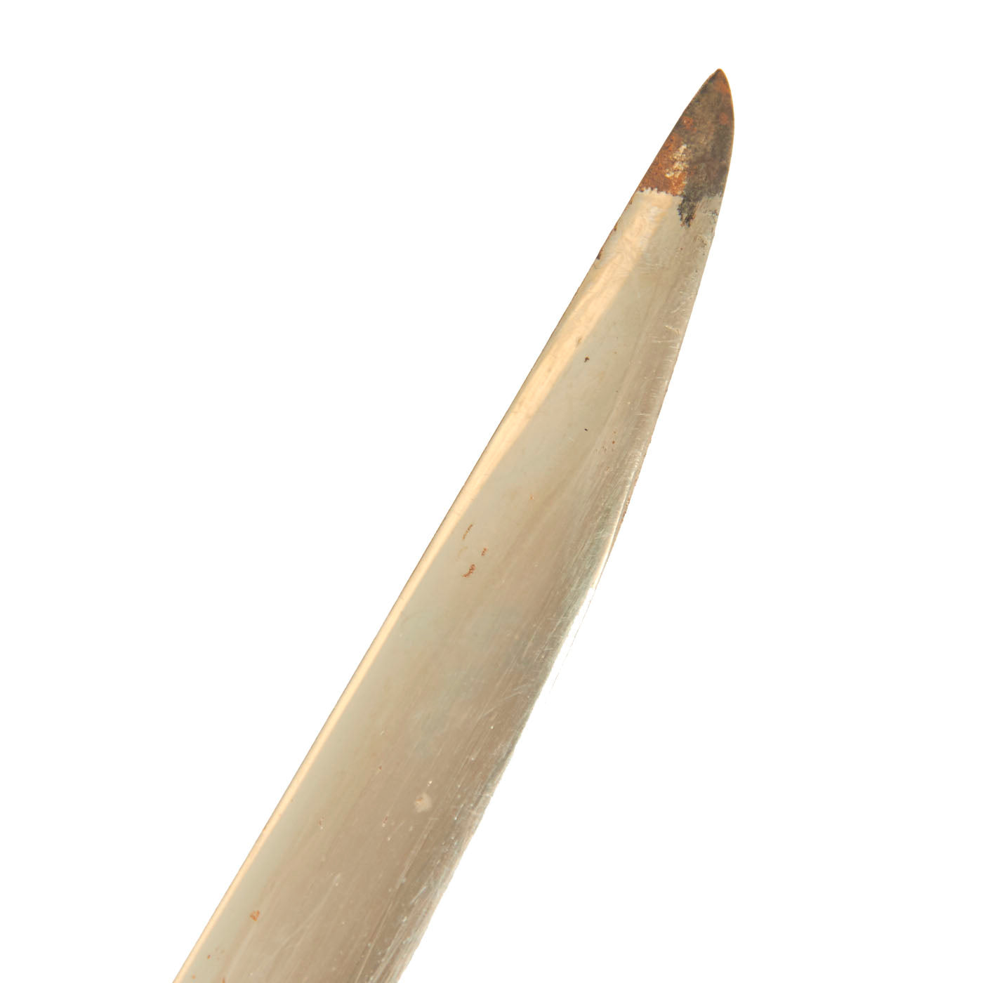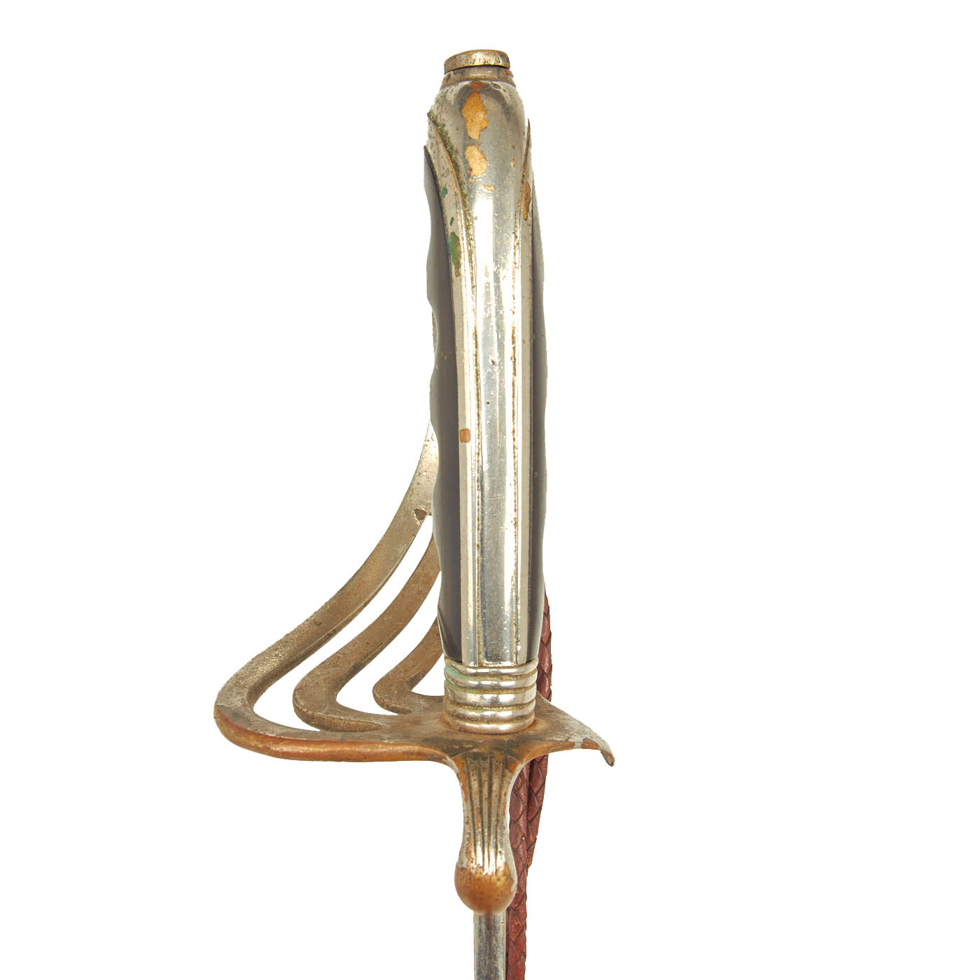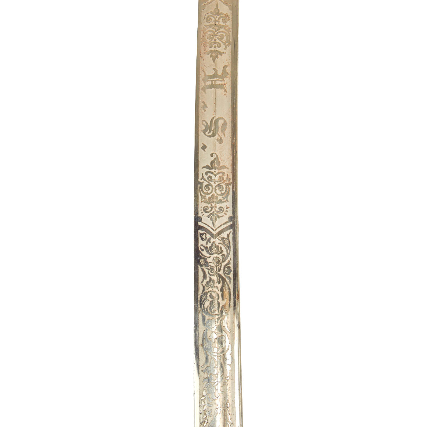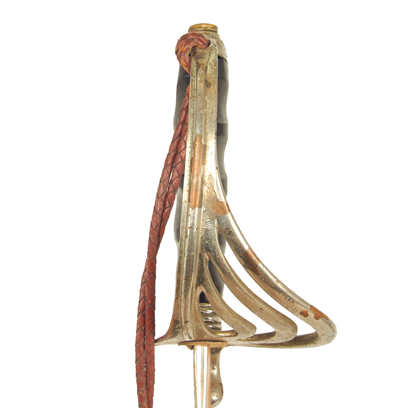 There is a large panel on one side, where usually the officer's name or initials would be etched or engraved, but this example was never personalized in that fashion. Condition is very good, though there is some oxidation and wear to the nickel plate, which has started to bubble up and flake on the scabbard. There is also some wear through on the hilt, which has minor movement. The leather blade buffer is still present as is the sword knot.