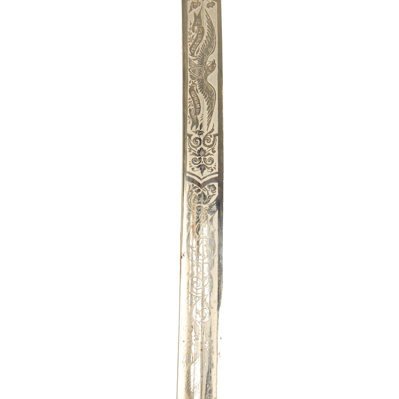 This fine example looks to be from the early 20th century, possibly WWI era, and is in very nice condition. As with most, it is fully nickel plated, with a triple-etched slightly curved blade, and a nickel plated steel scabbard. The etching on the blade shows the standard heraldry of the U.S. Army with U.S. and E PLURIBUS UNUM, and various stands of arms.