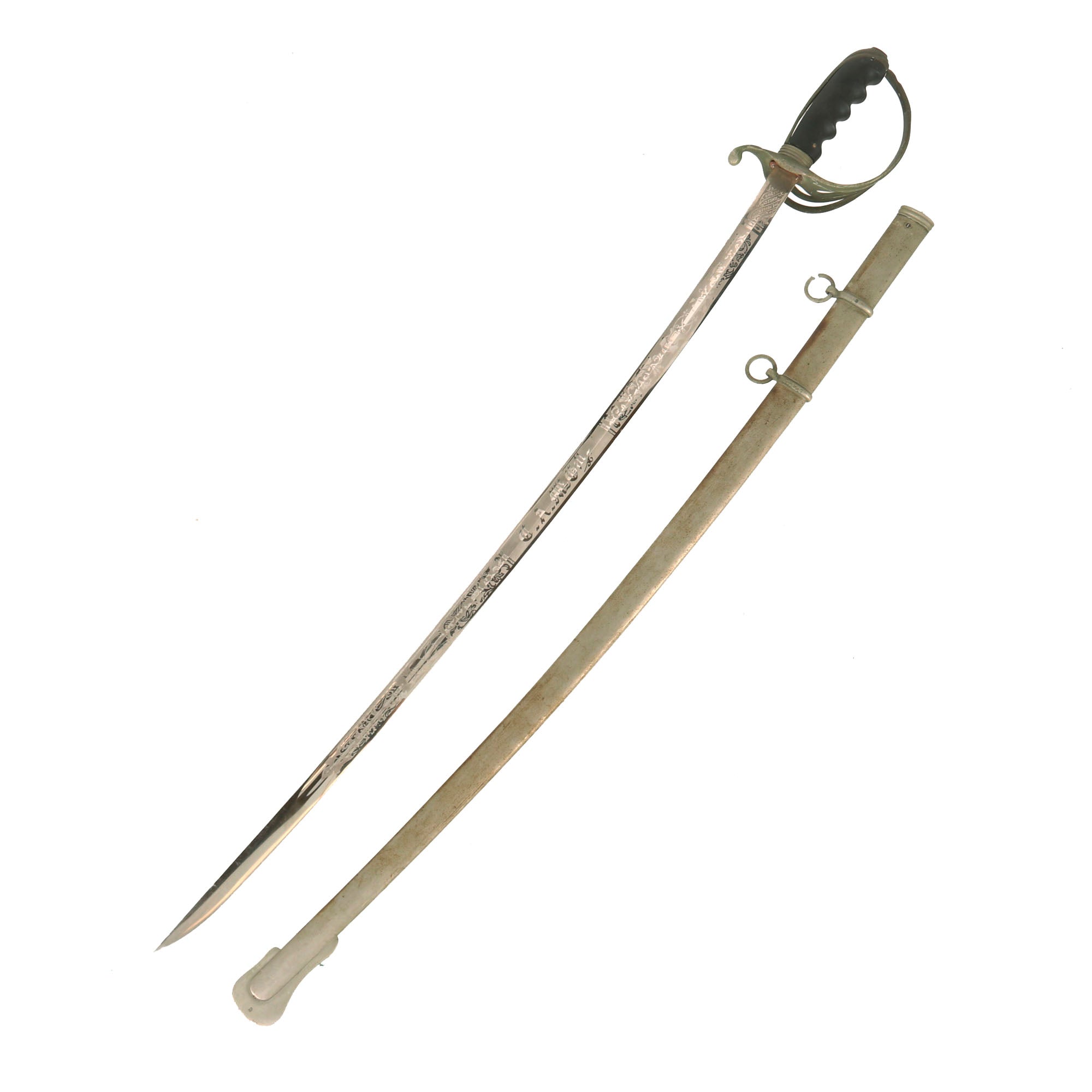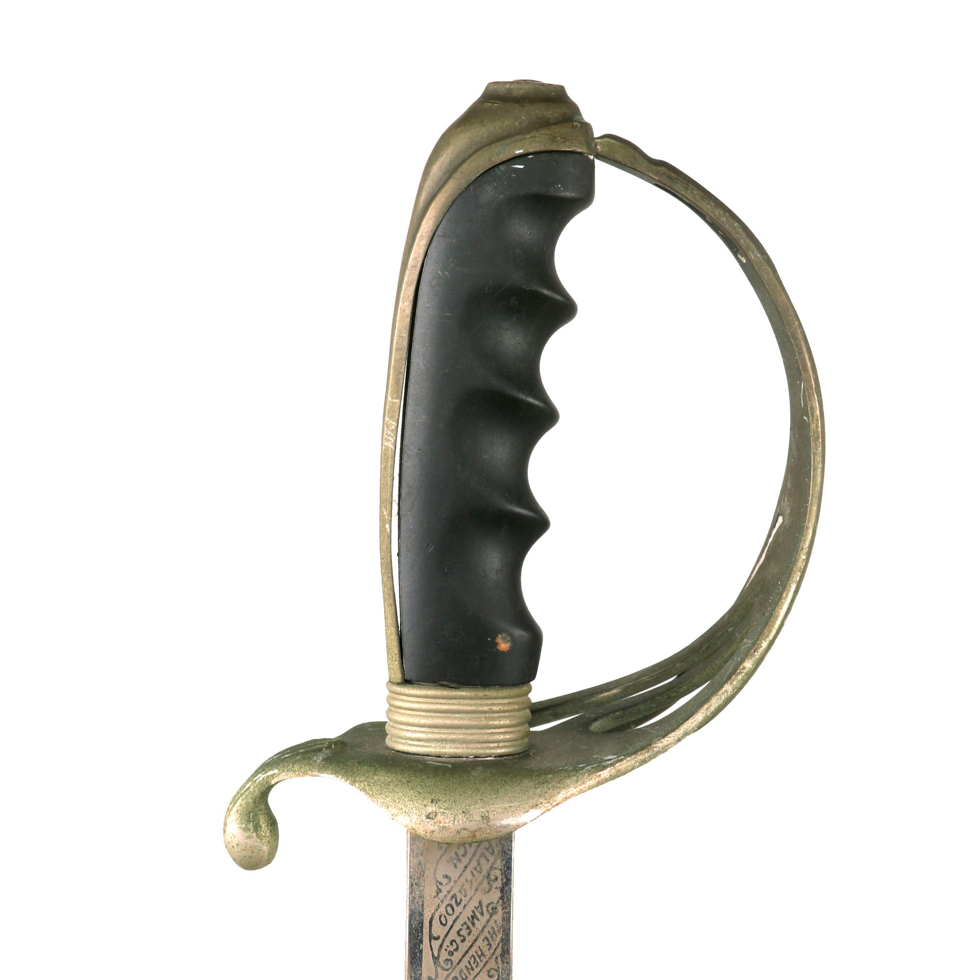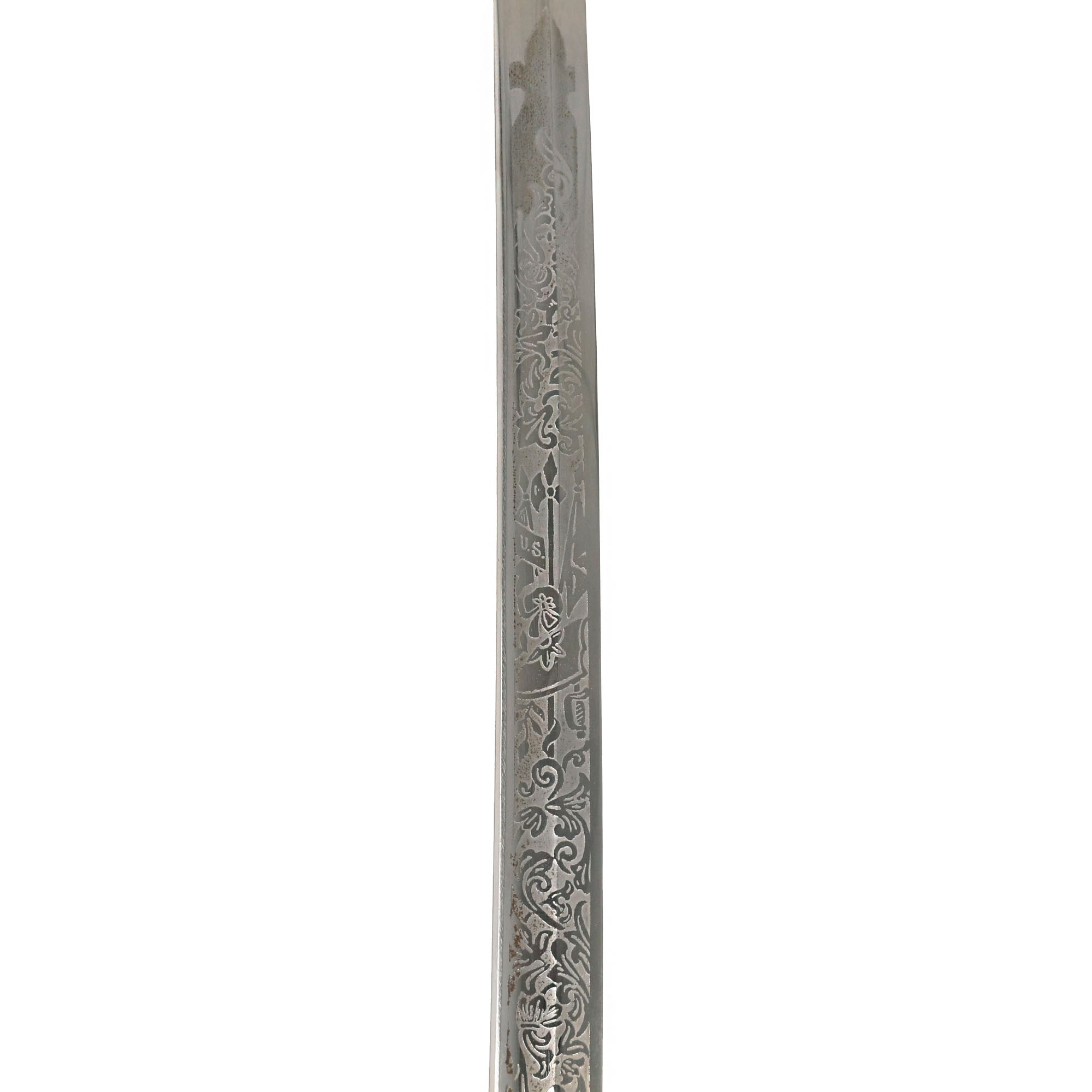 Original Item: Only One Available. The Model 1902 Army Officers' Saber is the current sword used by officers of the United States Army. The official nomenclature for the current regulation U.S. Army saber is “saber for all officers, Model 1902”. It was adopted on July 17, 1902 by authority of General Order No. 81. The M1902 saber was authorized for all officers, both infantry and cavalry, with the exception of Chaplains. The lightly curved blade measures between 30-34 inches long with weights initially specified by the U.S. Army to be between 20.2 and 22.8 ounces (573 to 647 grams) and a point of balance of 3.25 inches from the hilt as specified for infantry sabers. This example is named on the blade to C.A. McGill.