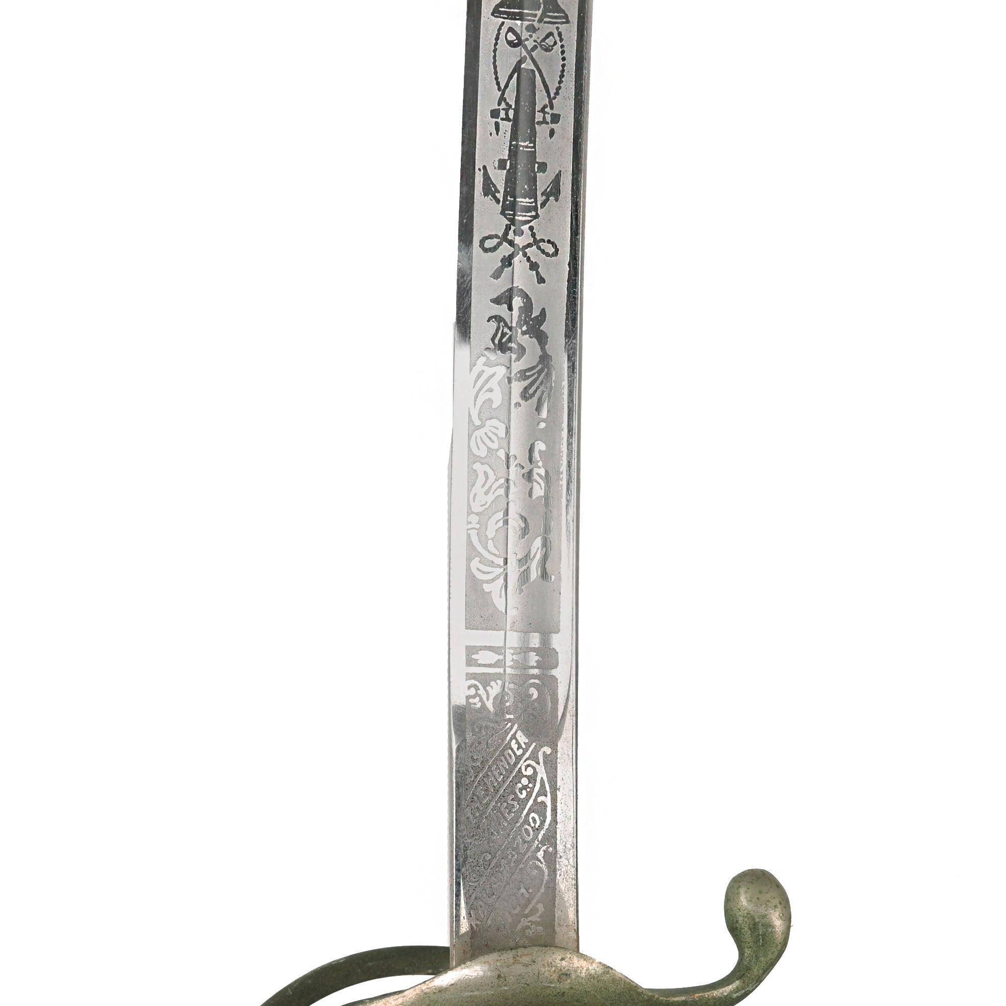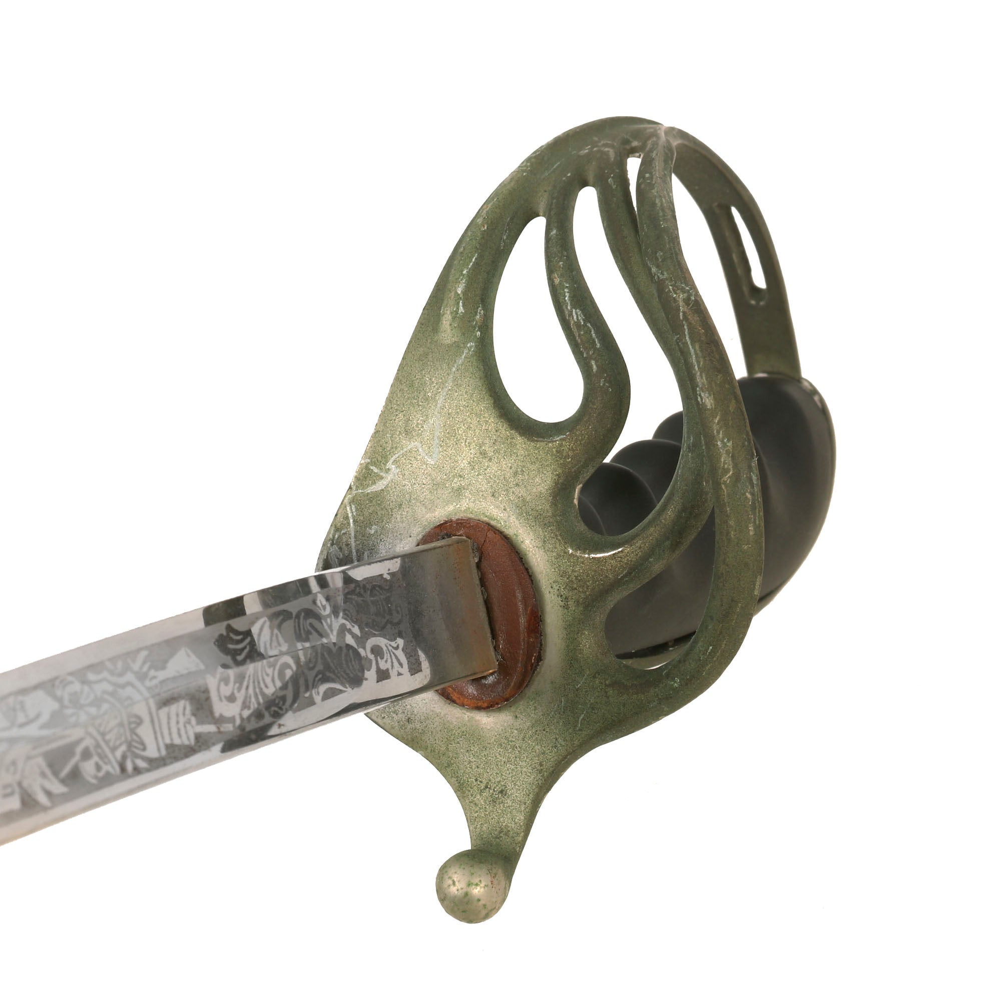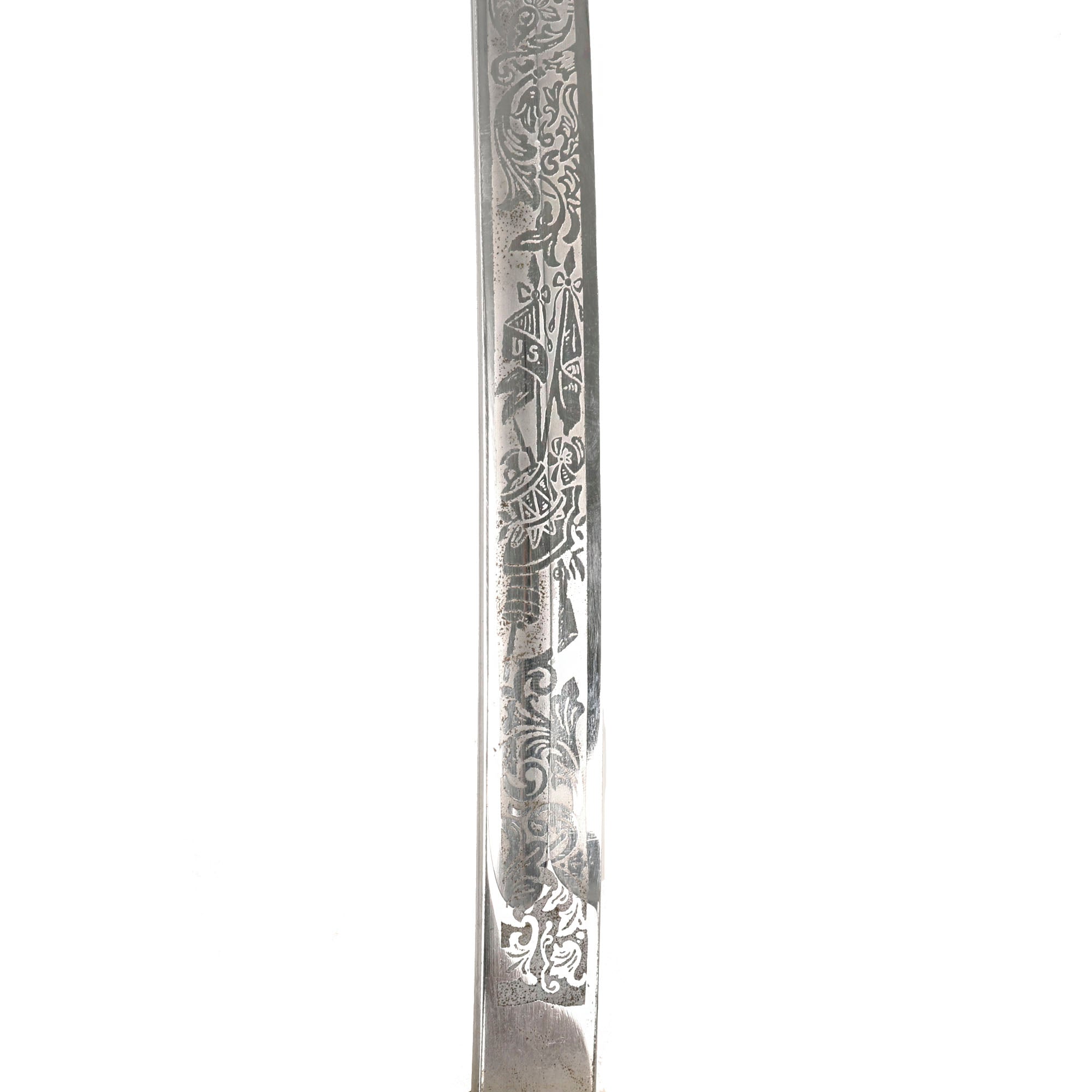 This fine example looks to be from the early 20th century, possibly WWI era, and is in very nice condition. As with most, it is fully nickel plated, with a triple-etched slightly curved blade, and a nickel plated steel scabbard. The etching on the blade shows the standard heraldry of the U.S. Army with a cannon and various stands of arms, as well as a Continental soldier.