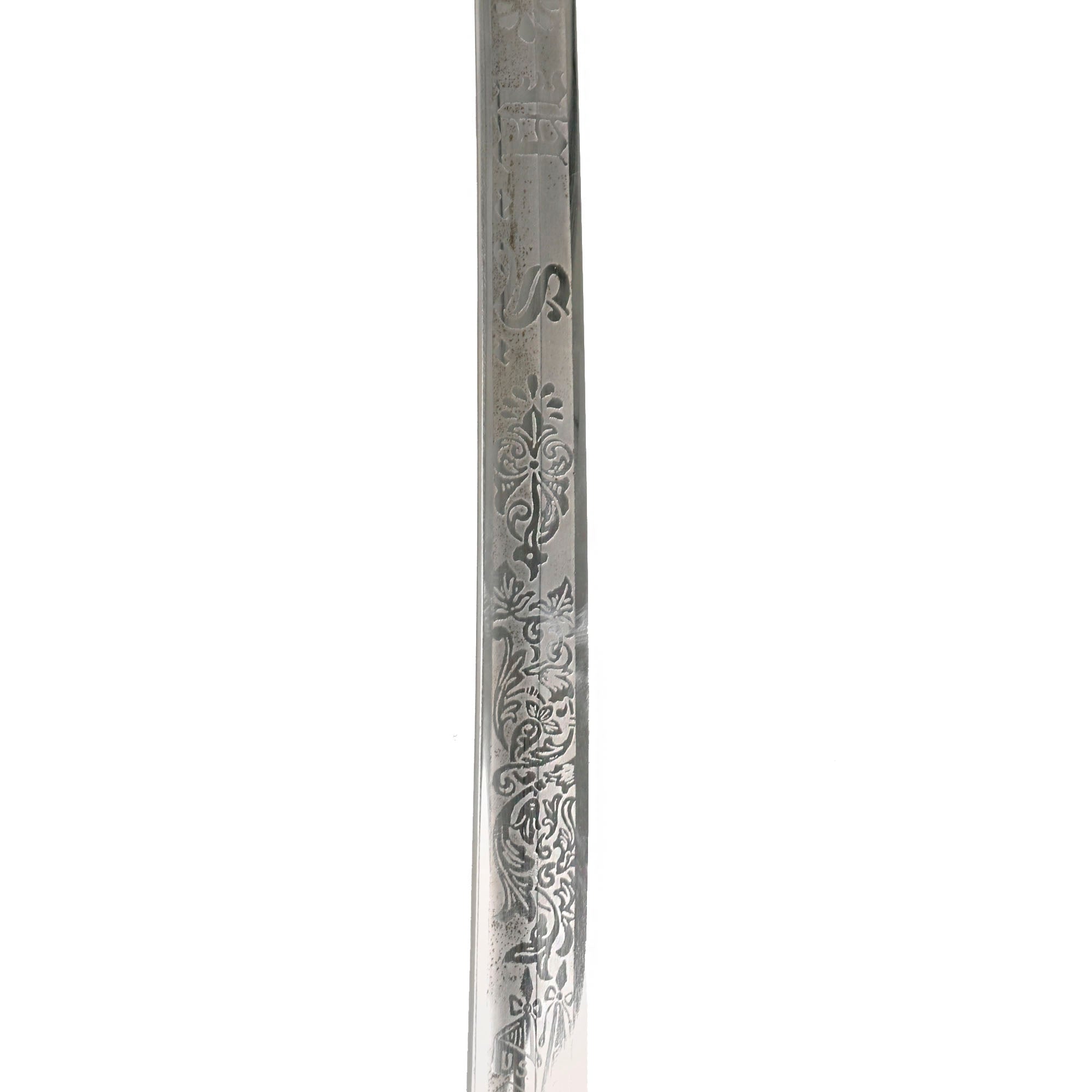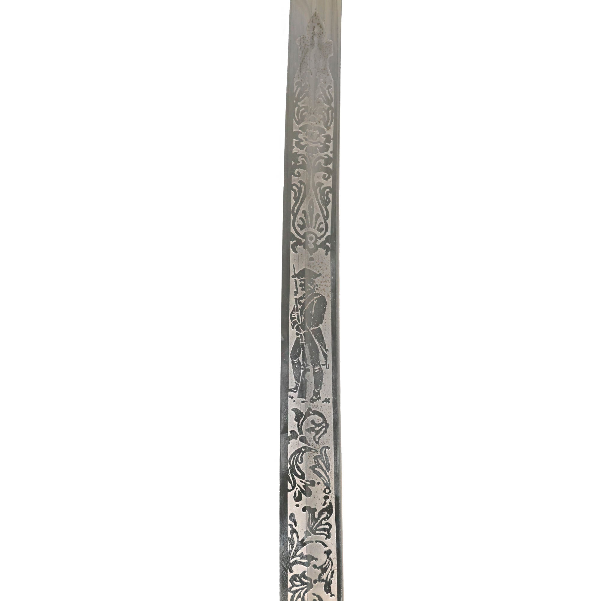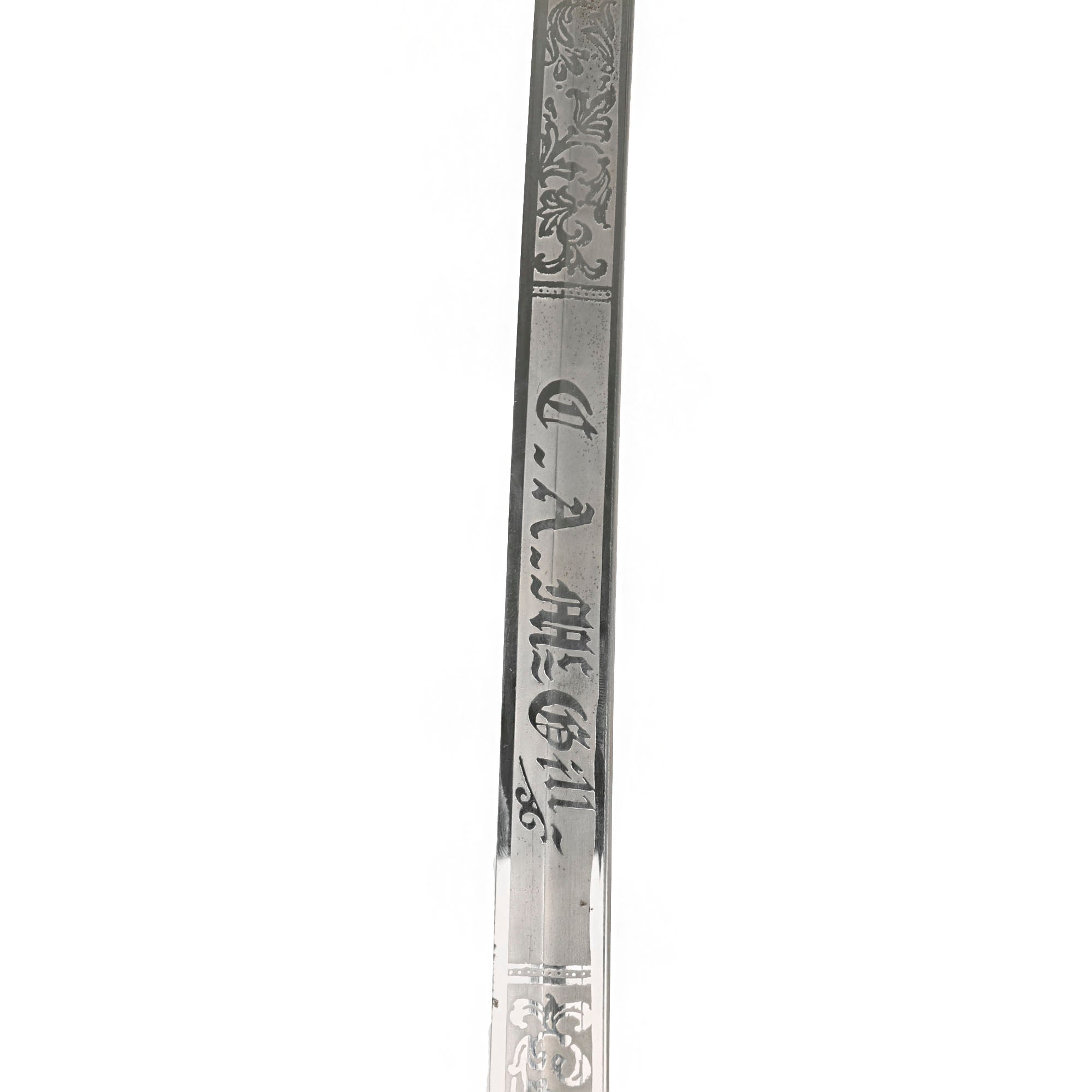 There is a large panel on one side where the officer’s name is etched C.A. McGill. Due to the common last name, we have been unable to identify this officer. Should be a great research project! Condition is very good, though there is some oxidation and wear to the nickel plate, which has started to bubble up and flake on the scabbard. There is also some wear through on the hilt, which has minor movement. The leather blade buffer is still present, and the blade is stamped GERMANY.