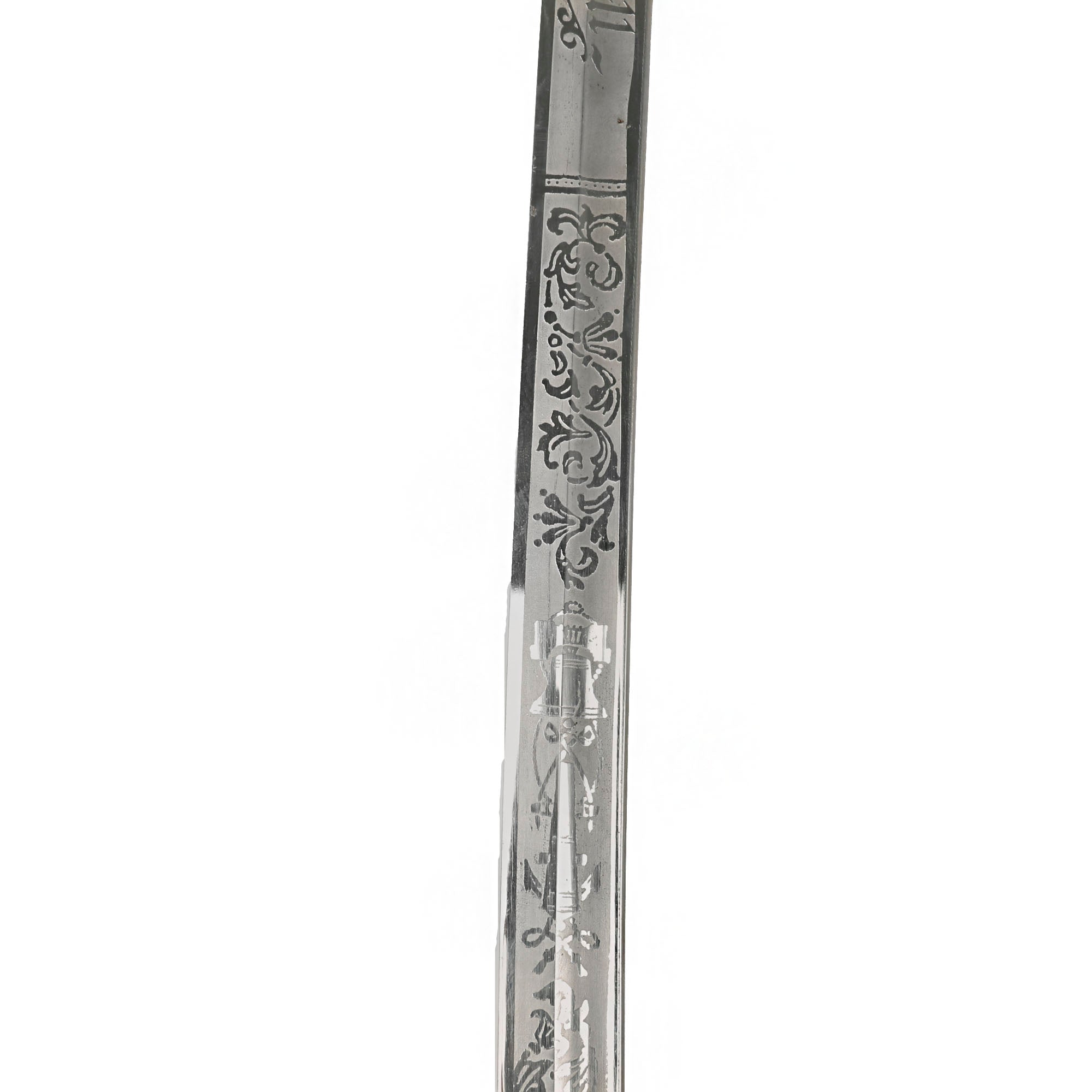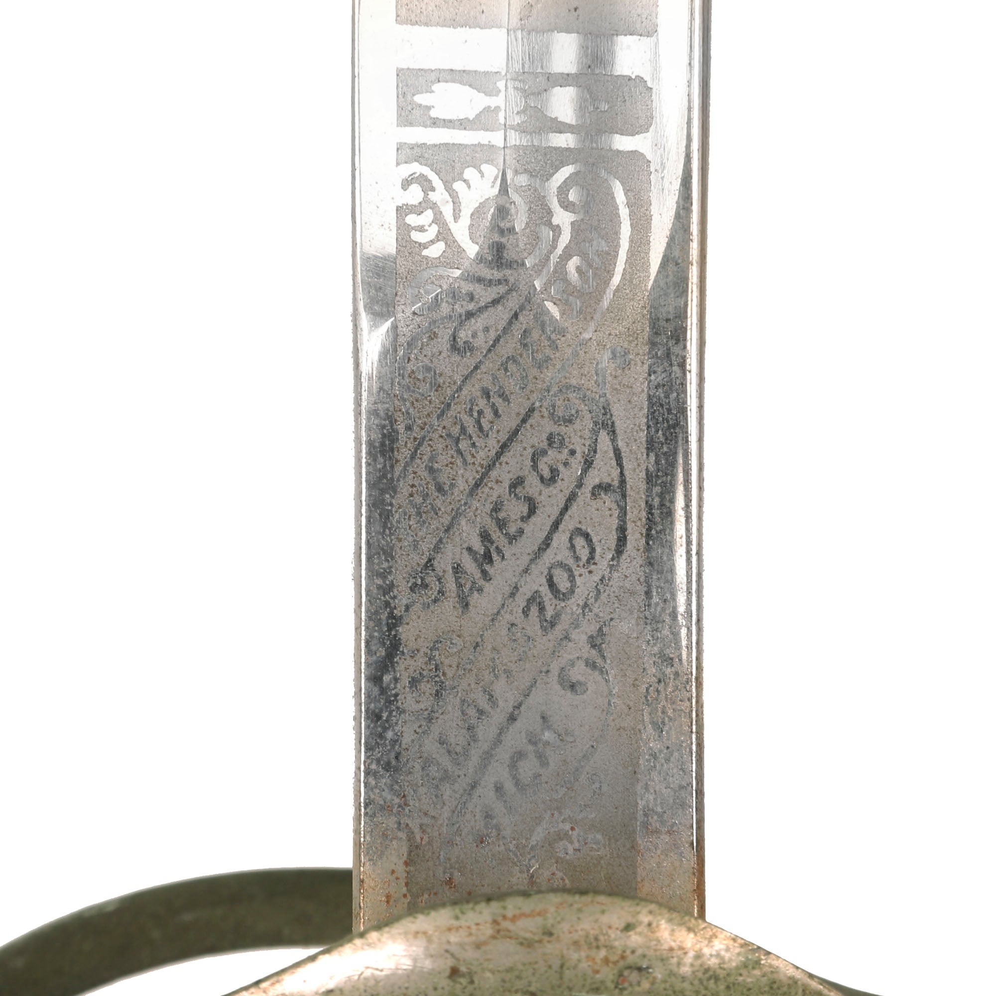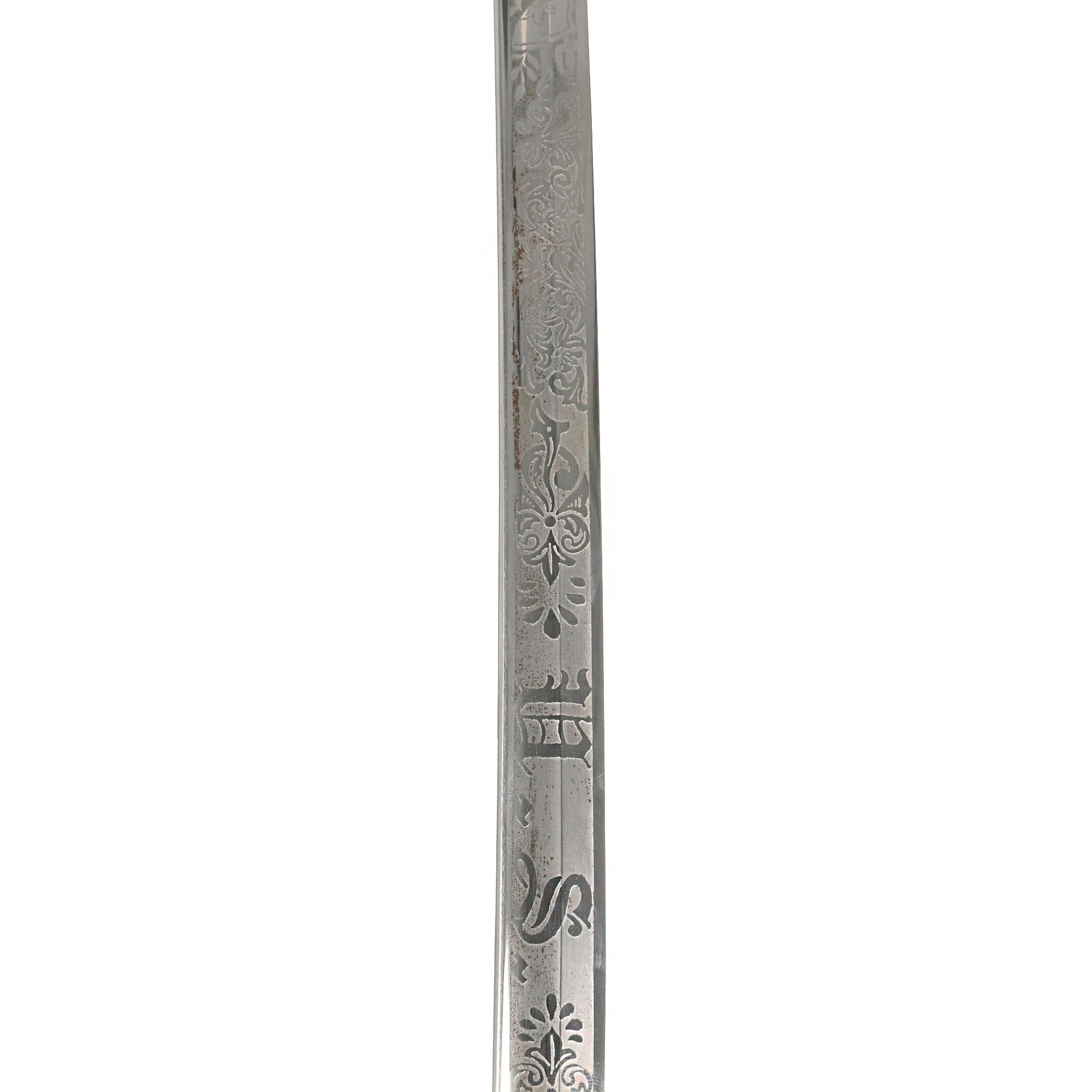 There is a large panel on one side where the officer’s name is etched C.A. McGill. Due to the common last name, we have been unable to identify this officer. Should be a great research project! Condition is very good, though there is some oxidation and wear to the nickel plate, which has started to bubble up and flake on the scabbard. There is also some wear through on the hilt, which has minor movement. The leather blade buffer is still present, and the blade is stamped GERMANY.