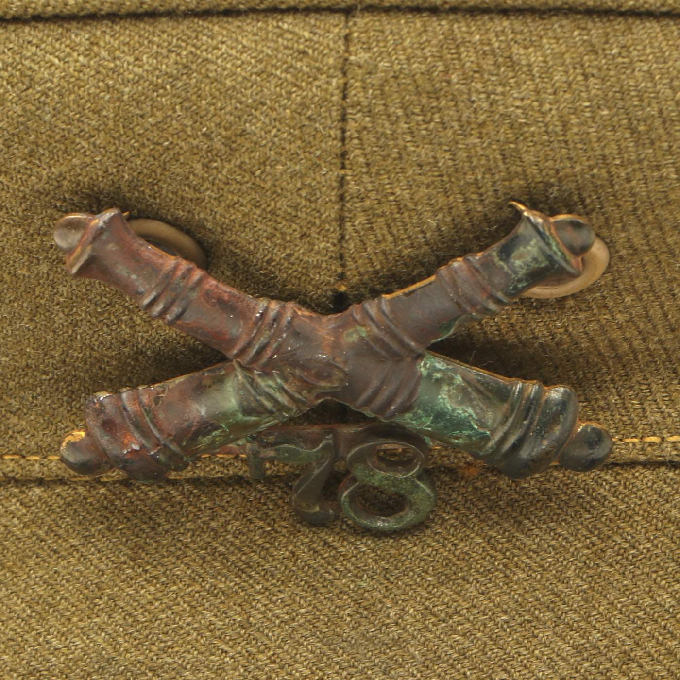 Original Item: Only One Available. This is an original WWI Era United States Army Officer visor cap with the mohair band removed, and the typical Eagle cap badge replaced with an artillery "Crossed Cannons" badge over number 78. The Cap features a black patent leather covered pressed paper or fiber visor, with a leather chin strap held in by plain split pins. The cap has a very nice condition leather liner, and the hat size is marked as a 7 1/8 (57cm) under the rear of the liner.