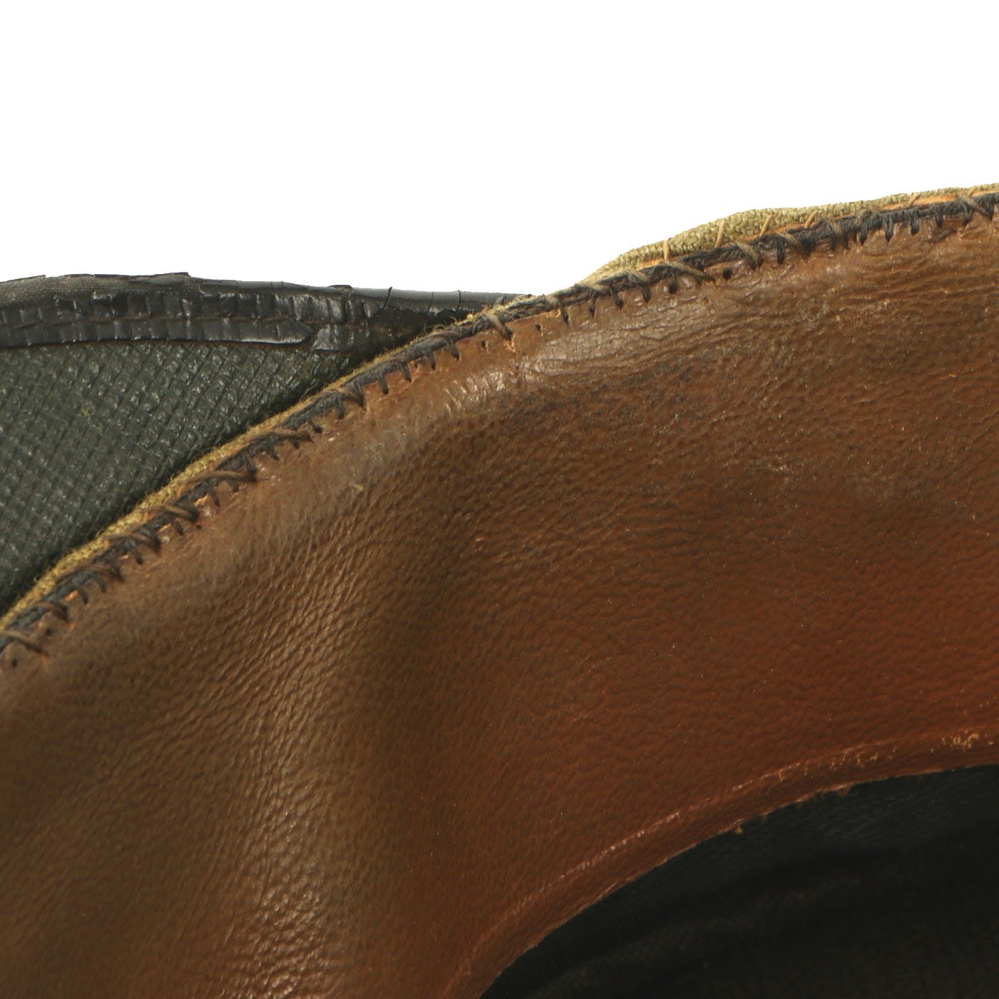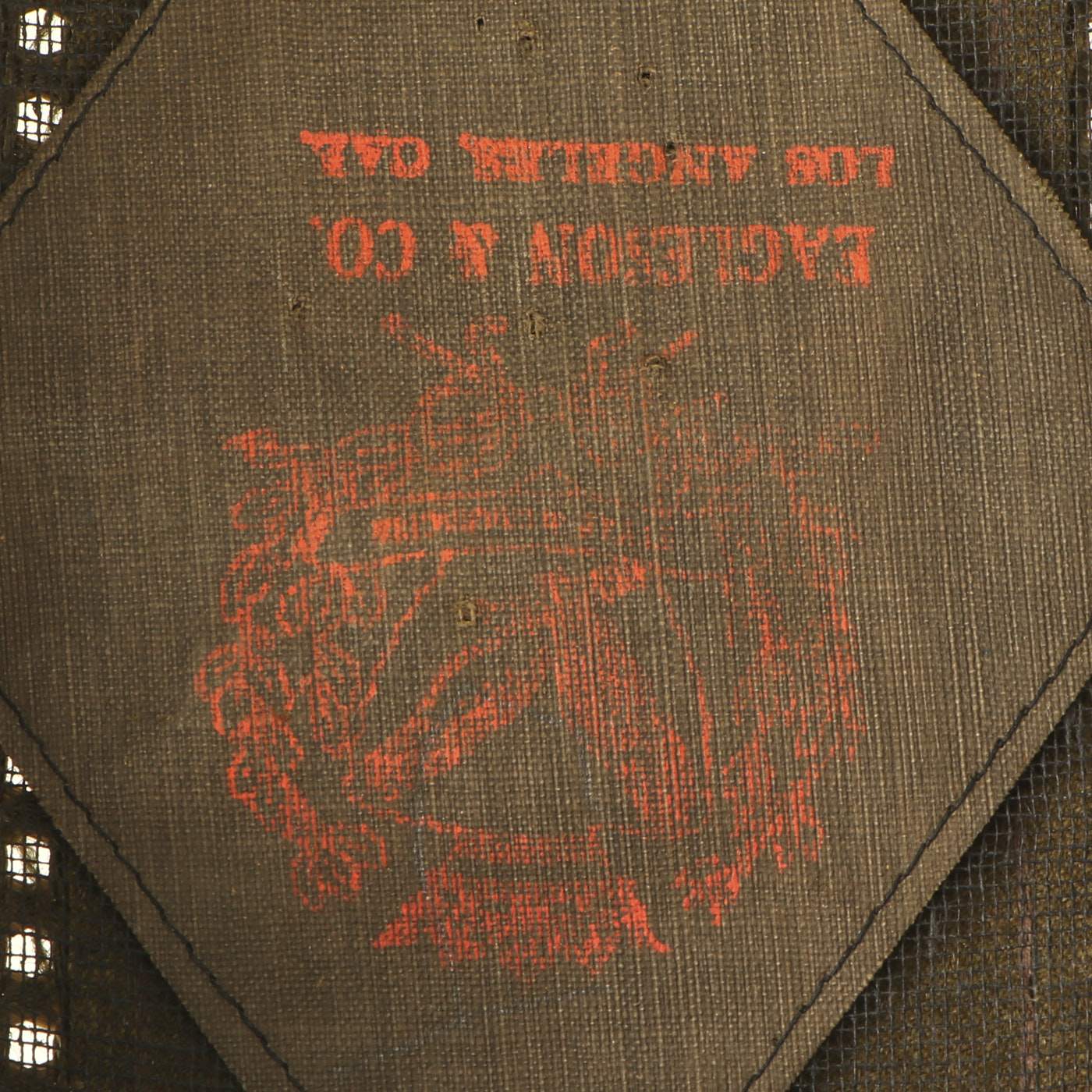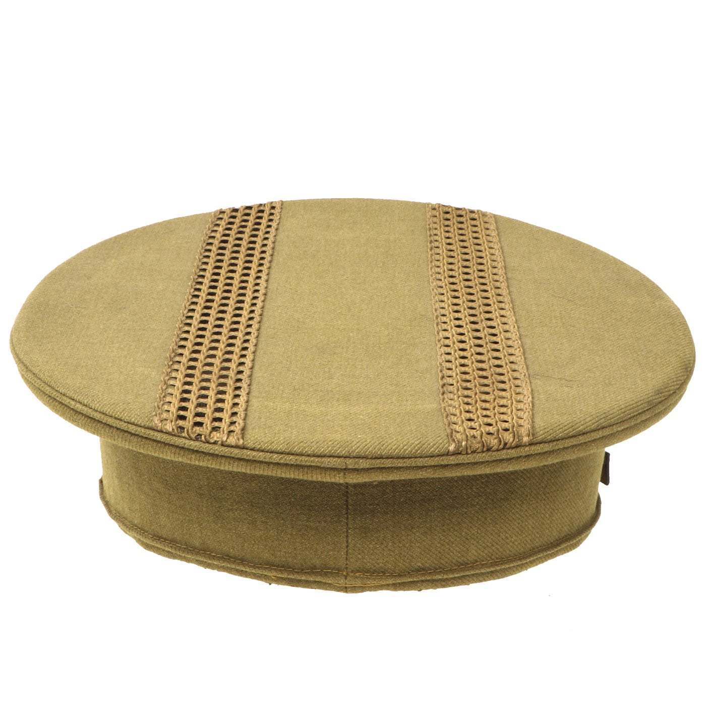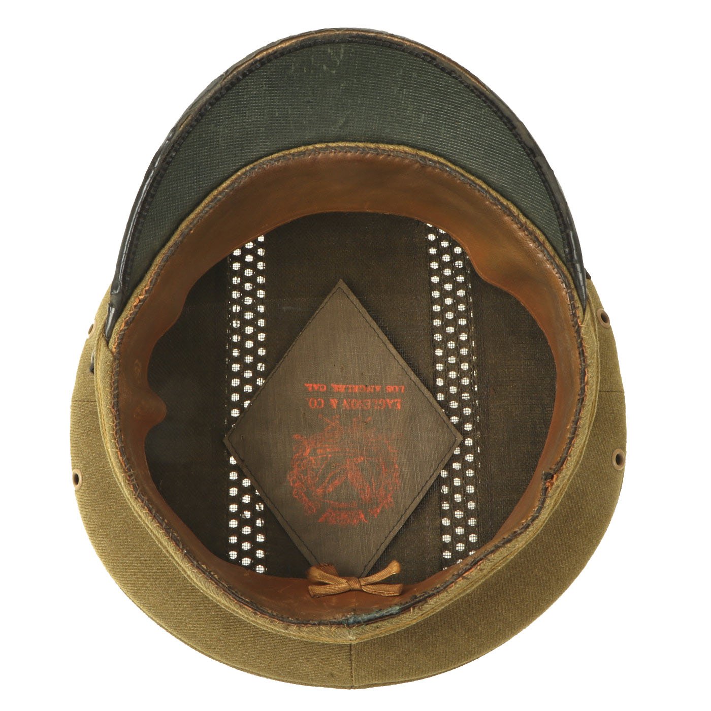 The cap looks to be a "warm weather" version, and has a gauze crown lining, with lovely stitched in embroidered ventilation strips on the outer crown. There is also still a maker label on the inside, indicating it was made by EAGLESON & CO. / LOS ANGELES CAL. THe cap is definitely well made, most likely bespoke, though it does not have the usual accoutrements we would expect on an officer's cap.