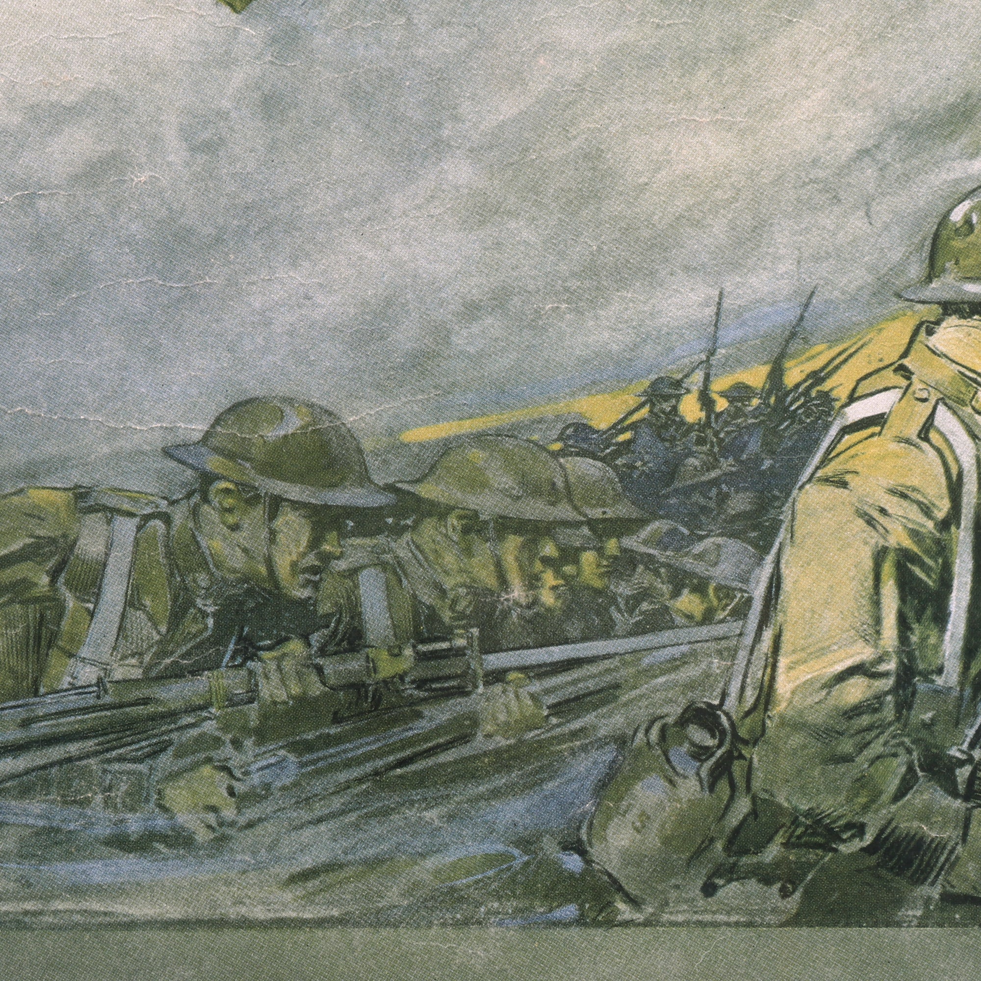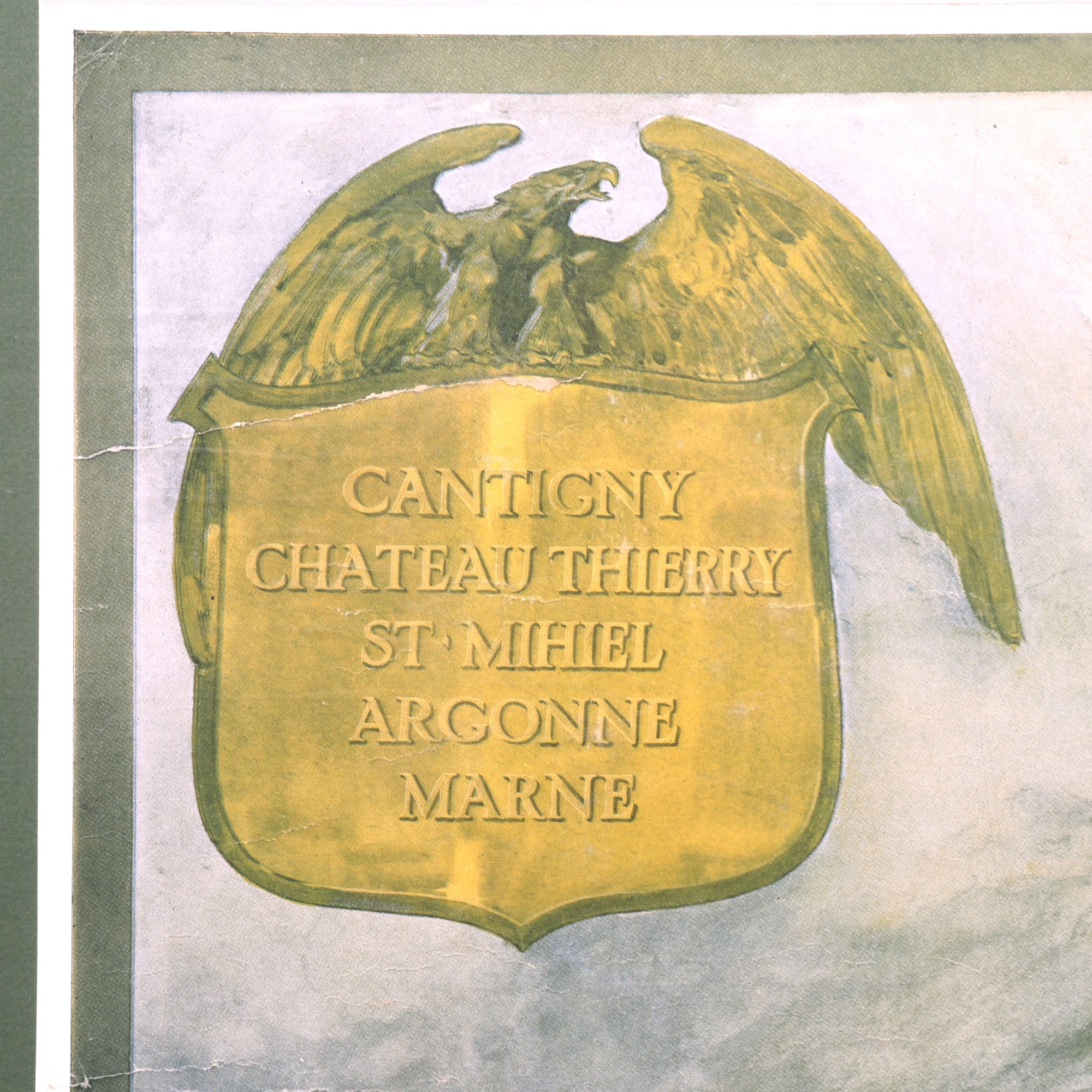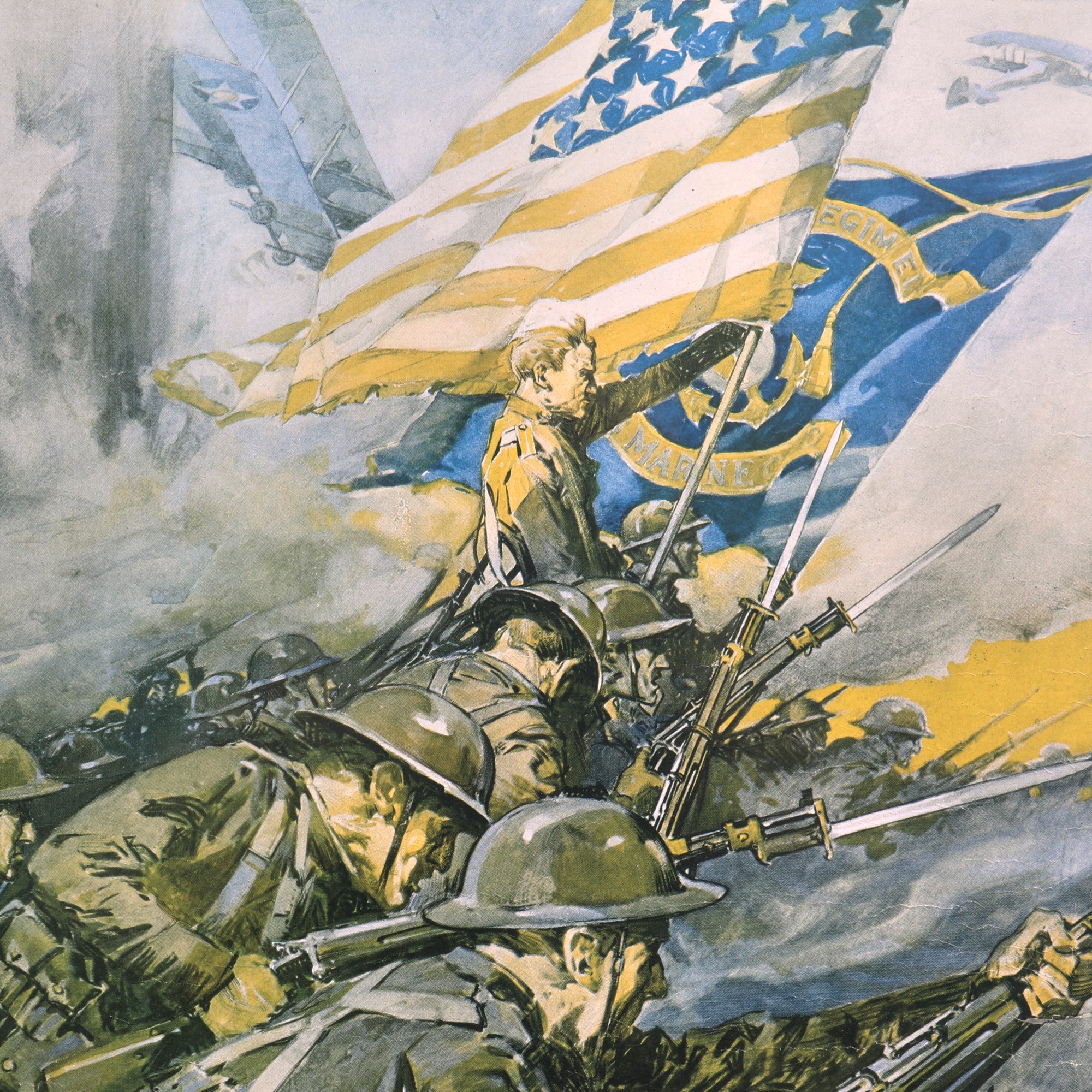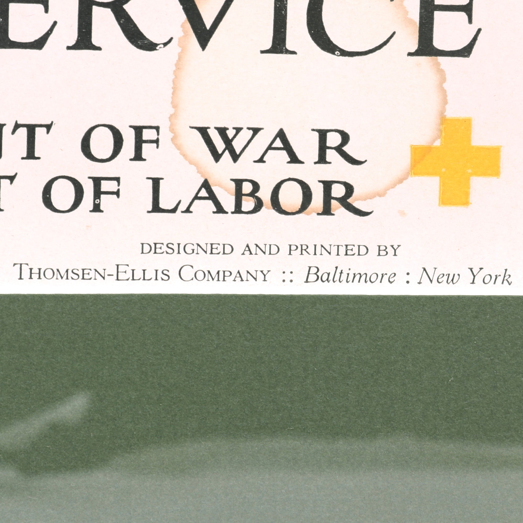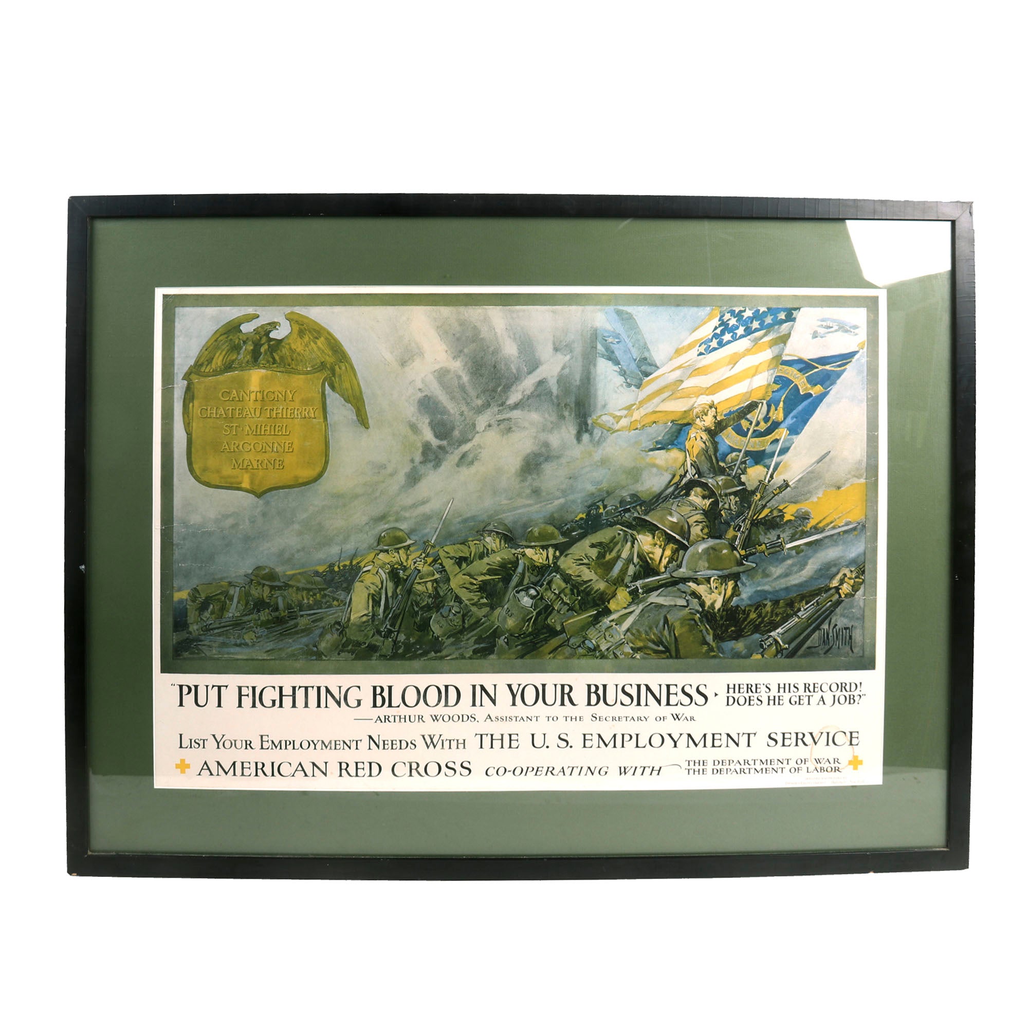 Original Item: Only One Available. This propaganda poster was issued jointly by the U.S. Employment Service and the Department of Labor. It's an eye-catching image that depicts a group of brave Marines charging into battle with flags flying high overhead. The poster also features a badge that commemorates the battles in which these soldiers participated, including Cantony, Chateau Thierry, St. Mihiel, Argonne, and Marne. The artwork was created by the talented artist Dan Smith and is part of a small collection of posters that aimed to help soldiers adjust to civilian life after the war.