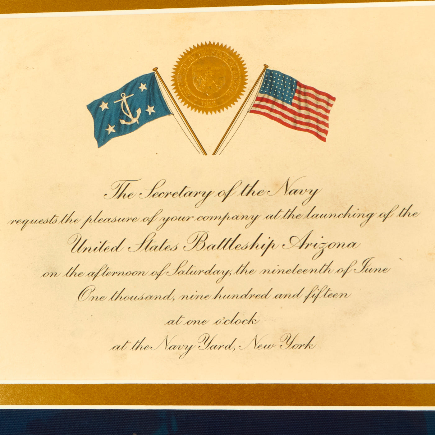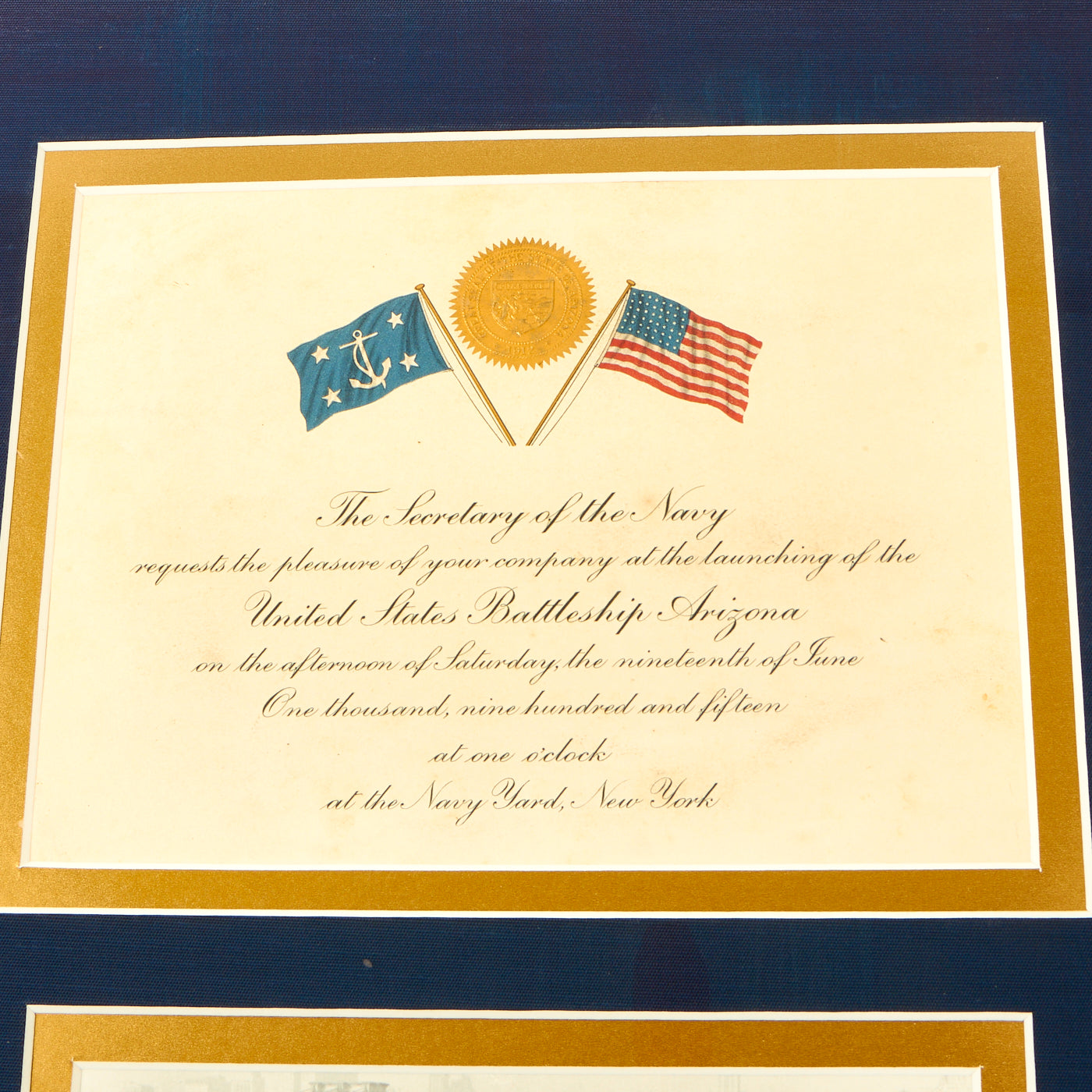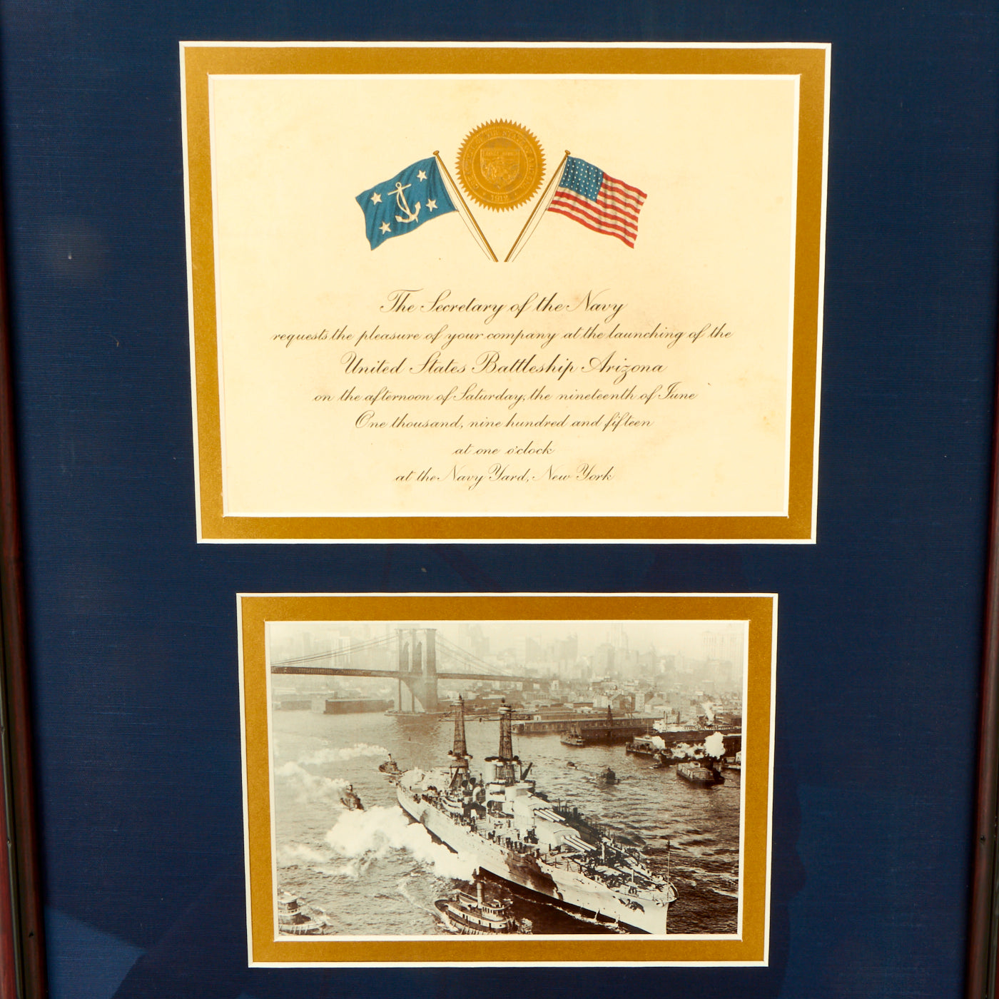 This incredible framed grouping consists of an original Launch Ceremony Invitation for Saturday June 19, 1915 at one o’clock at the New York Navy Yard, copy of an original photo and original Launch Medal.