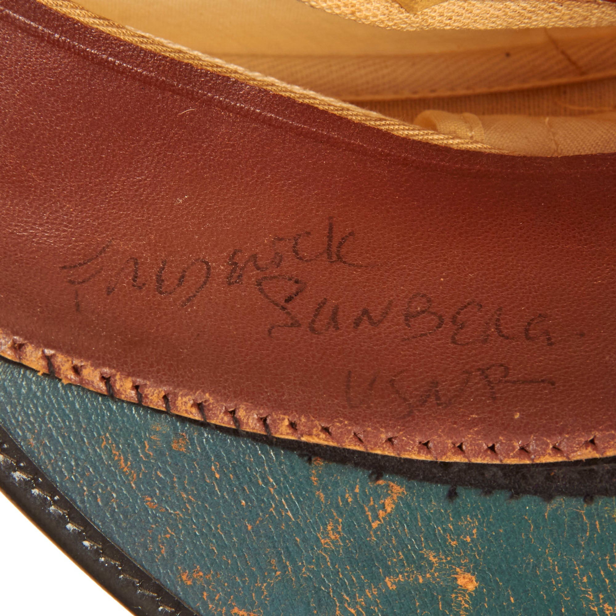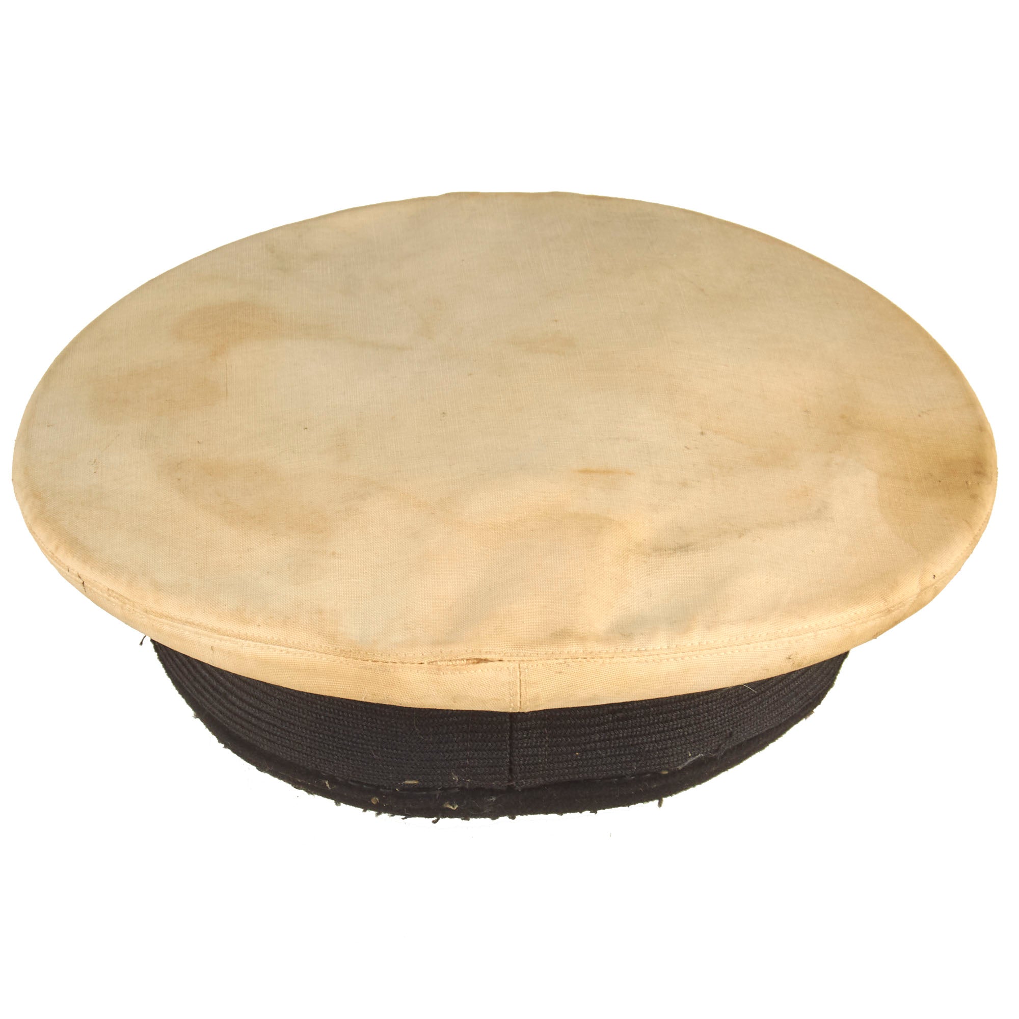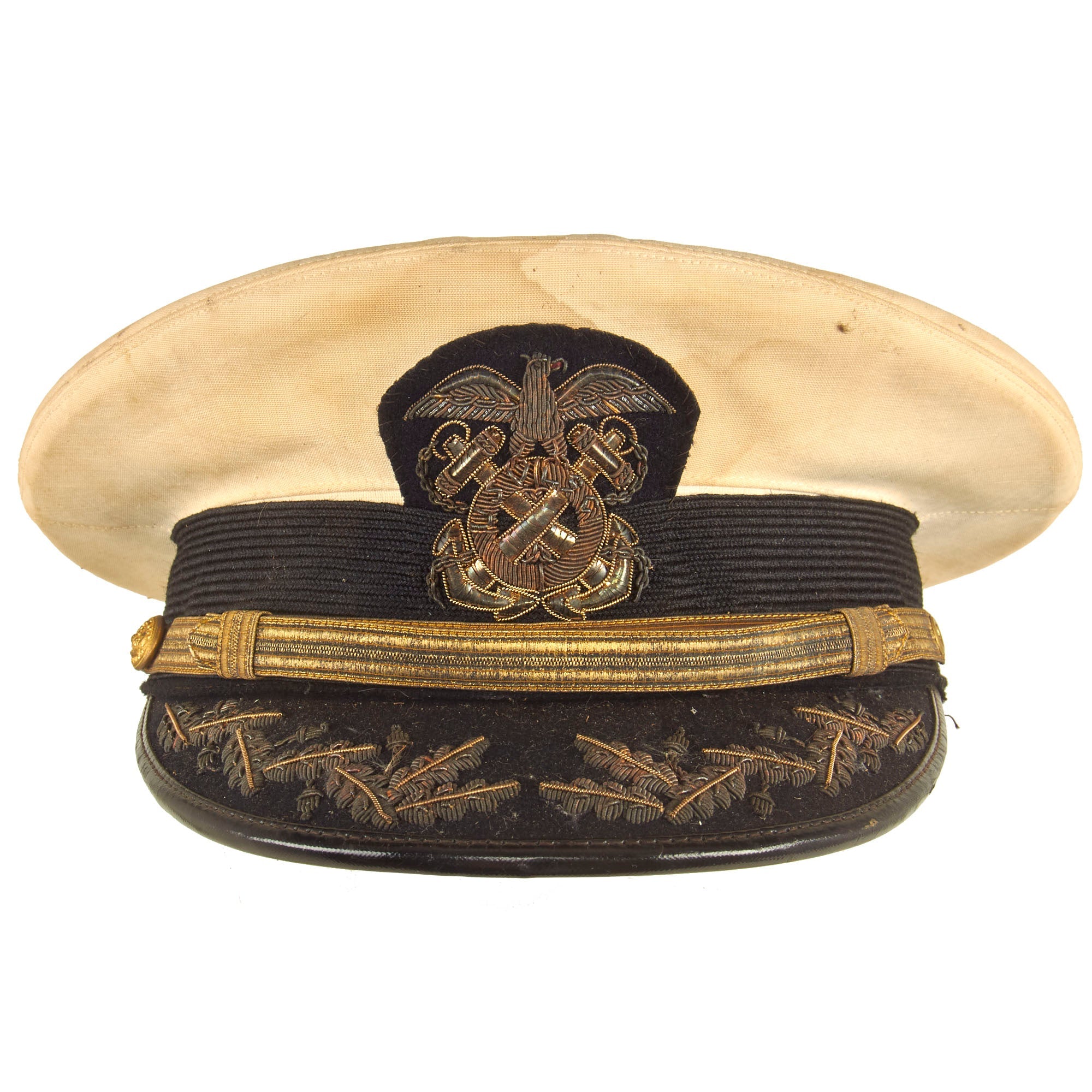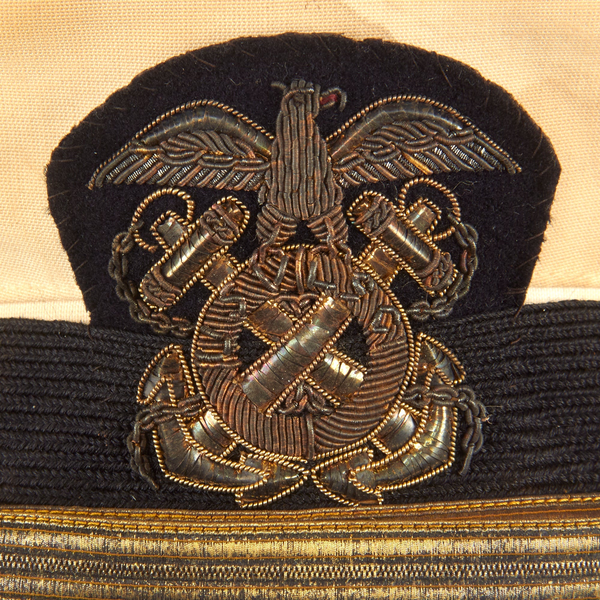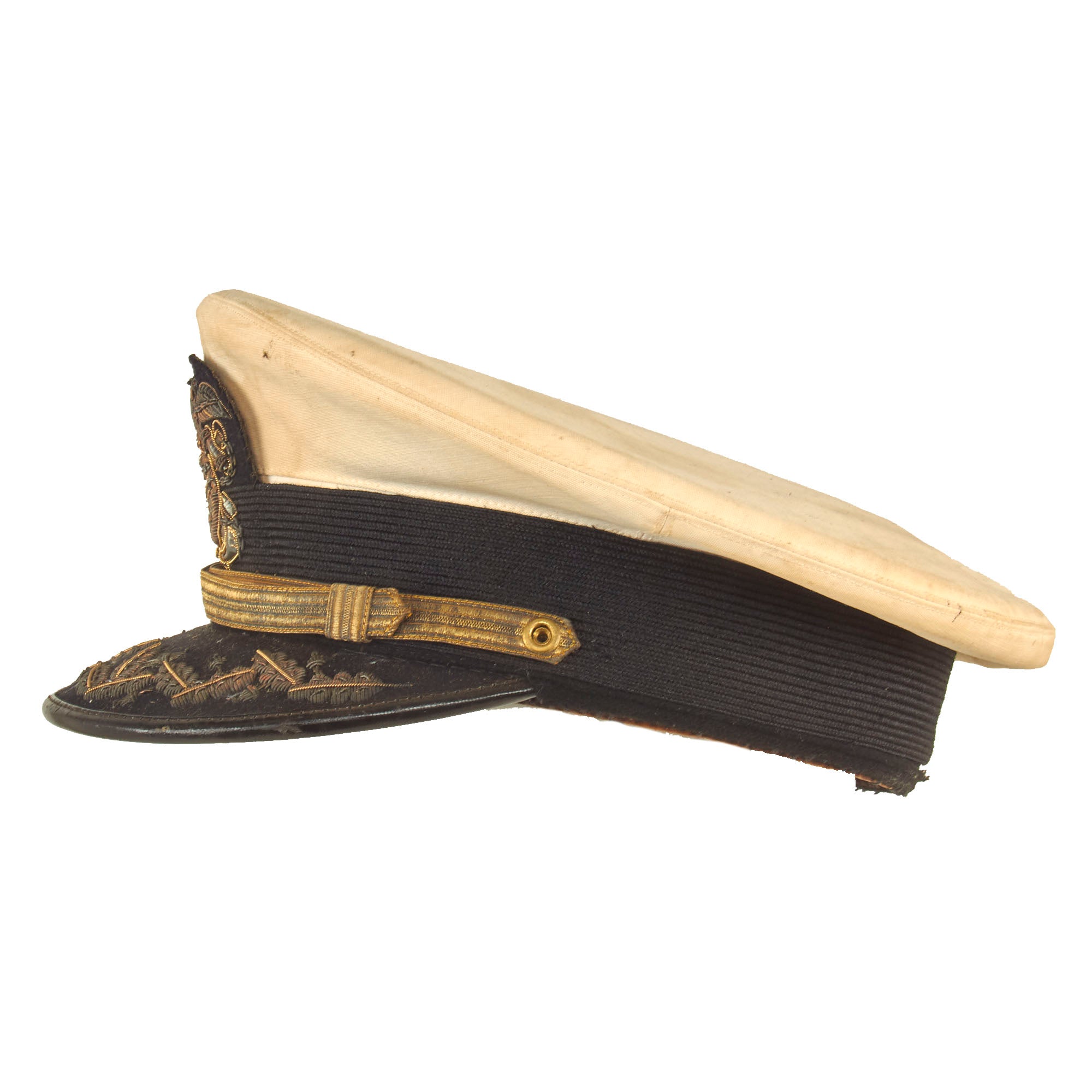 Overall condition is very good, with expected toning on the white exterior and some separation of the hat band and sweat band at the rear of the cap. Heavy high quality pressed leather visor with "scrambled egg" gilt bullion wire embroidery to the top.
