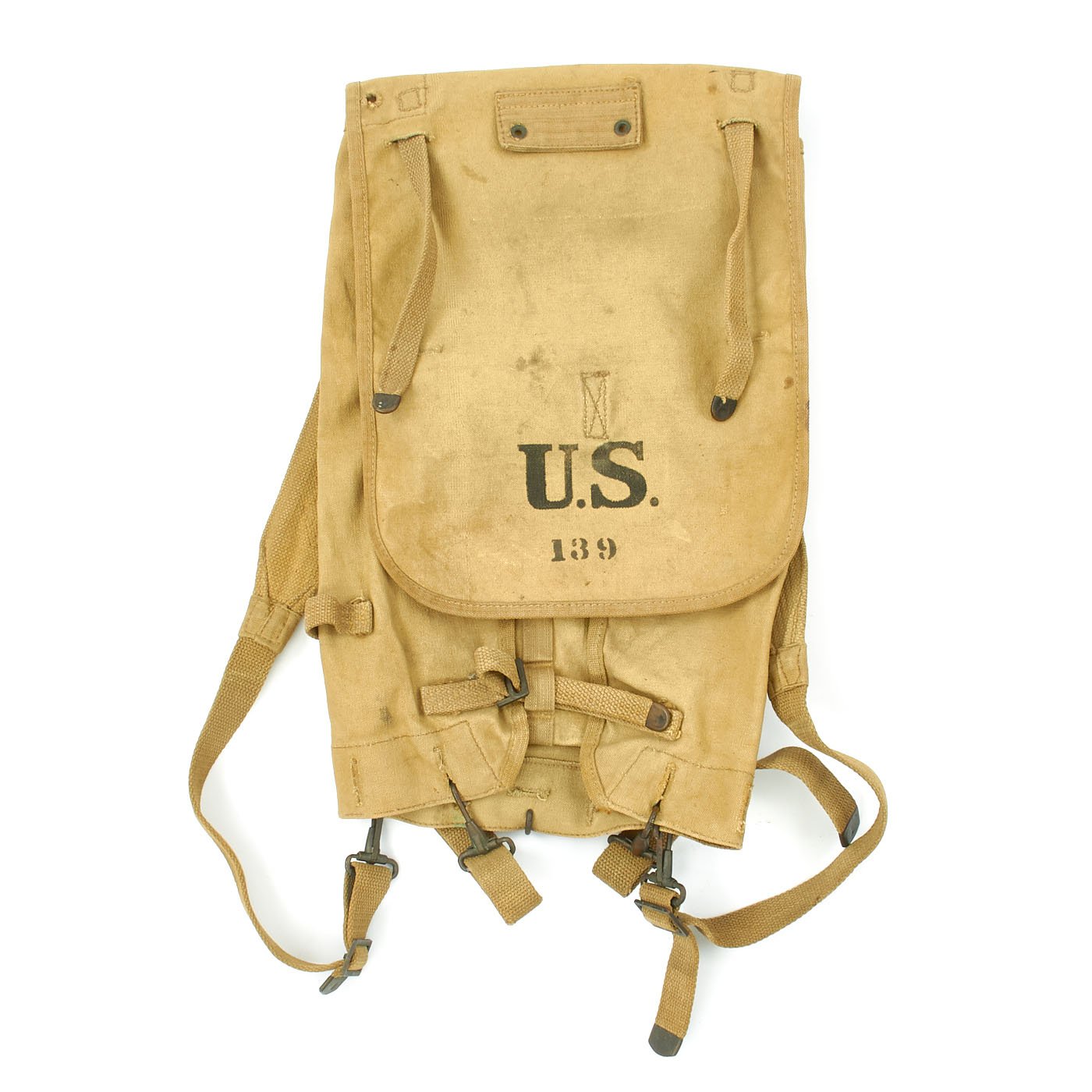 - Original WWI U.S. M1910 Haversack by LONG, dated 12 - 17. Standard issue pack designed at the turn of the century and used by all US Army and Marine Corps infantrymen throughout WWI and into WWII as the M1928. THis example is in very good condition, and is marked U.S. / 139 on the front, which is most likely a unit number. It does show wear do the canvas in areas, and there is a tear in one of the shoulder straps, but it's got a great worn in look.