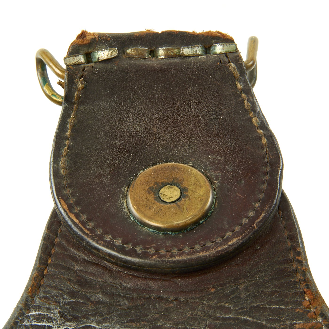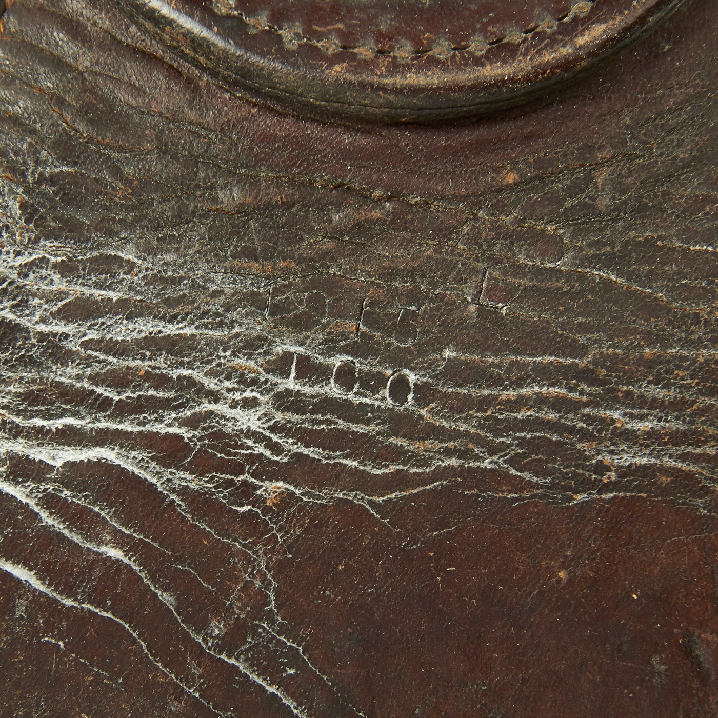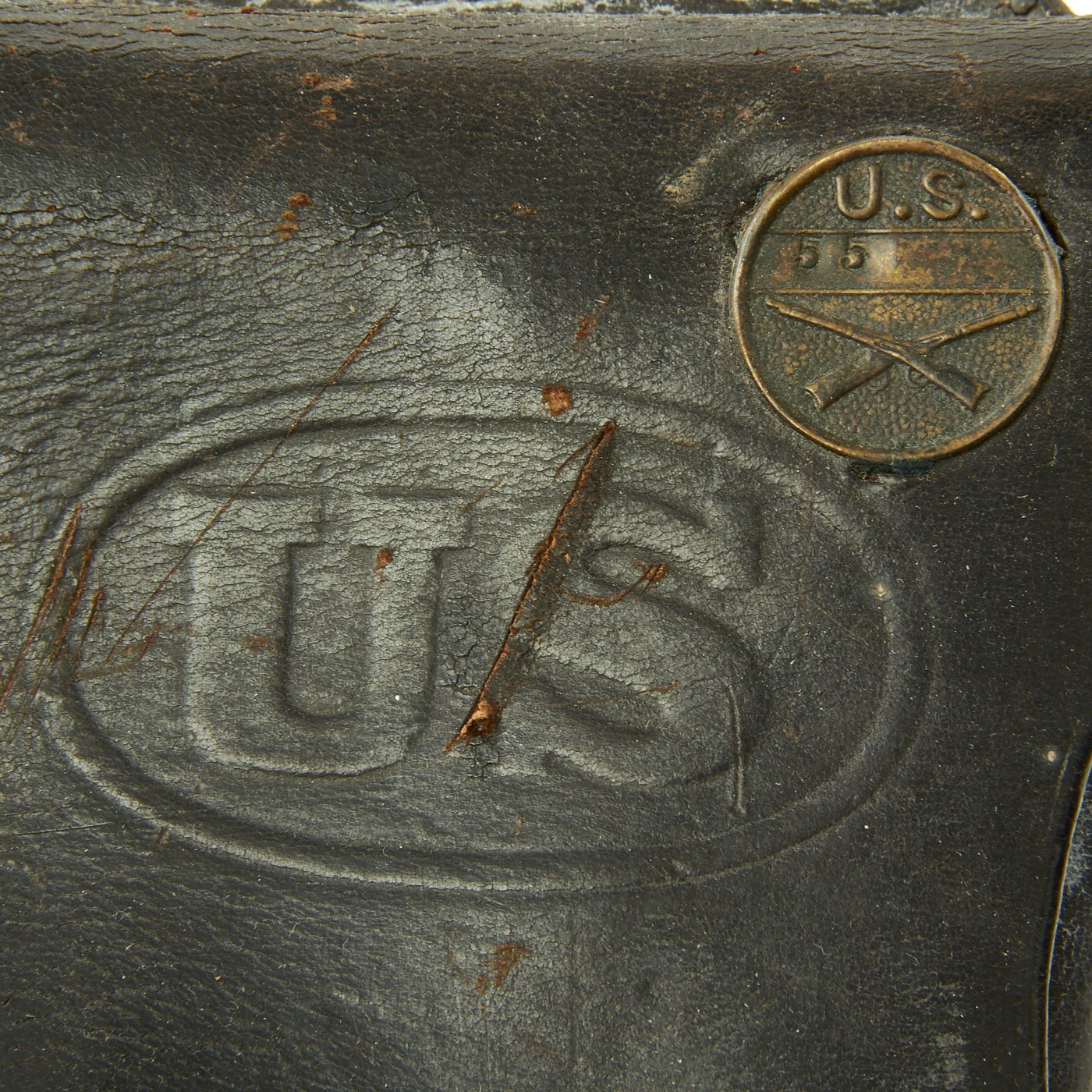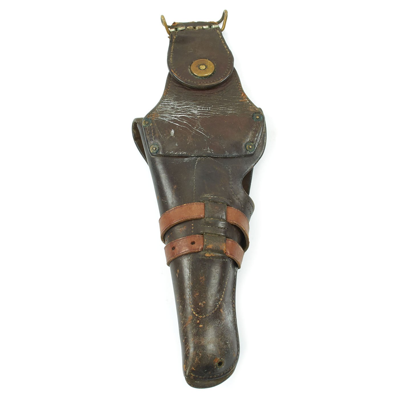 - Original U.S. WWI M1912 Swivel Holster for the .45 Colt 1911 Pistol, marked ROCK ISLAND / ARSENAL / 1915 / L.C.C. on the back. This was one of the standard pistol holsters going into the war, and this example certainly looks it was there. The leather has aged to a lovely dark brown, with intact stitching and service wear as shown. It has had a rivet repair where the belt hanger tore through the top of the loop, and the leg strap was replaced with a much shorter one. It has a nice U.S. brass marking disc on the flap, probably taken from a B.A.R. magazine bandolier.