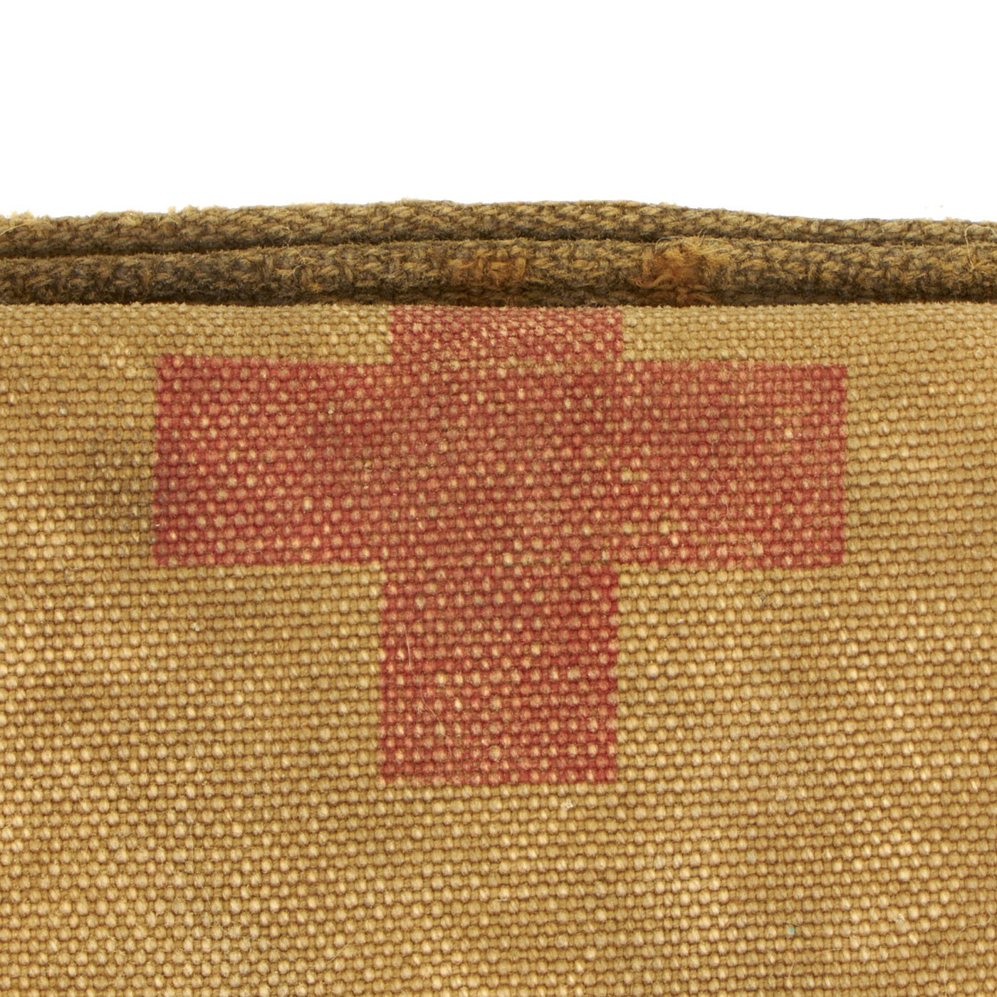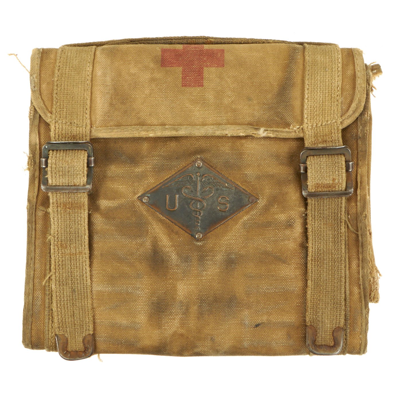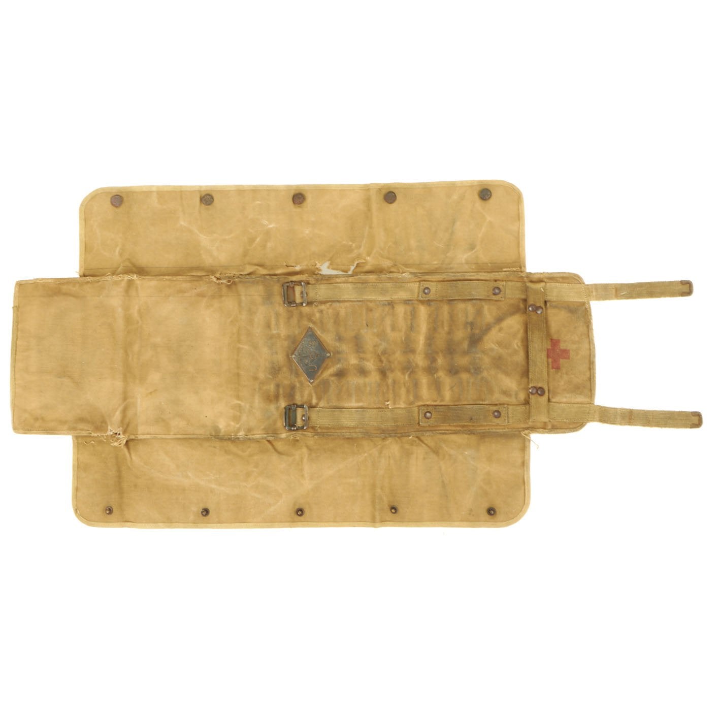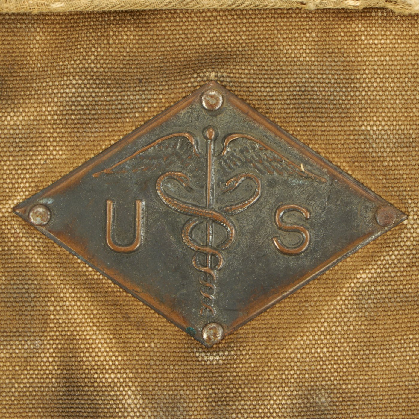 Original Items: Only One Available. This is a very nice service used condition WWI field medic Tool Roll Bag, with red "Geneva Cross" marked on the top, over a brass plaque with U S surrounding a "Caduceus", the symbol of medicine used in the United States. The rod is the symbol of the Greek God Hermes, and was used to symbolize that someone was a messenger, and was not to be attacked, as was true for medics carrying the wounded away. It is similar in design to the "Rod of Asclepius", the symbol of the Greek god of medicine and healing, Asclepius, and in the U.S. the two have become somewhat synonymous.