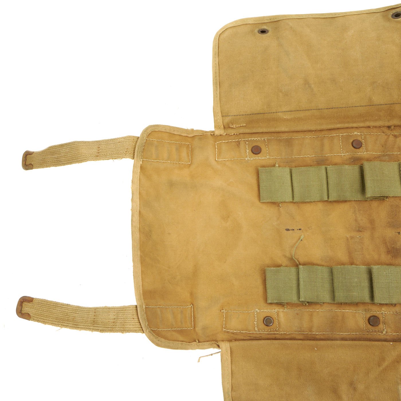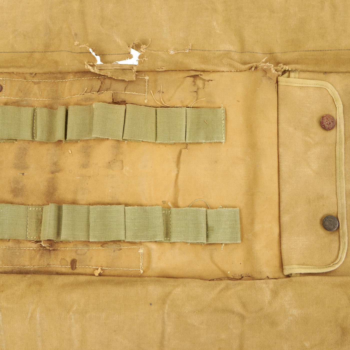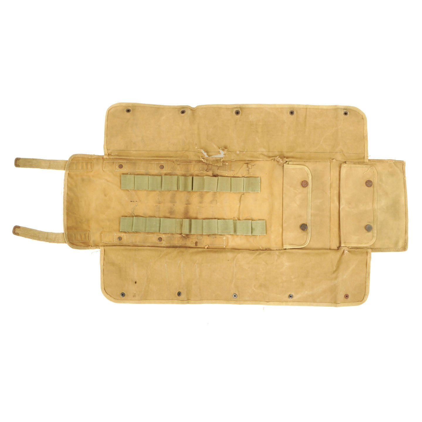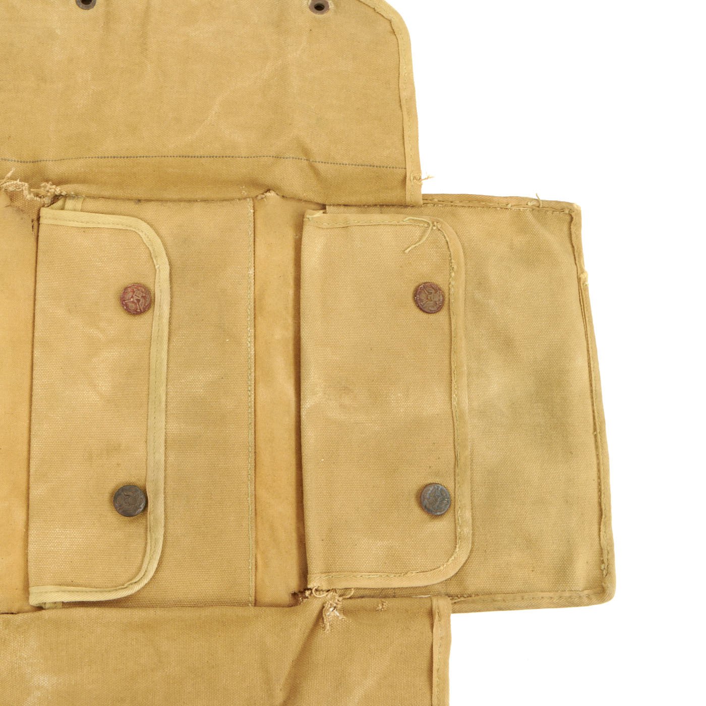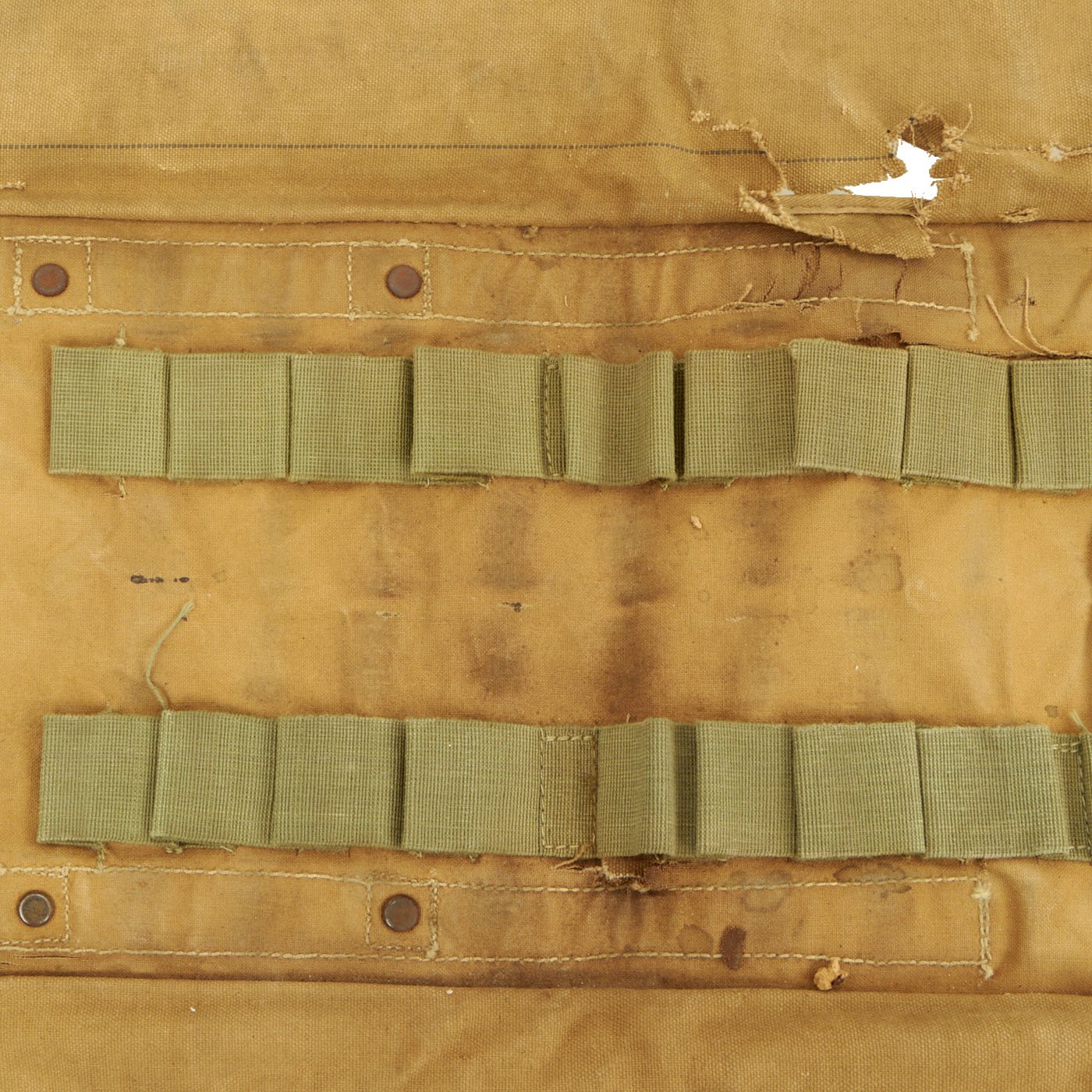 The tool roll unfolds to show many loops where clamps, knives, and other medic tools would be stored, and there are also some small pouches for bandages and other items. These were kept organized so that medics could quickly deploy the tools inside to stabilize the wounds before transporting the injured away. The case measures 8"W x 7"H x 2" when folded up.