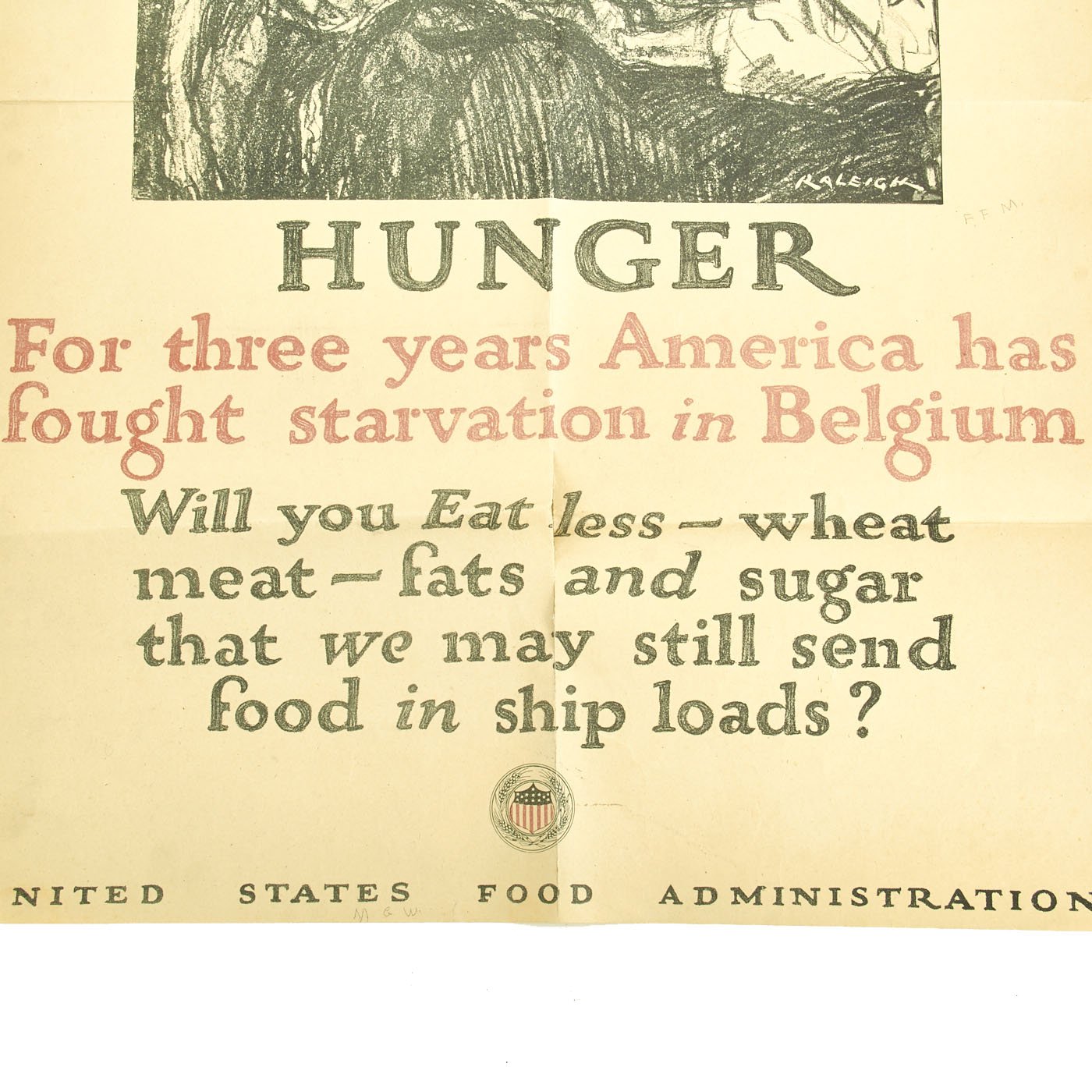 Original Item: Only One Available. Hunger For three years America has fought starvation in Belgium. Will you Eat less-wheat meat—fats and sugar that we may still send food in ship loads?”