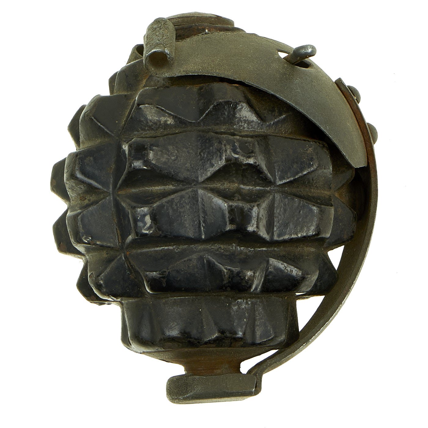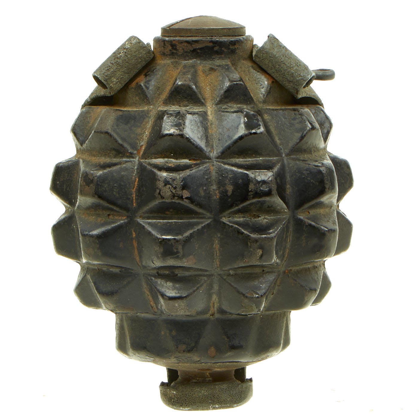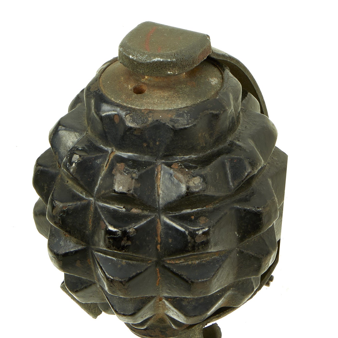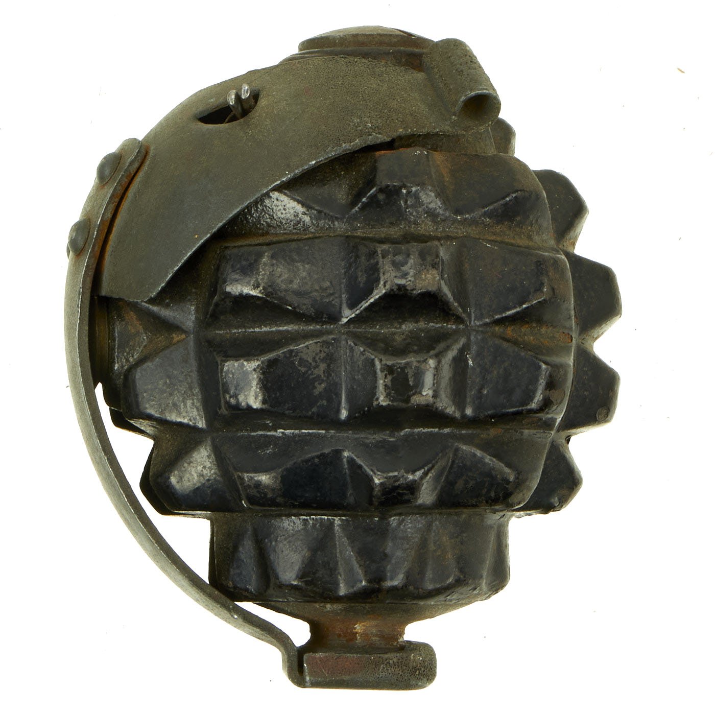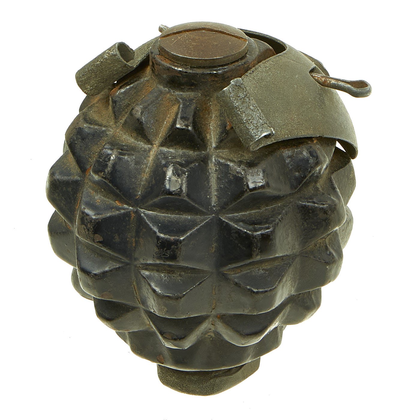 Original Item: Only One Available. One of the most sought after of the US early grenades is this excellent Shinkle. Per a respected grenade authority: “Shinkle Hand Grenade, Concussion Type, Experimental, dated Nov. 30, 1918." The grenade was the invention of Major Edward Marsh Shinkle who at the time was stationed at Frankford Arsenal in Philadelphia, Pennsylvania. His idea of an impact fuzed hand grenade was undertaken and prototypes were made and tested. About the time they were close to program completion word was received that the commanders of the AEF did not want an impact grenade, as the impact fuze would be ineffective in the damp, muddy conditions of Trench Warfare. Therefore, the program was halted and efforts shifted to the MK I grenade. Later in 1918 word was received that the AEF did want an impact grenade and production of the Shinkle was started again. The war ended before major production could be achieved though, and the grenade faded into history. In August of 1918, there were only 800 in the inventory. This particular grenade is in excellent condition, retaining most of its original black paint, and is complete with original spoon (which retains almost all of its original grey finish) and safety pin.