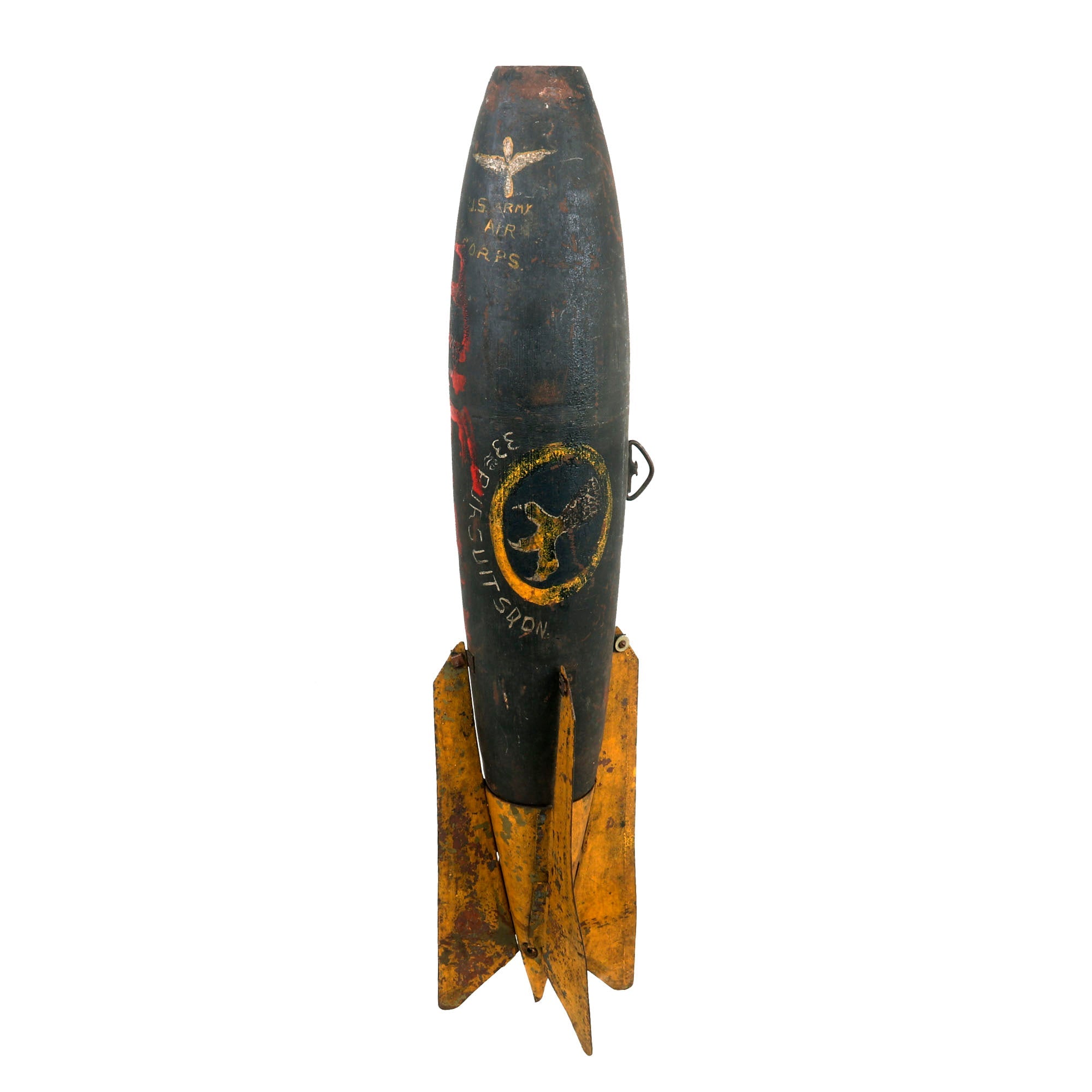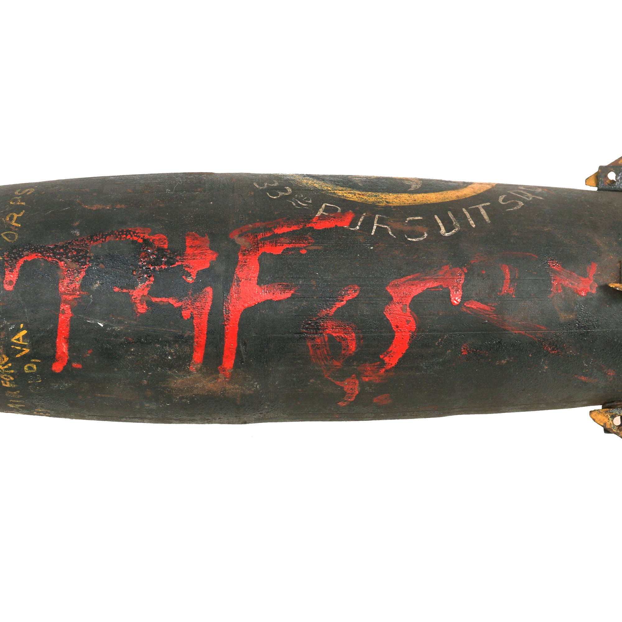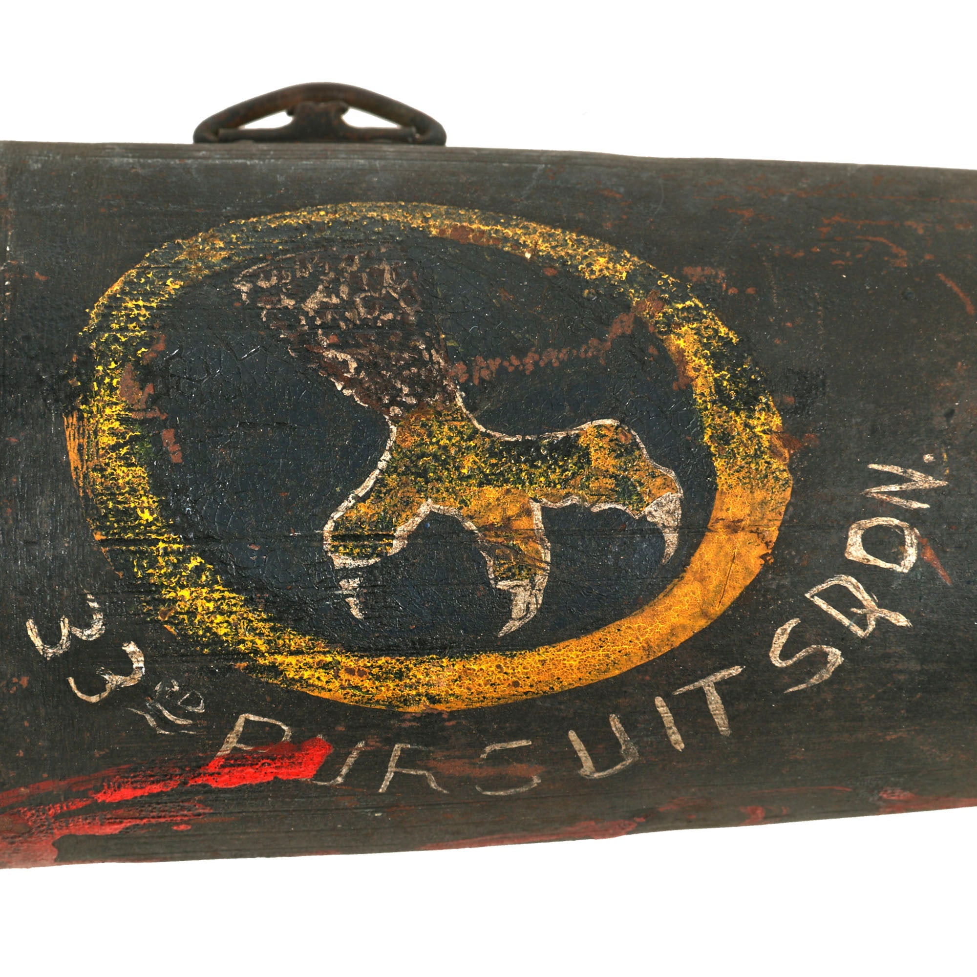 Original Item. One-of-a-Kind. This is a really tremendous piece of early U.S. Aviation history. A WWI-era Mk. I drop bomb which has been painted during the 1930’s for the 33rd Pursuit Squadron and the General Headquarters Air Force. The 33rd Pursuit Squadron emblem was approved on September 22nd, 1933, so this was painted sometime following this date. As deactivated ordnance it is NOT AVAILABLE FOR EXPORT.