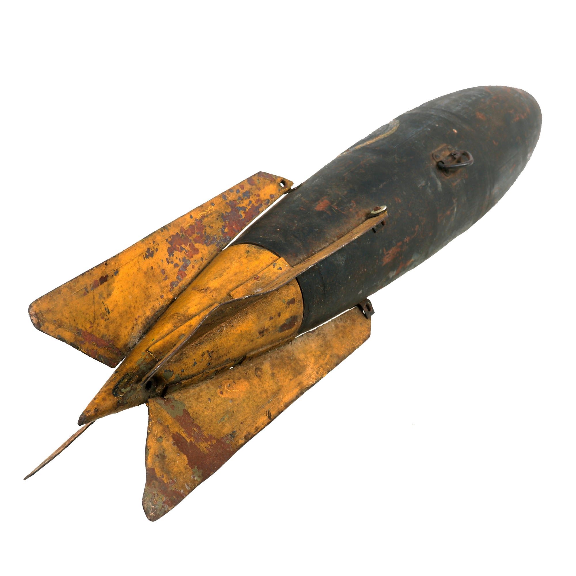 Overall, the bomb is in fine shape but could use some work to try and remove the red paint atop the original artwork, but it would still display rather nicely as is. This is a great and unique piece of U.S. aviation history, ready for further research and display.