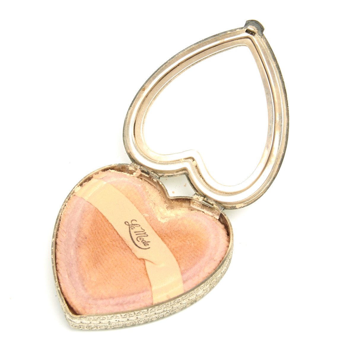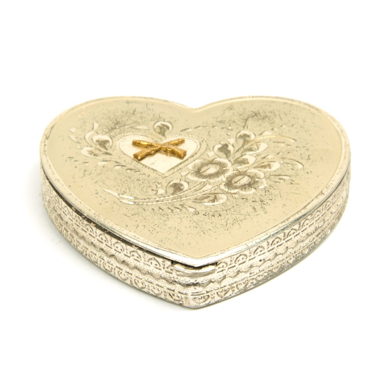 A white metal powder compact in the shape of a heart. Displays the gold crossed rifles of the infantry. Opening to display a mirror in the lid and a lower lidded compartment to hold the powder sponge, all heart shaped, very sweet!