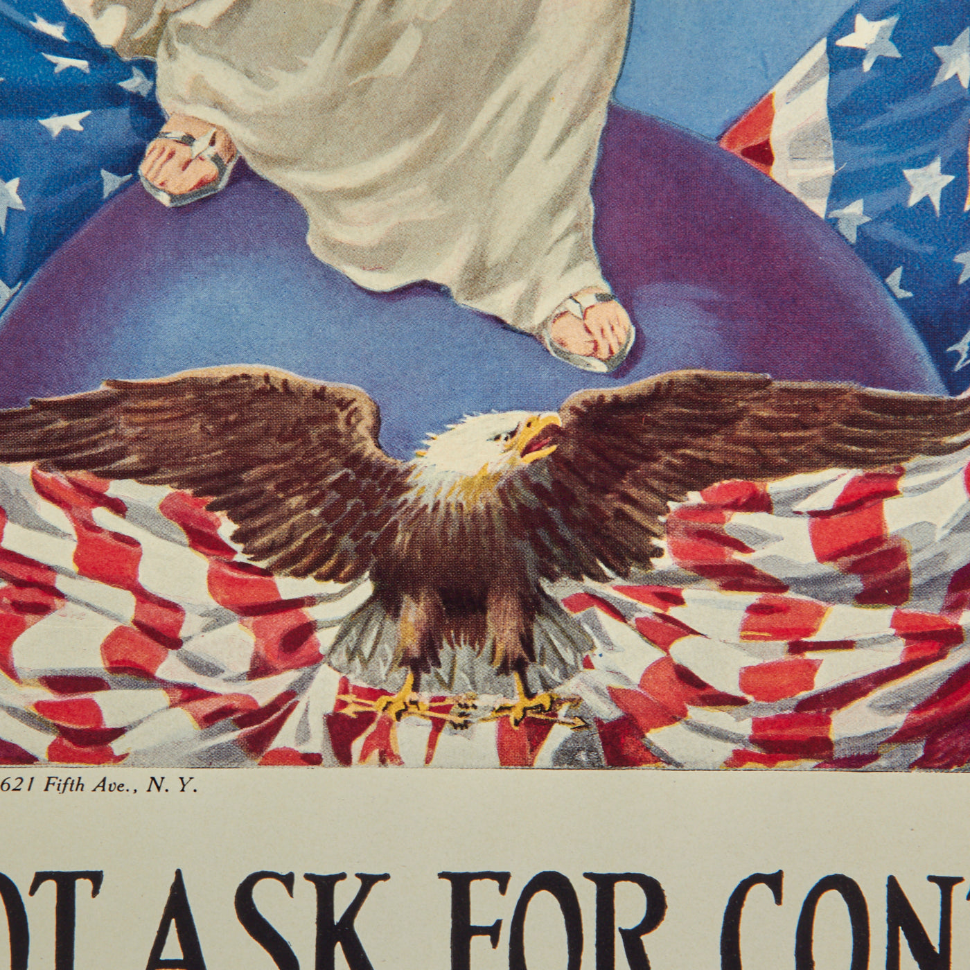 This design was originally used as a US Army recruitment poster titled “Columbia Calls” in 1917. Frances Adams Halsted designed the original image and Vincente Aderente painted the image that she wanted. Convinced that war with Germany was inevitable, Frances Adams Halsted wrote her poem, Columbia Calls, in 1916. After America entered the war on April 6, 1917, Halsted donated both her poem and accompanying image design to the U.S. War Department. Three months later, the New York Times announced plans to print 500,000 copies as a poster, intending to use the proceeds to establish a home for orphaned children of American soldiers and sailors. Painter Vincent Aderente, who executed Halsted's design, had emigrated from Italy at age six, studied at the Art Students League in New York City, and served as an assistant to muralist Edwin Howland Blashfield.