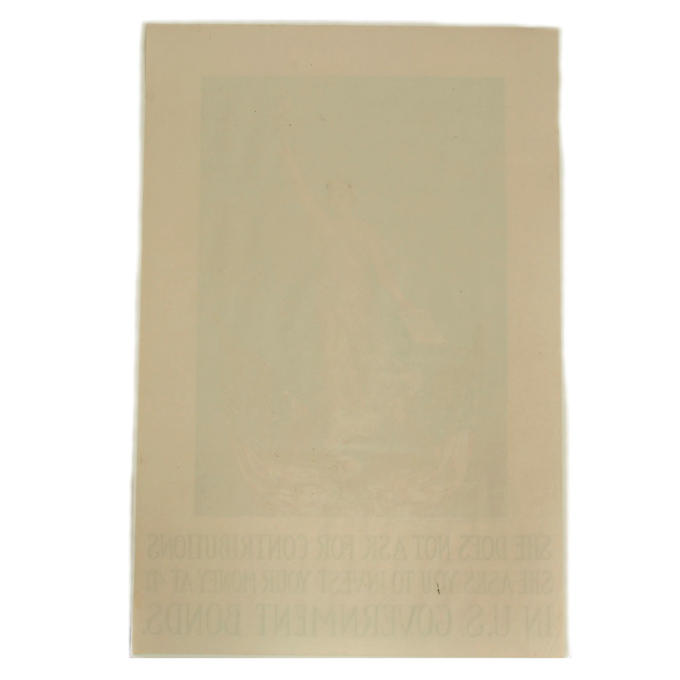 With an image so popular it was recycled into many uses, one of which was for advertising for investing in US Government Bonds. The poster itself features Lady Liberty holding up her torch in her left hand while holding a document in her right titled as being for Liberty Loans. She stands atop a globe which is flanked on both sides with the American flag and Bald Eagle with wings spread in the center.