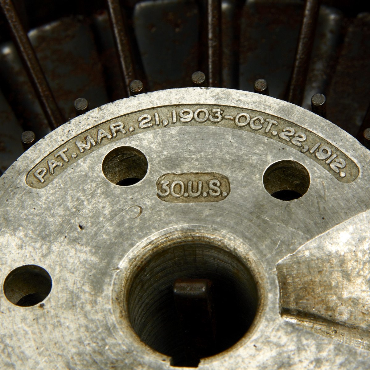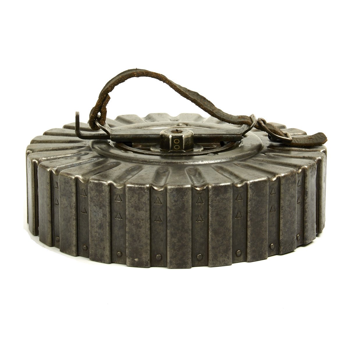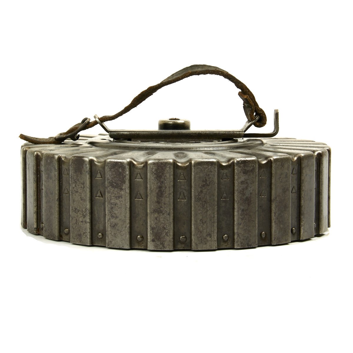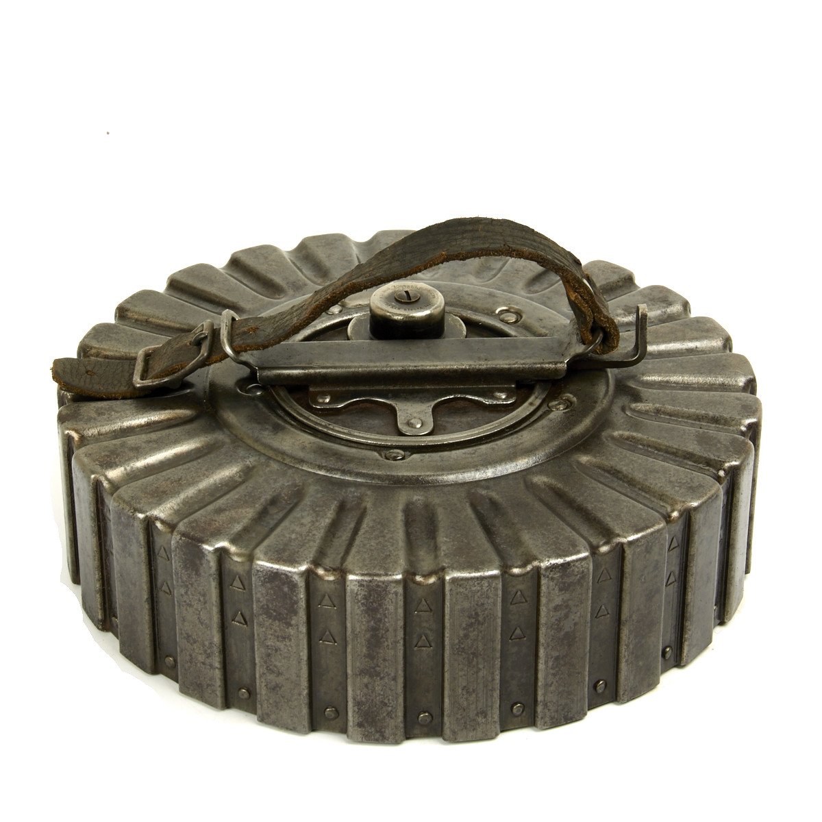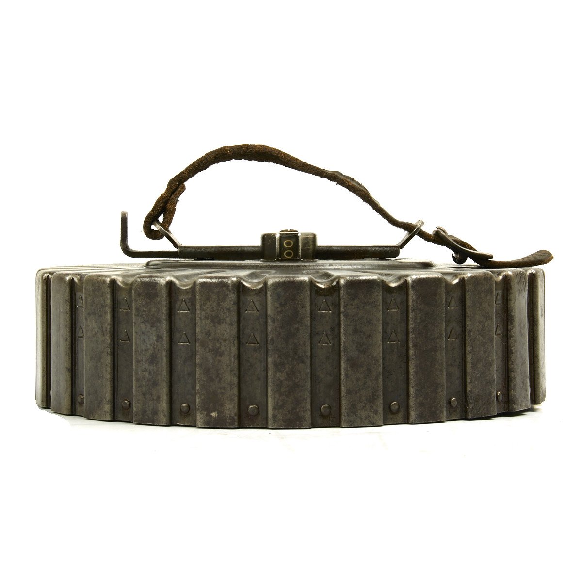 PAT. MAR. 21.1903-OCT. 22. 191230. U.SThis is an original 97 round ammunition drum magazine for the legendary Lewis machine gun. Complete with original leather carry strap, whole unit is in nice condition and appears fully functional.