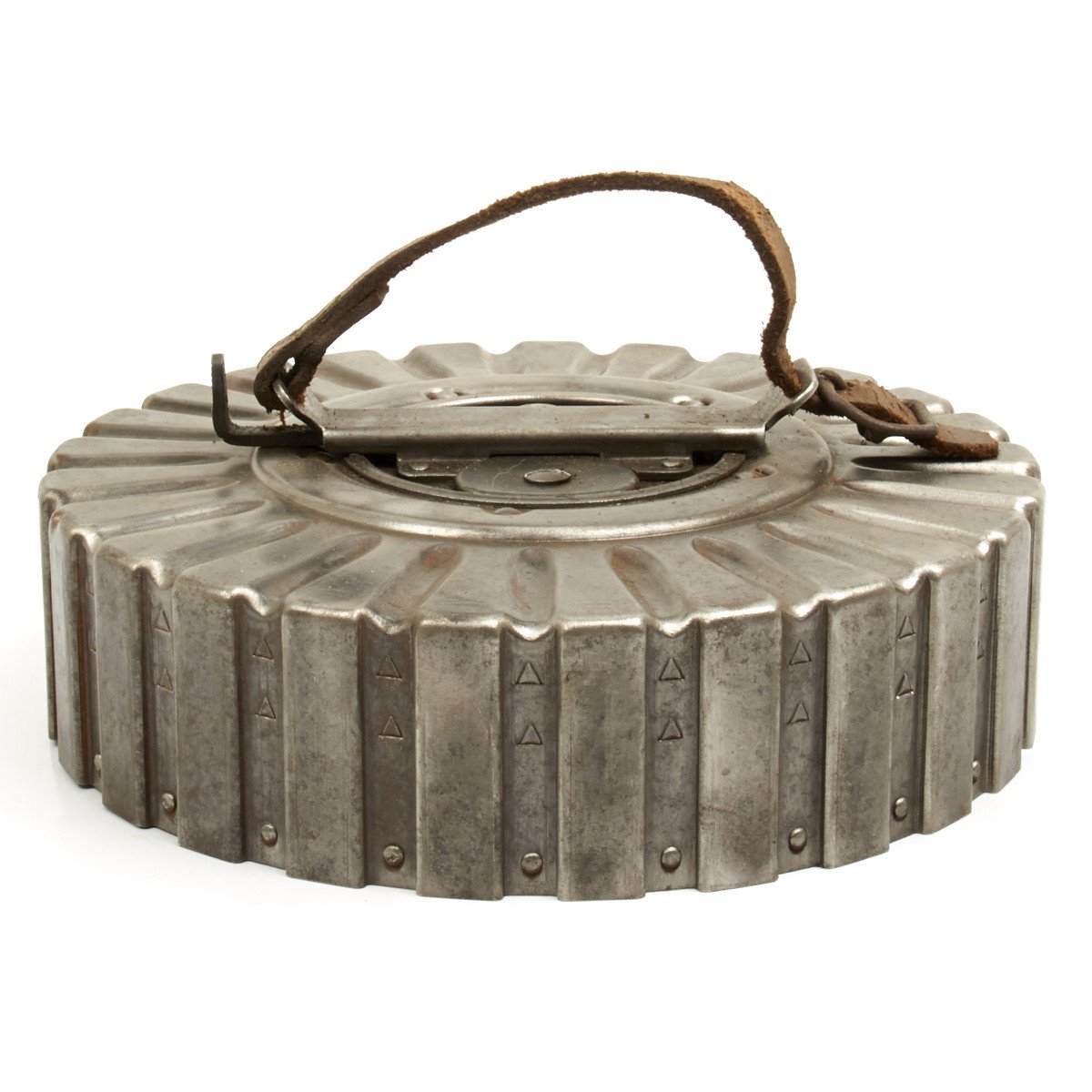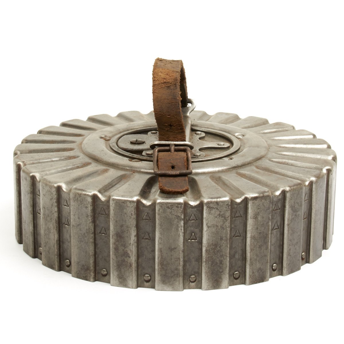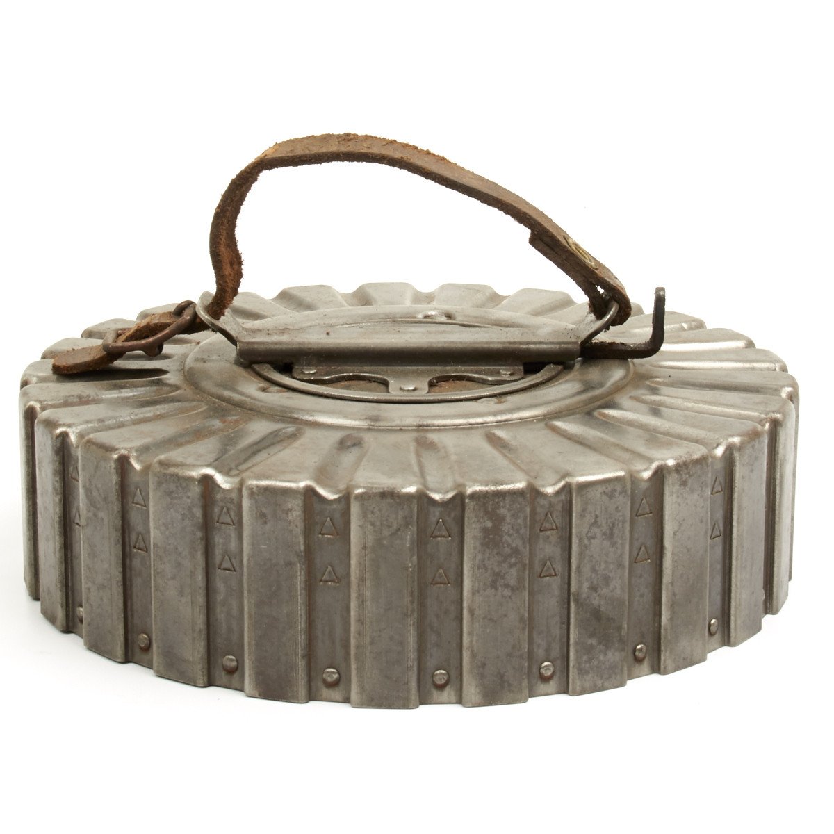 This is an original 97 round ammunition drum magazine for the legendary Lewis machine gun. Complete with original leather carry strap, whole unit is in nice condition and appears fully functional.
