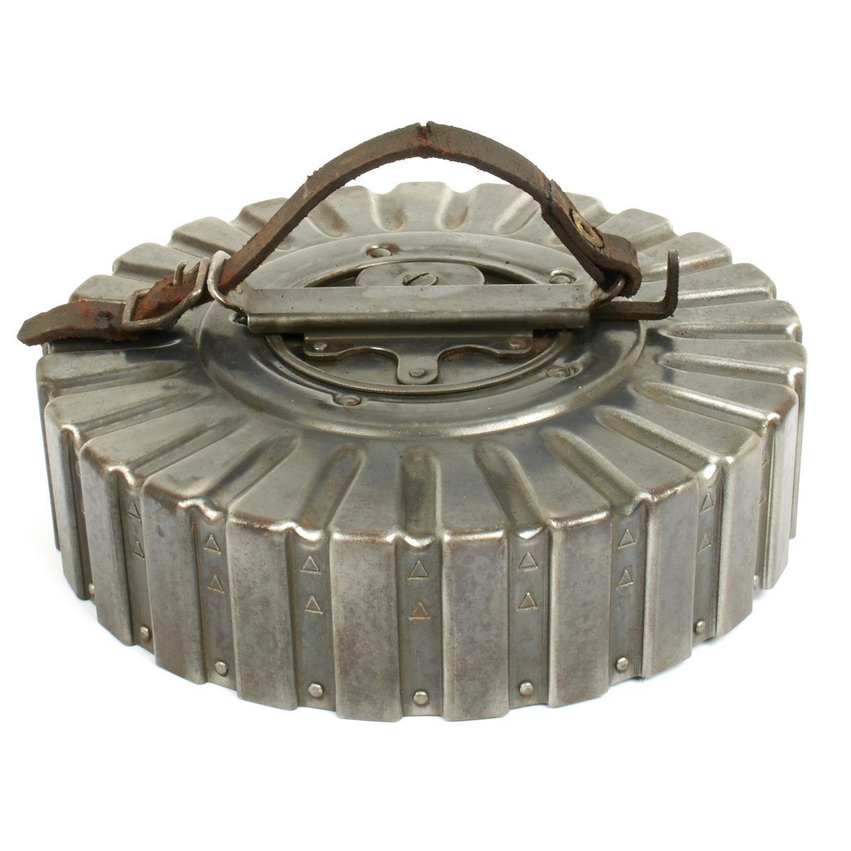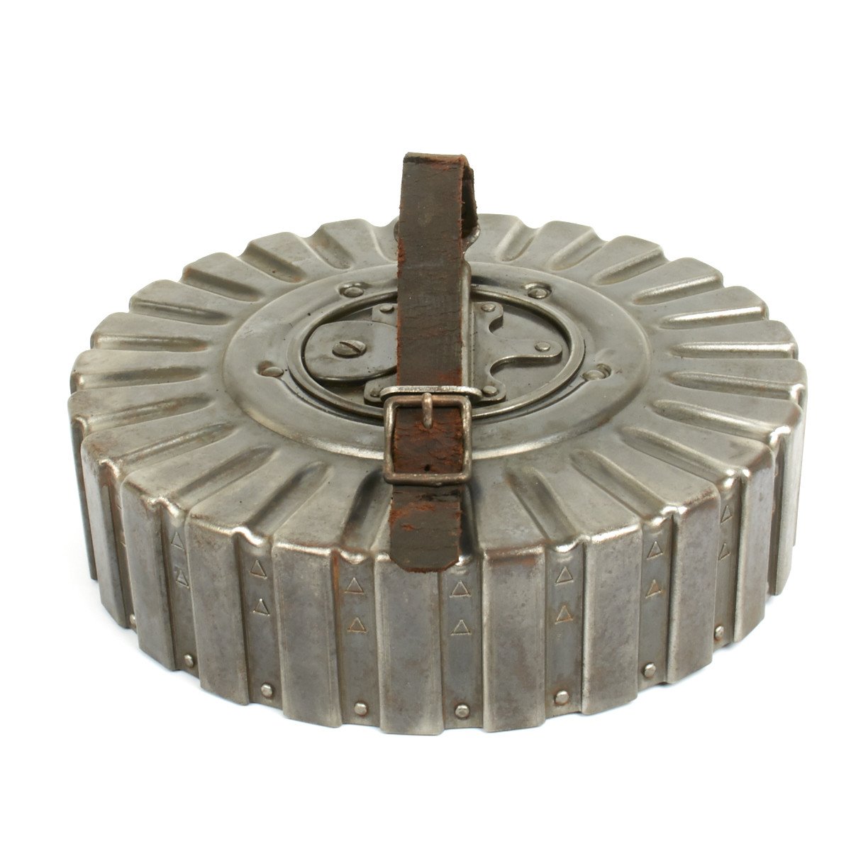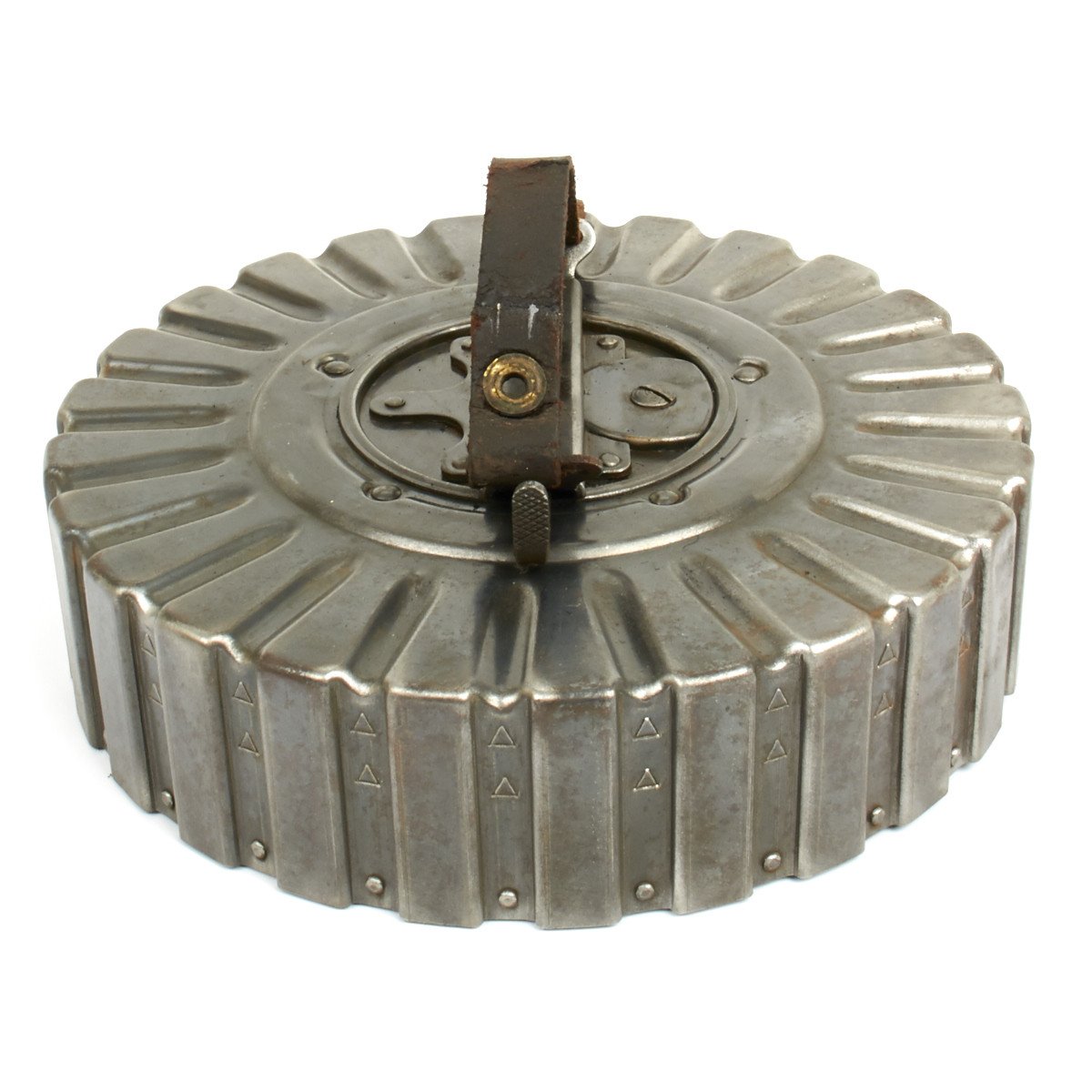 This is an original 97 round ammunition drum magazine for the legendary Lewis machine gun. Complete with original leather carry strap, whole unit is in nice condition and appears fully functional.