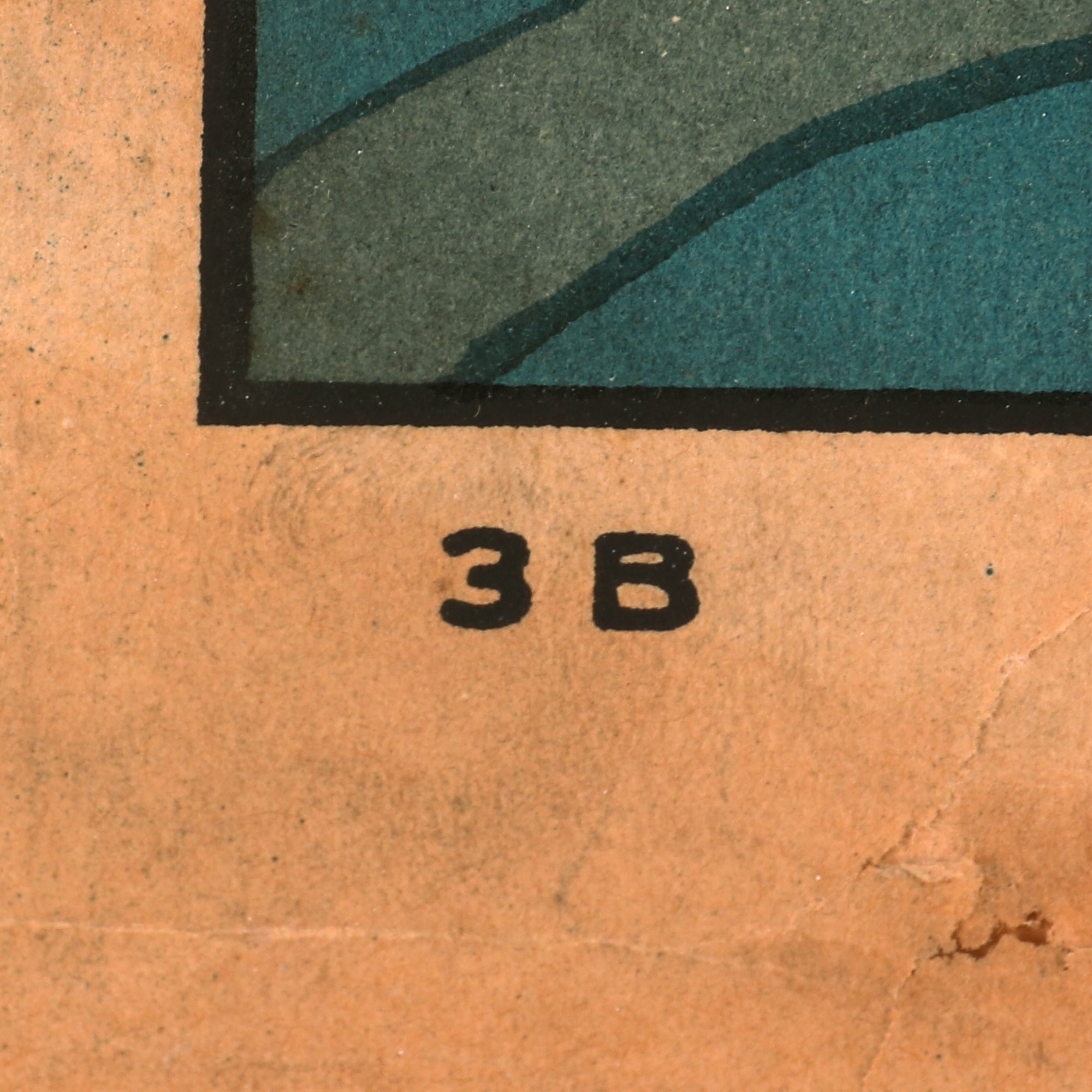The poster is in fair condition considering the age, but it is not without fault. There are several tears along the bottom as shown, with one going up about 11”. There is some discoloration, possibly from water damage. The top of the poster is much cleaner, and it will look much better framed. The poster is pasted to the cardboard at the top and bottom, so it would be safer to frame the entire board instead of trying to remove it.
