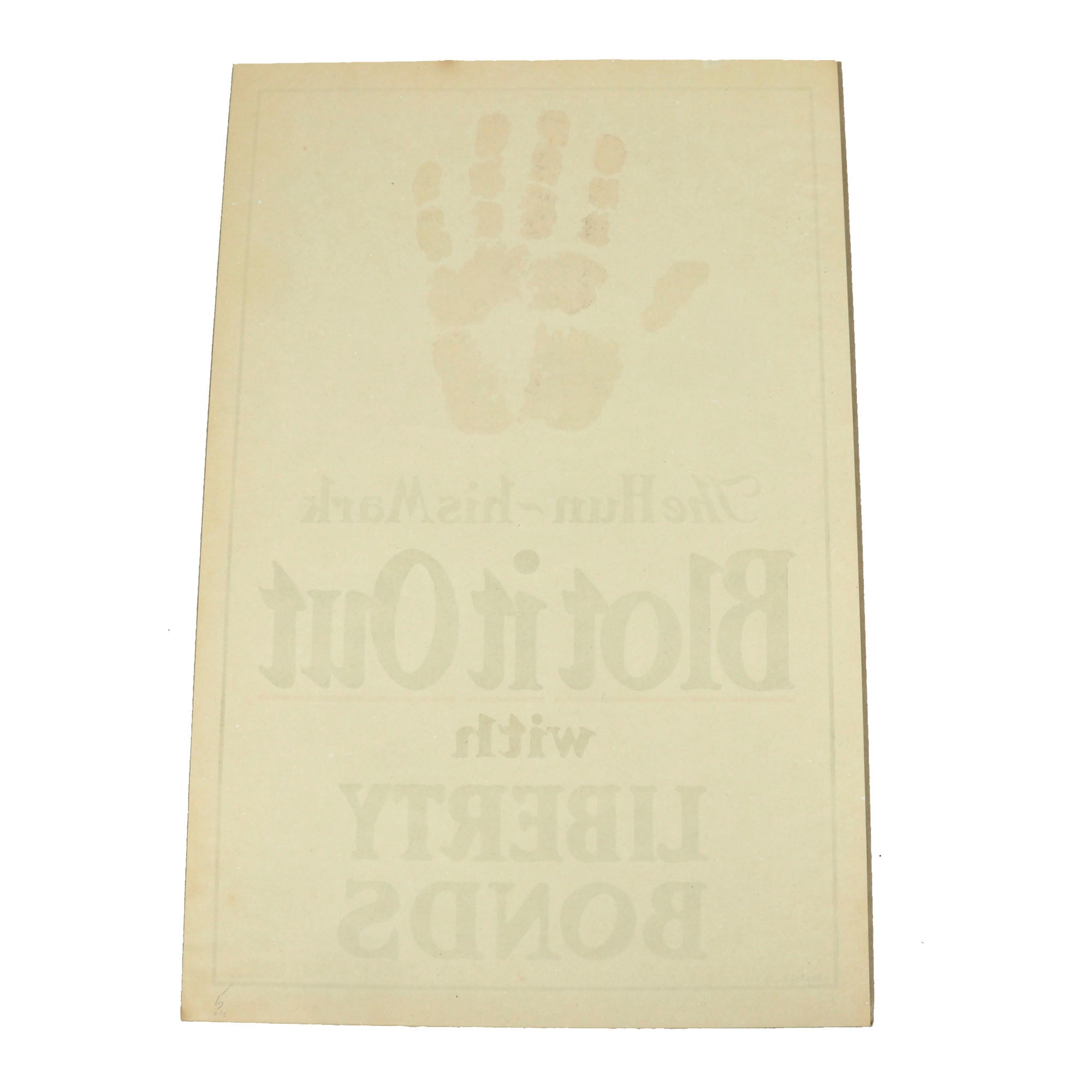 Original Item: Only One Available. During WWI, the U.S. government needed money to pay for tanks, ammunition, airplanes, and ships to fight the war. The government found funding through civilians through war bonds, or Liberty Loans. This was a very effective way of getting large amounts of money quickly. The poster encouraged the viewer to purchase a Liberty Loan to support the soldiers and end the war. A bloody hand print is used to signify the mark of Germany. The poster used the symbol as a tool to raise money for the American war effort through the sale of Liberty Bonds. The term "Hun" was used during both World War I and World War II as a derogatory word for a German soldier. It is a reference to the nomadic culture of Eastern Europe and Central Asia who achieved military success under their leader "Attila the Hun" during the 5th Century A.D.