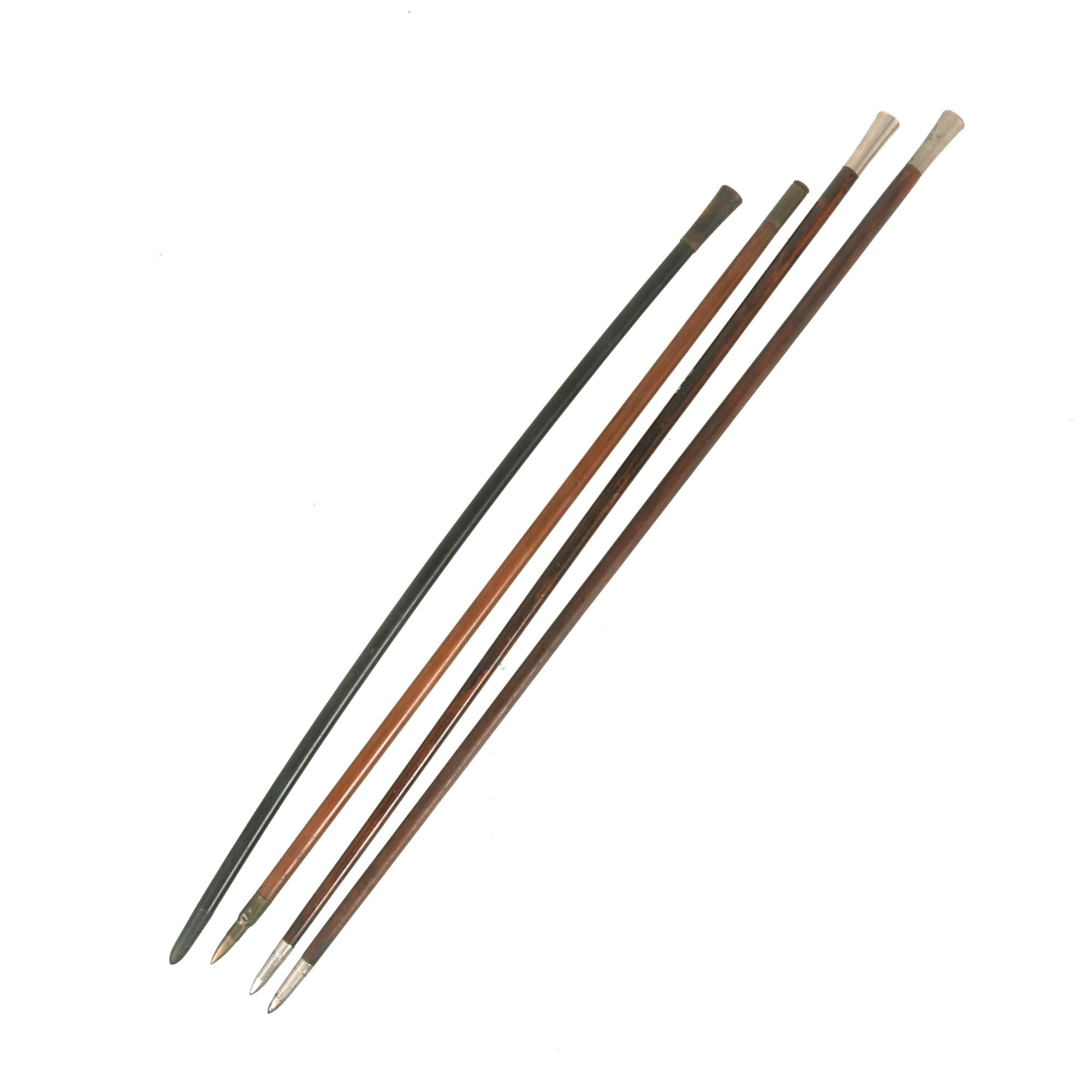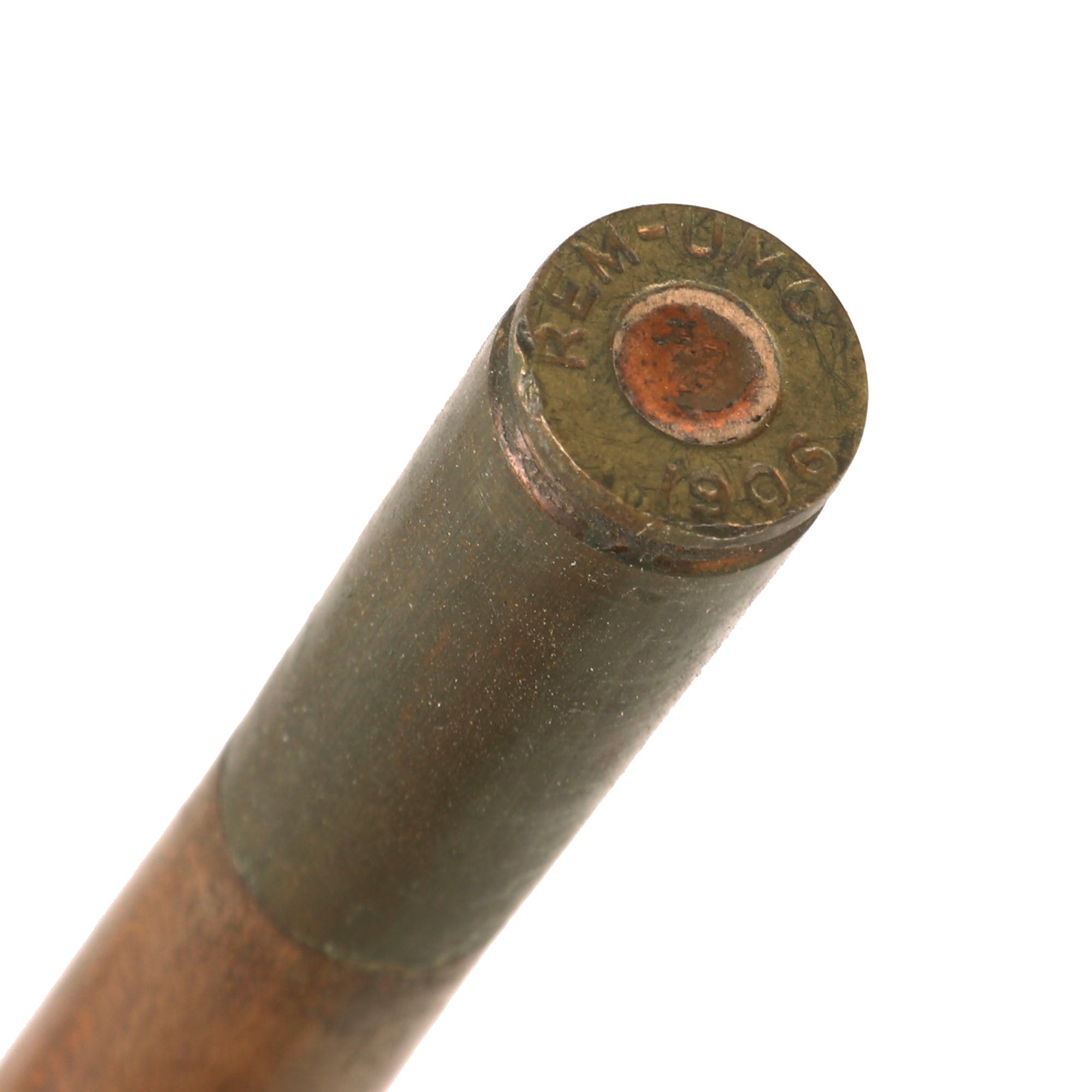 The cartridge swagger stick has the bottom of the cartridge along with the still-intact primer as the handle, with the bottom being the other end of the cartridge. The cartridge is made by REM-UMC, for Remington. This example measures 22½” long. The other three swagger sticks are similar but with different lengths, all having the same style handle with different pointed bullets at the bottom. These measure 21¼”, 25”, and 26” long.