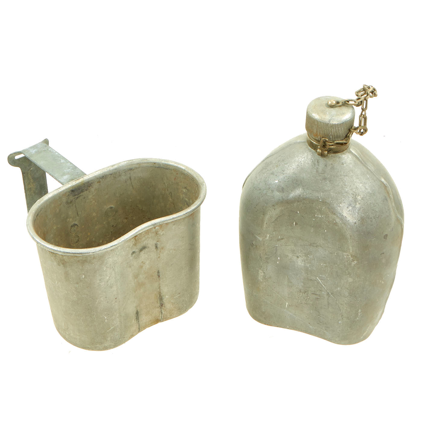 Original Item: Very Few Available. Just found in a recent warehouse cleanout! These are genuine U.S. WWI Dated M-1910 Canteens with Aluminum Screw Caps, complete with WWI cups. These do not have any canvas carriers, which deteriorated or were lost long ago. These are all in very good condition, but will show minor dents and other wear from service.