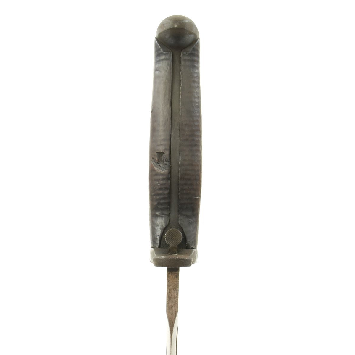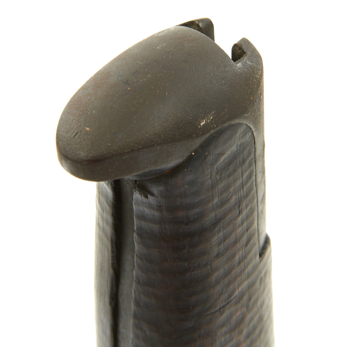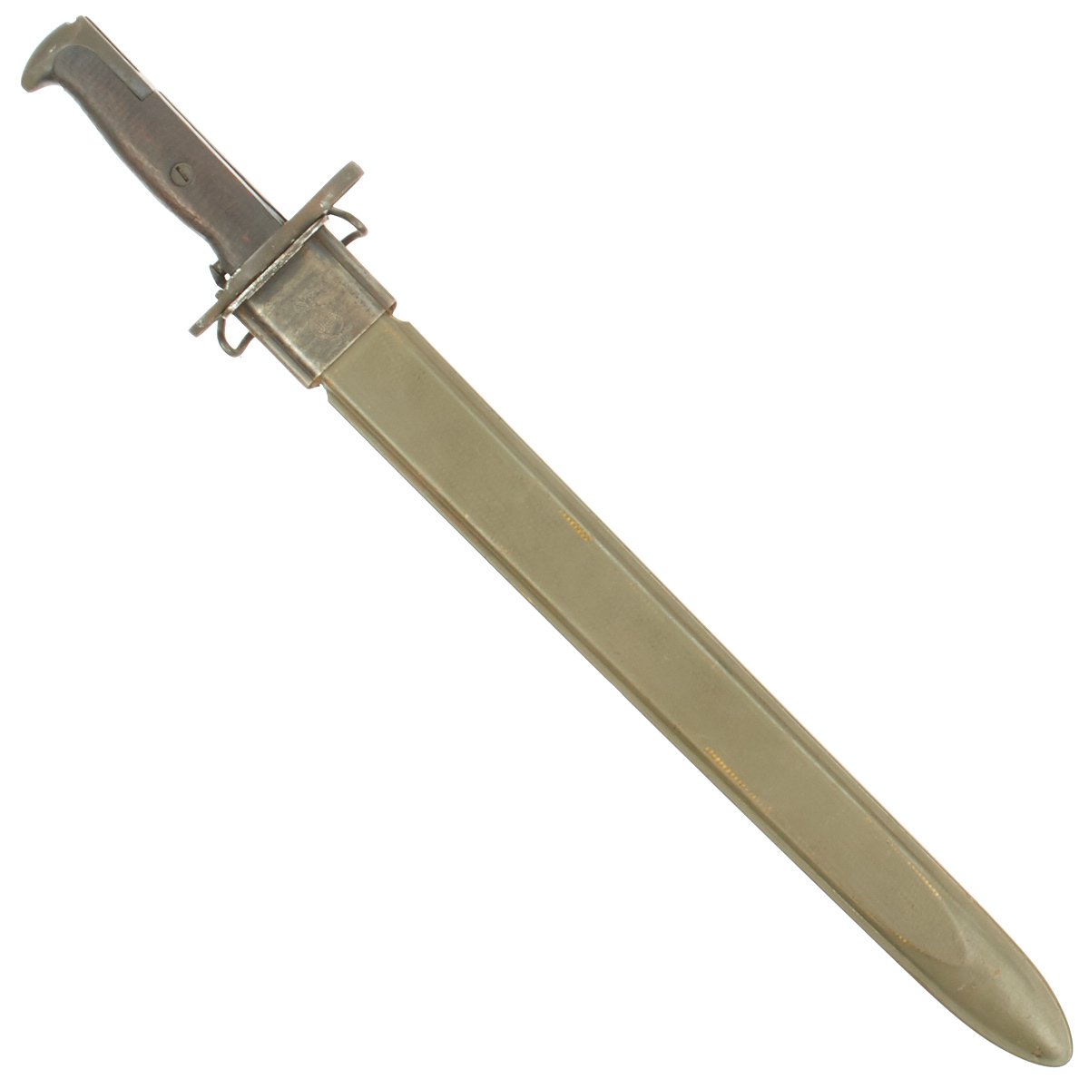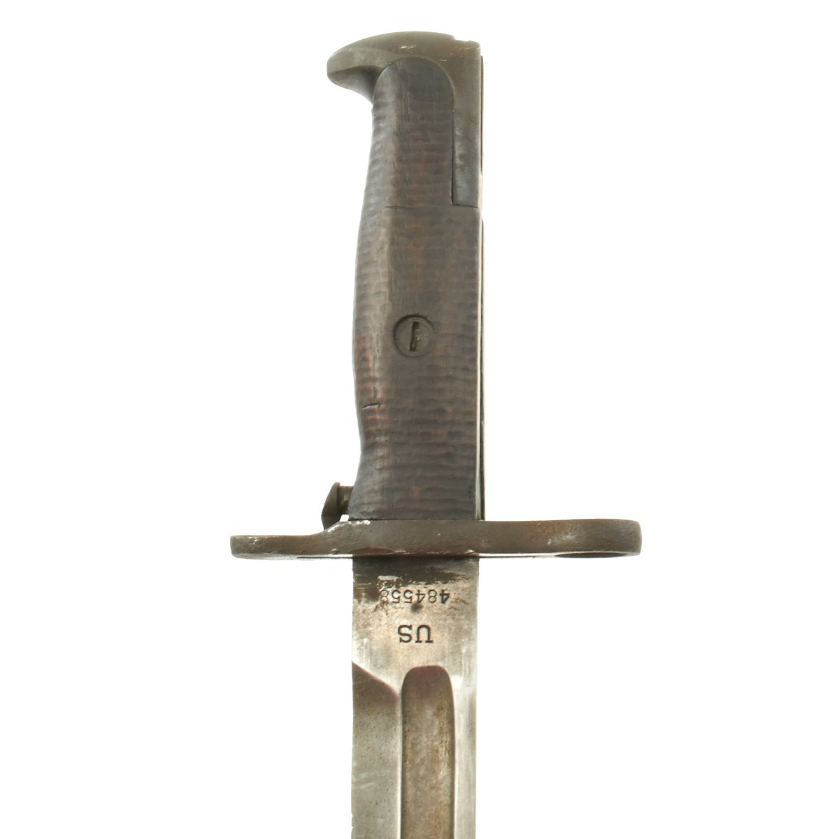 The Garand was designed to take the same blade bayonet as the M1903 Springfield rifle, so at the beginning of the war they were issued with bayonets originally made for those rifles. Later in 1942 to keep up with wartime production, new orders for M1905 bayonets with plastic grips were sent out, which had plastic ribbed grips. These were also sometimes fitted to M1905 bayonets made previously that had damage to their wooden grips, however this example still retains the original wooden grips.