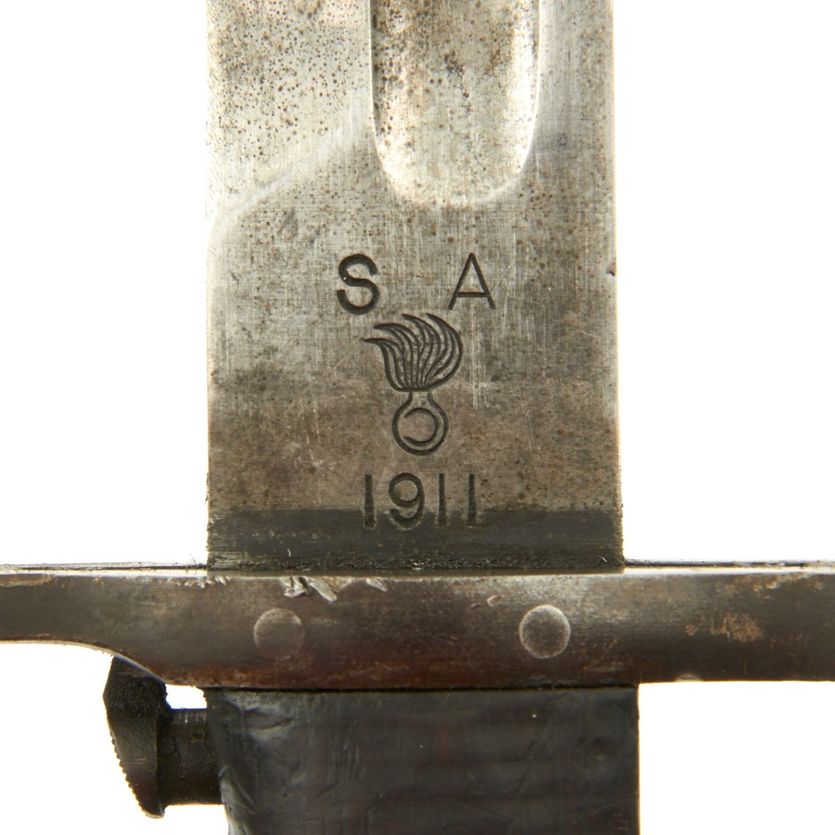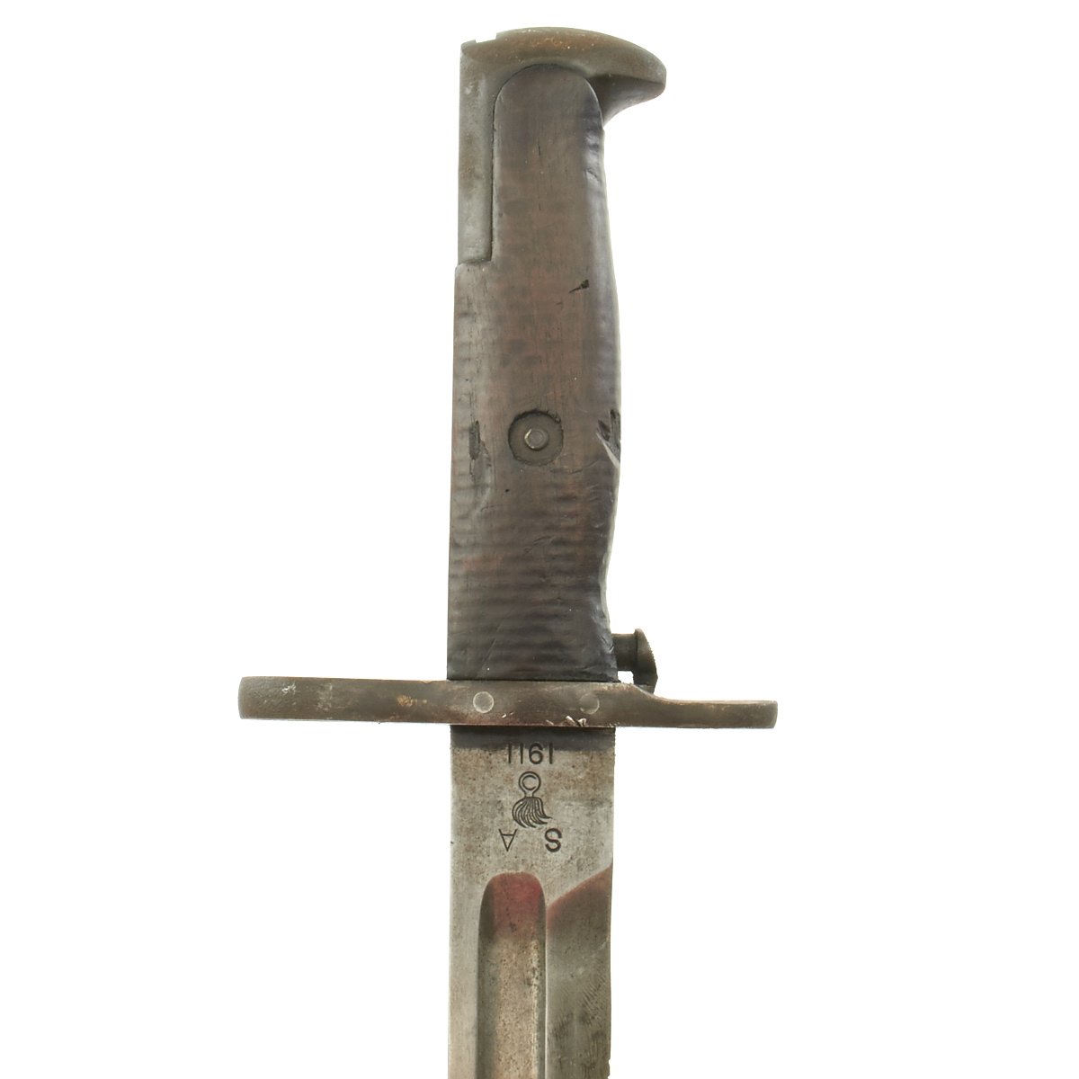 The blade ricasso is marked with SA for the Springfield Armory in Springfield Mass, the primary center for the manufacture of United States military firearms from 1777 until its closing in 1968. Below this is the Ordnance flaming bomb and date of manufacture 1911. The other side of the ricasso is marked with U.S. above serial number 484558. The blade is in good shape with just a bit of staining and peppering from age. It has been sharpened, and there are numerous small nicks on the edge from use. The original wooden grips are in good condition with a great color, and both sides show traces of the original "ribbed" surface finish.