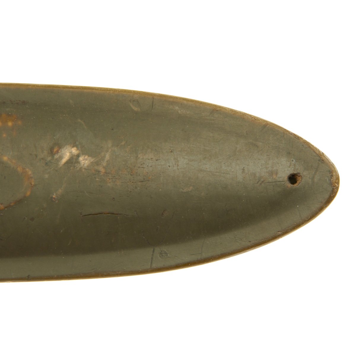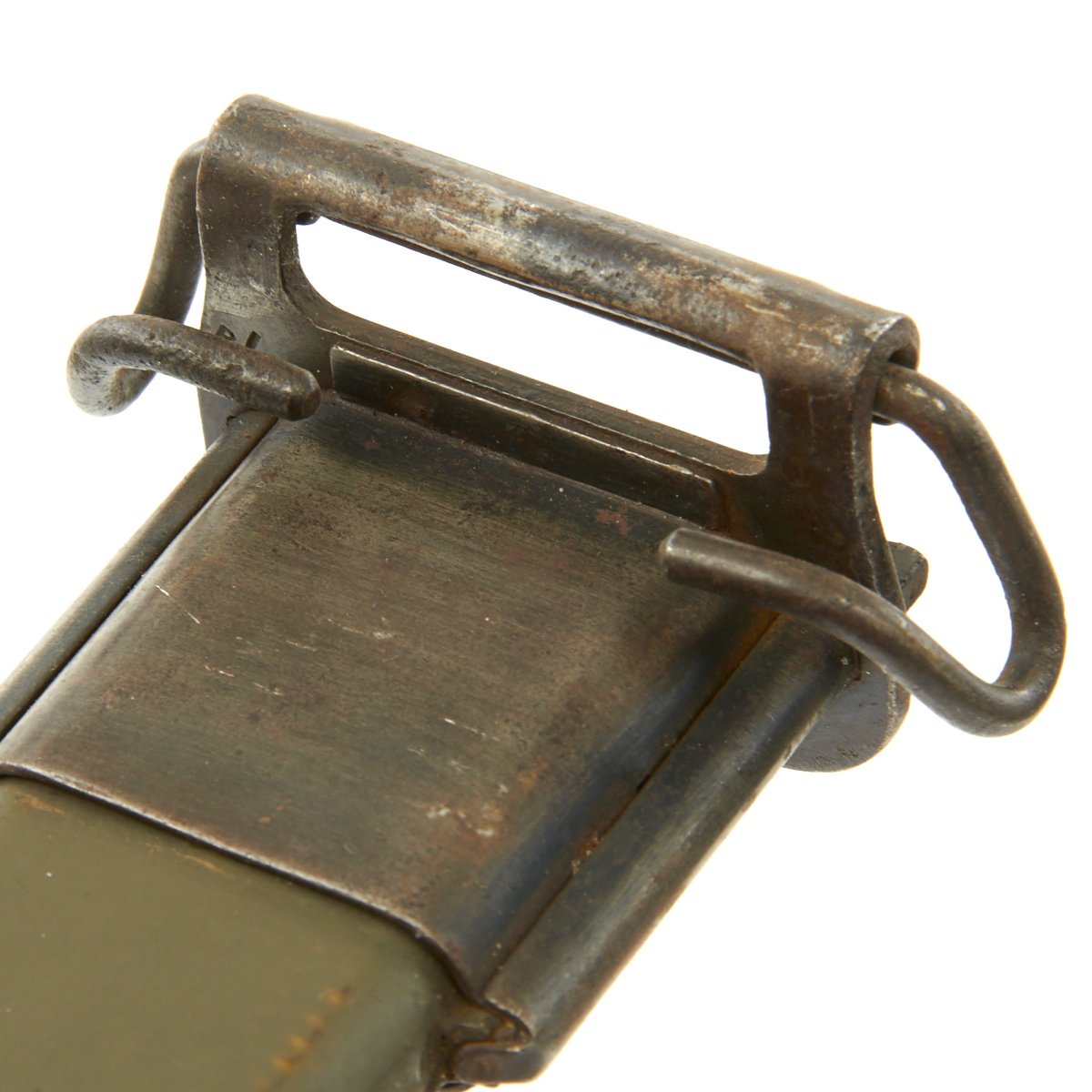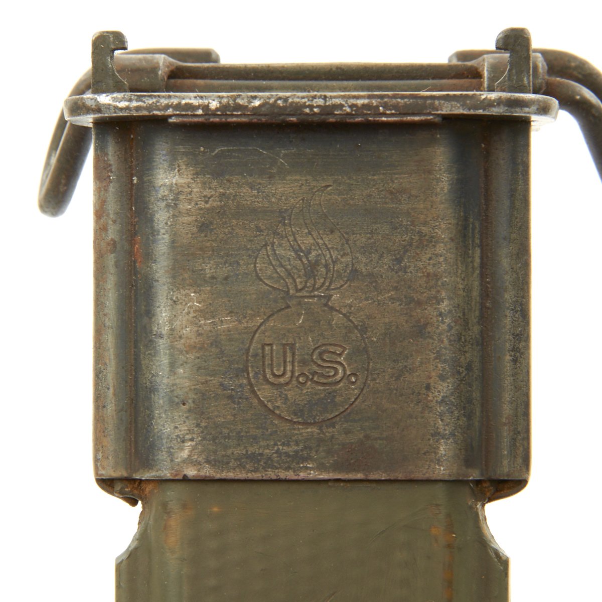 The original M3 Fiberglass scabbard is marked U.S. on the parkerized steel throat over the "Flaming Bomb", and is in very good condition. The B N marking on the underside of the metal throat lip indicates manufacture by Beckwith Manufacturing, who produced a variety of fiberglass scabbards during the war. The N is for New England Pressed Steel, who made the steel throats under contract with Beckwith. The throat retains some of the original finish, with a nice worn patina. The body is has some wear, but nothing major, with no cracks or large chips in the fiberglass, and only has a few spots of finish wear.