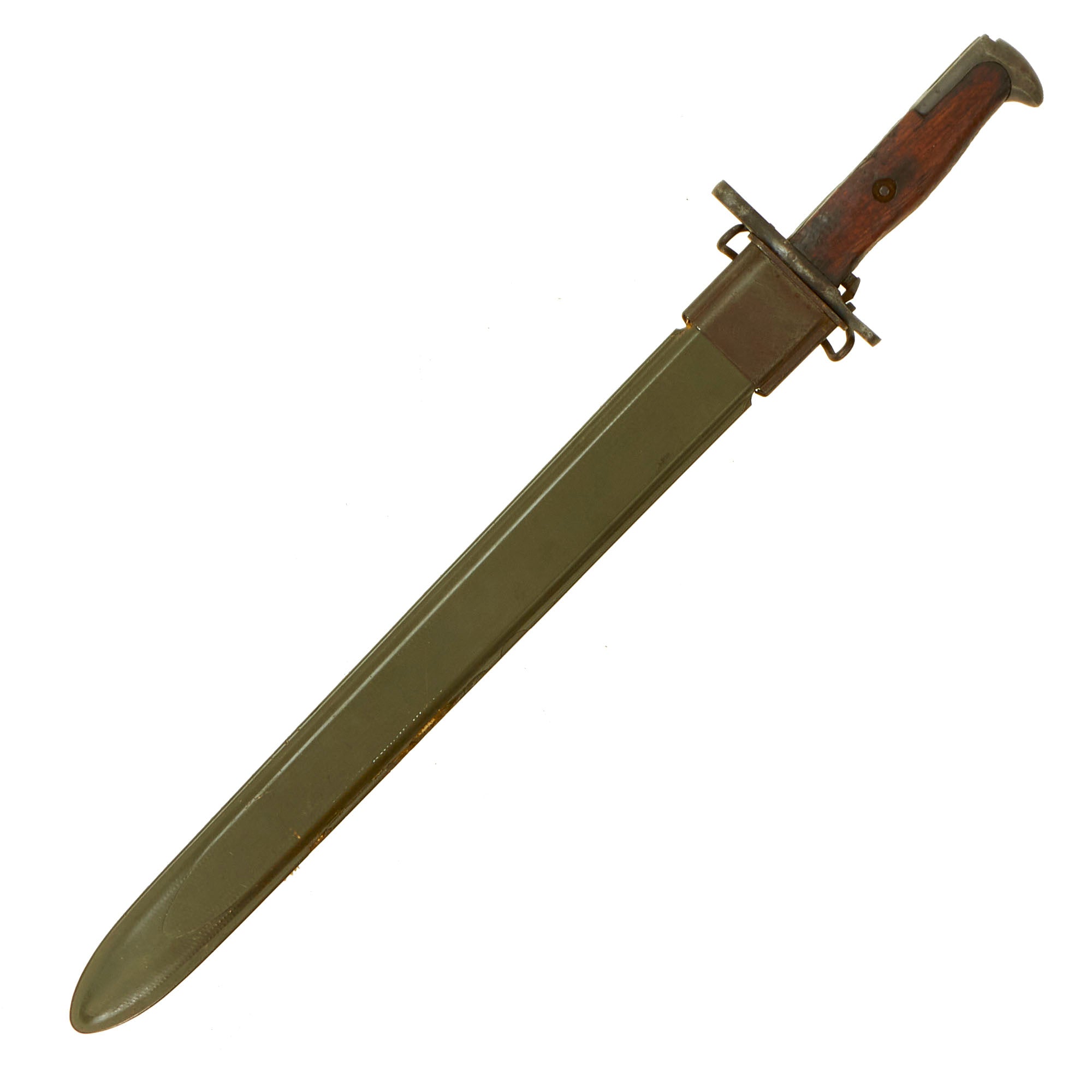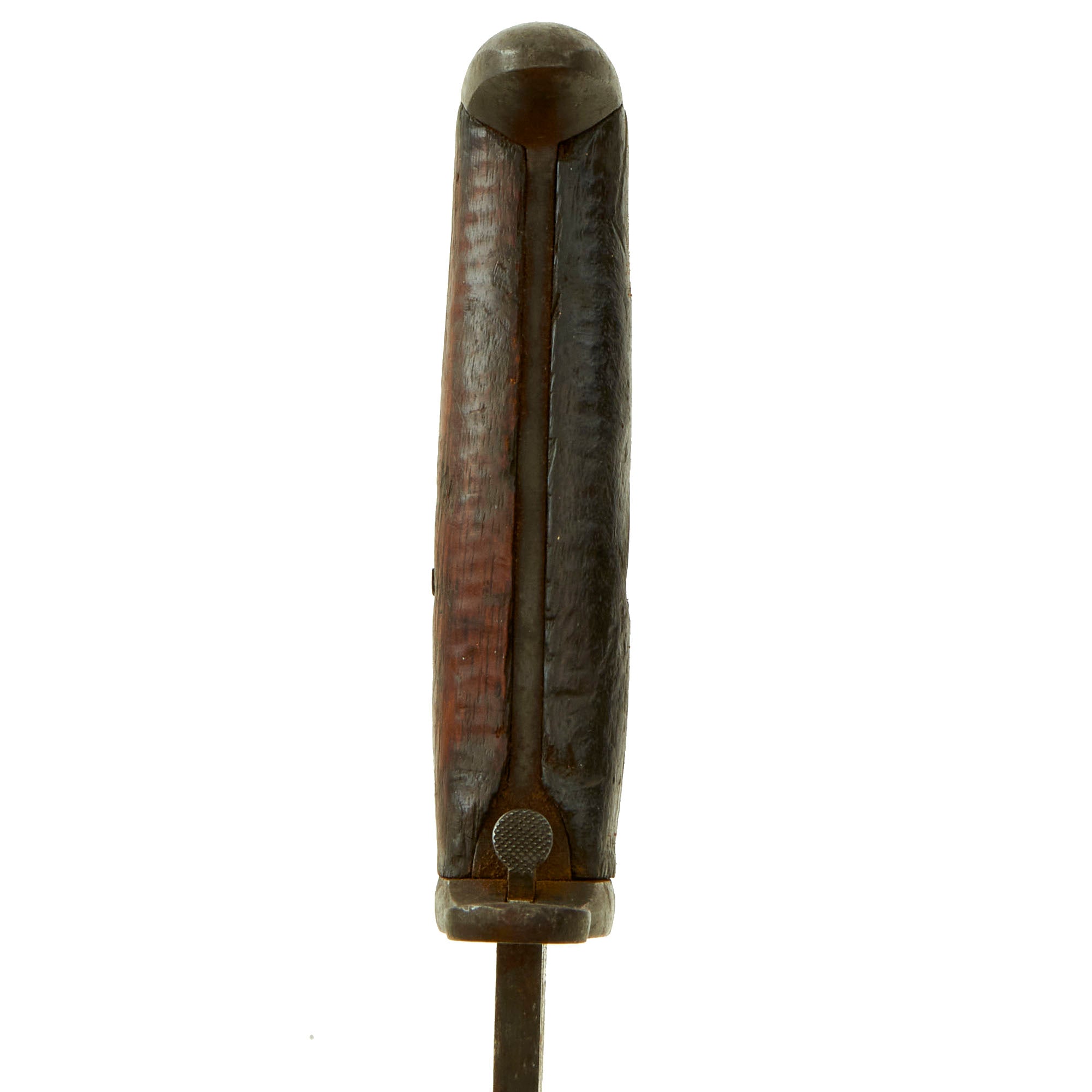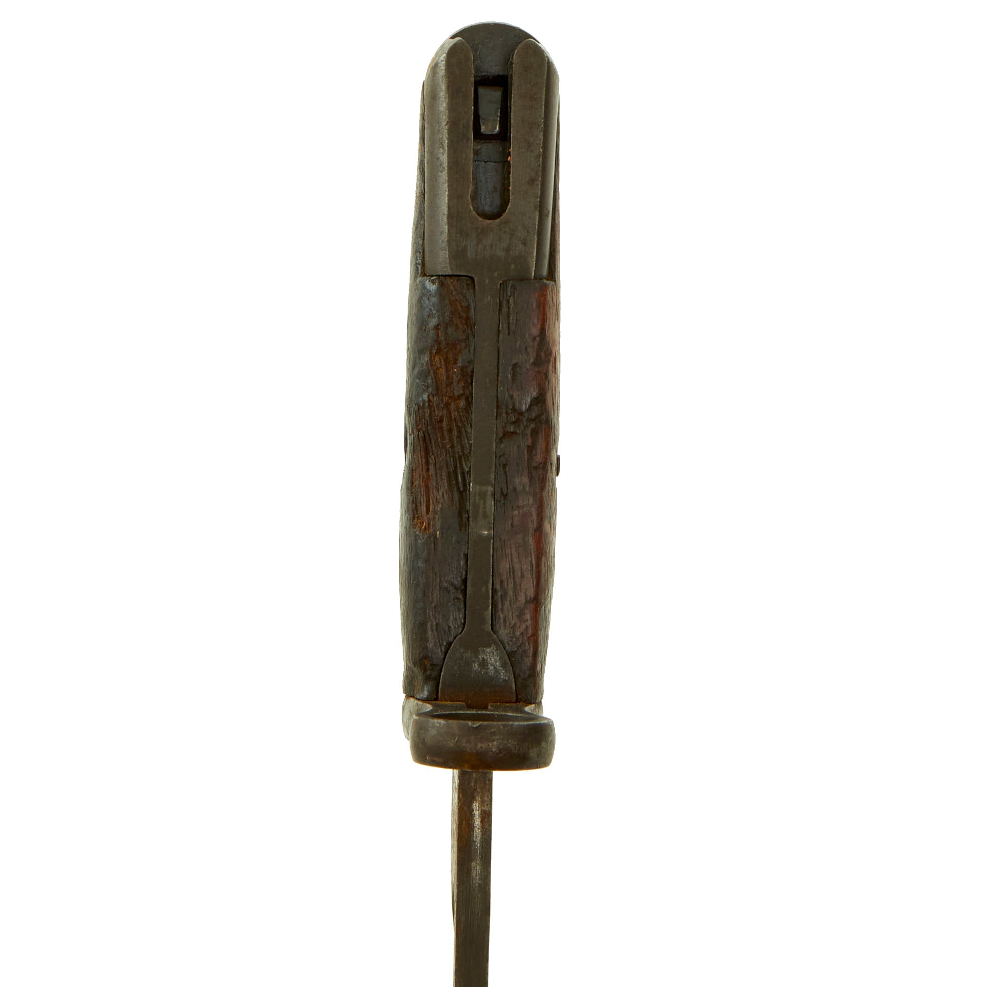 The M1 Garand was designed to take the same blade bayonet as the M1903 Springfield rifle, so at the beginning of WWII, many were issued with bayonets originally made for those rifles. Later in 1942 to keep up with wartime production, new orders for M1905 bayonets with plastic grips were sent out, which had plastic ribbed grips. These were also sometimes fitted to M1905 bayonets made previously that had damage to their wooden grips. This bayonet however still has its original wooden grips, and does not appear to have been reissued for WWII use.