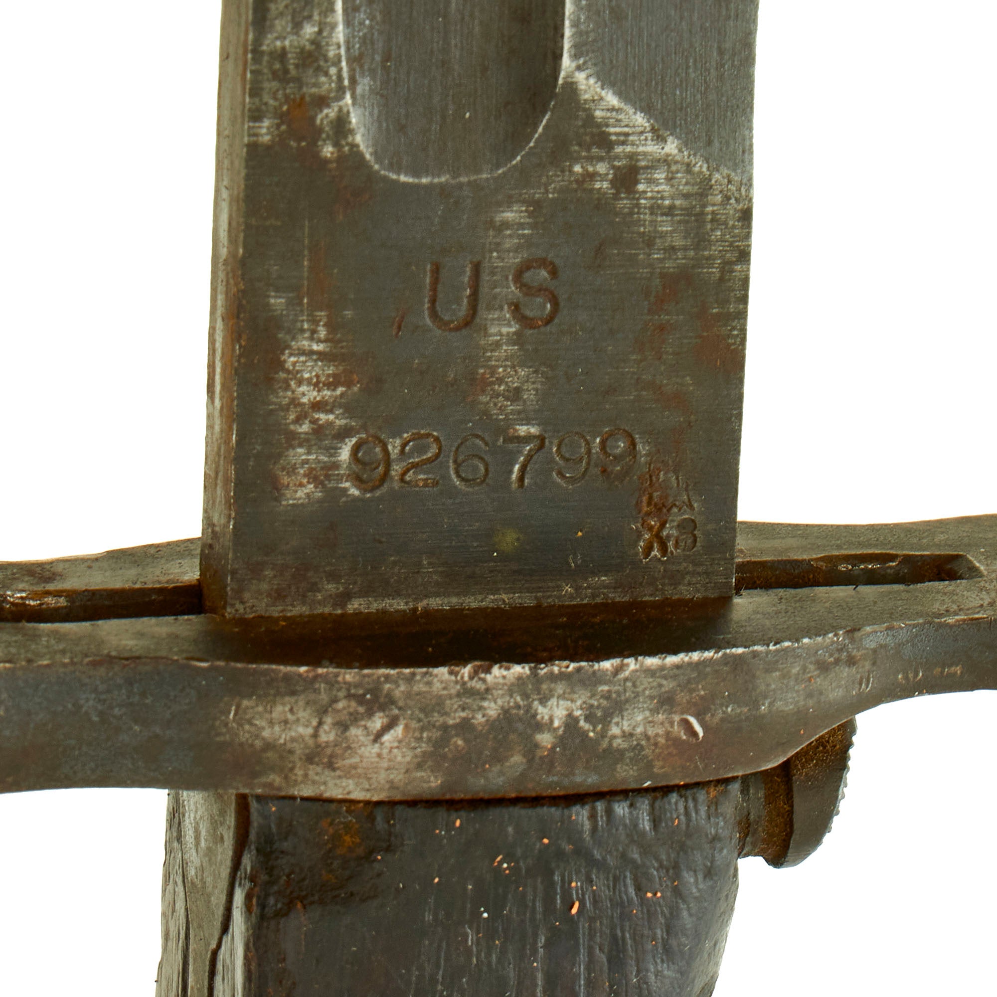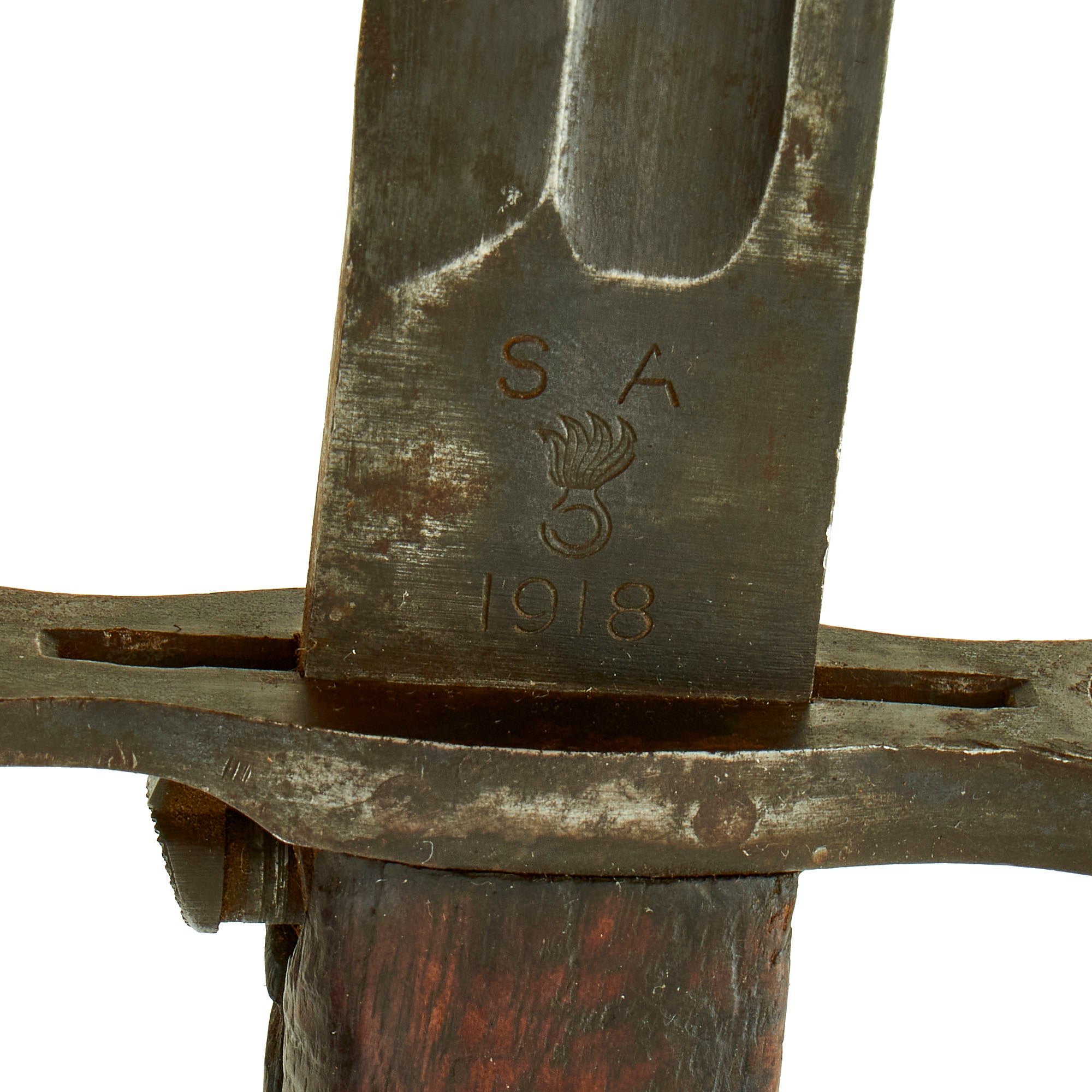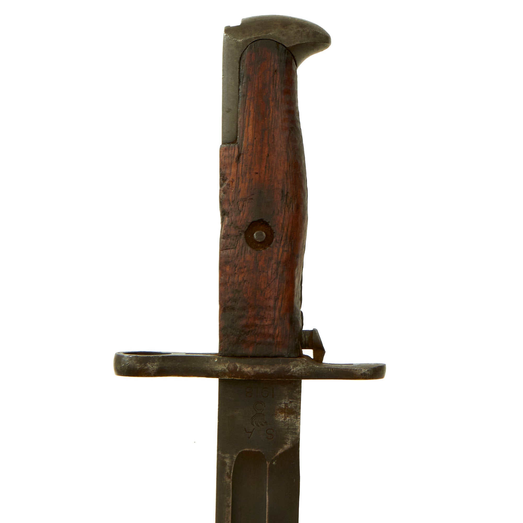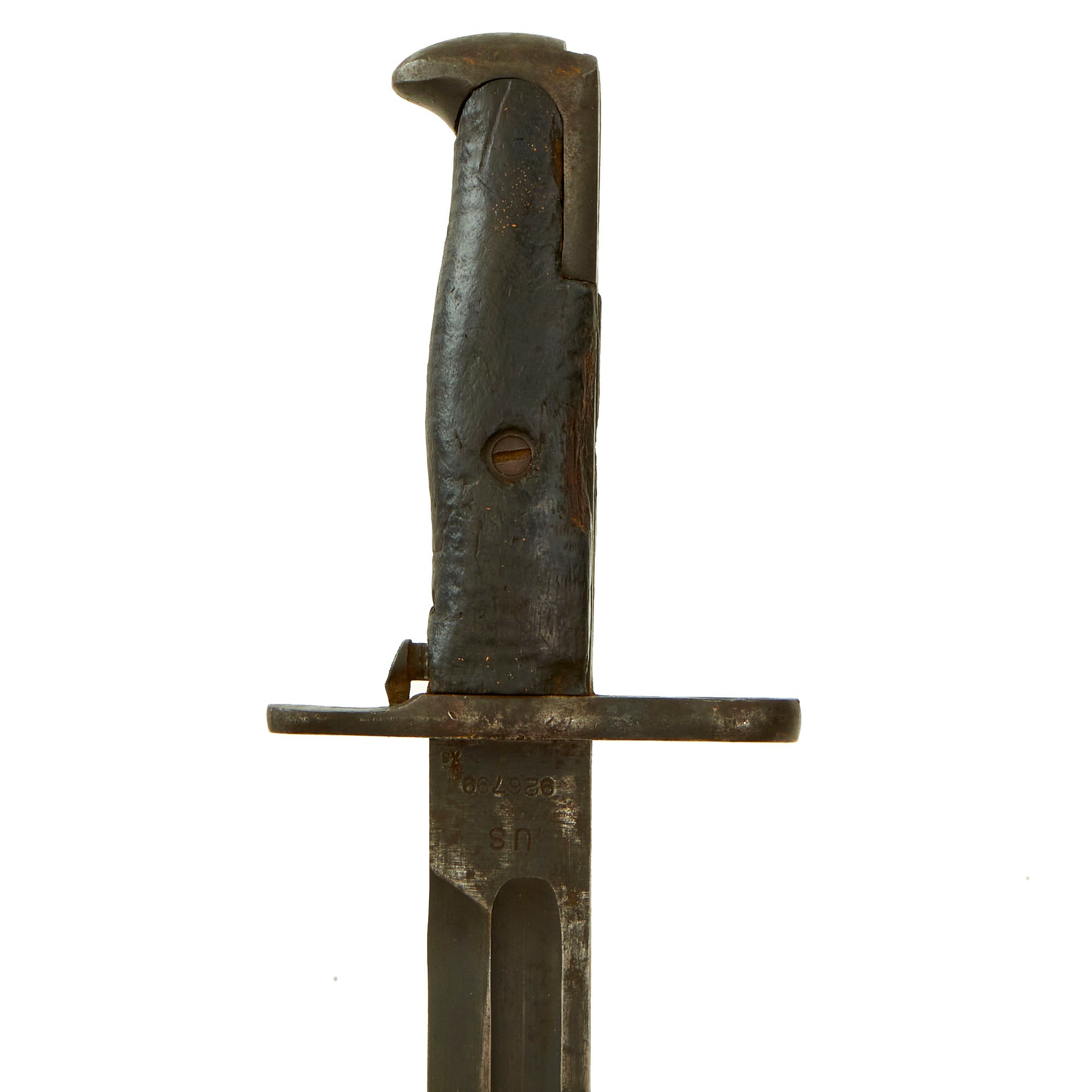 The blade ricasso is marked with SA for the Springfield Armory in Springfield Mass, the primary center for the manufacture of United States military firearms from 1777 until its closing in 1968. Below this is the Ordnance flaming bomb and date of manufacture 1918. The other side of the ricasso is marked with U.S. above serial number 926799. The blade is in very good shape, though there are some nicks on the edge and spine and light pitting throughout both sides. The wooden grip scales are in fair condition, with a great color, though they have been worn mostly smooth and does have chips/cracks present.