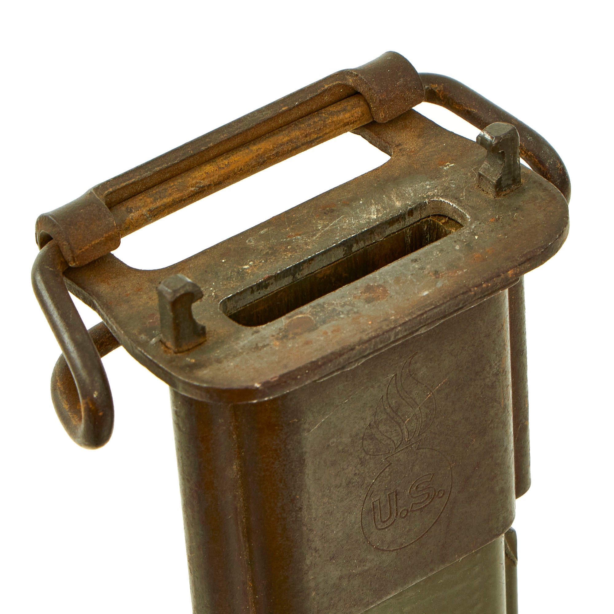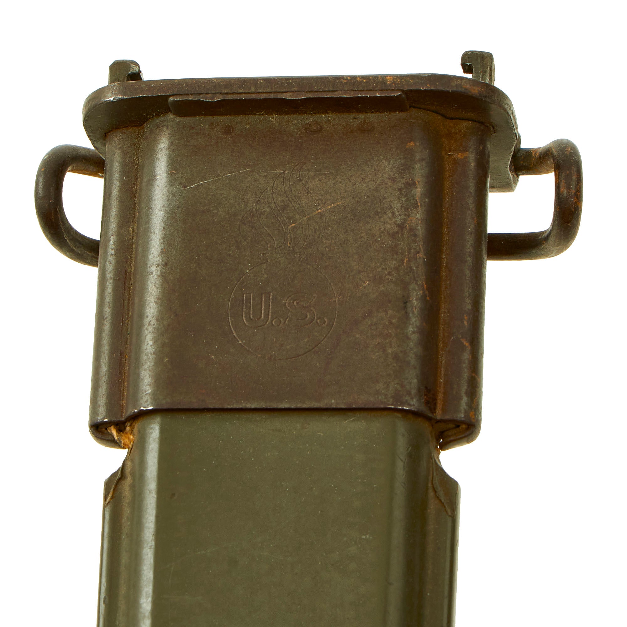 The original M3 scabbard is marked U.S. on the oxidized steel throat over the "Flaming Bomb". The B N marking on the underside of the metal throat lip indicates manufacture by Beckwith Manufacturing, who produced a variety of thermoplastic impregnated cotton fabric scabbards during the war. The N is for New England Pressed Steel, who made the steel throats under contract with Beckwith. The scabbard body is in great shape, with an almost fully intact original finish, and just some light scuffs. We cannot confirm this bayonet was issued for use during WWII or if a collector just paired the two for display purposes.