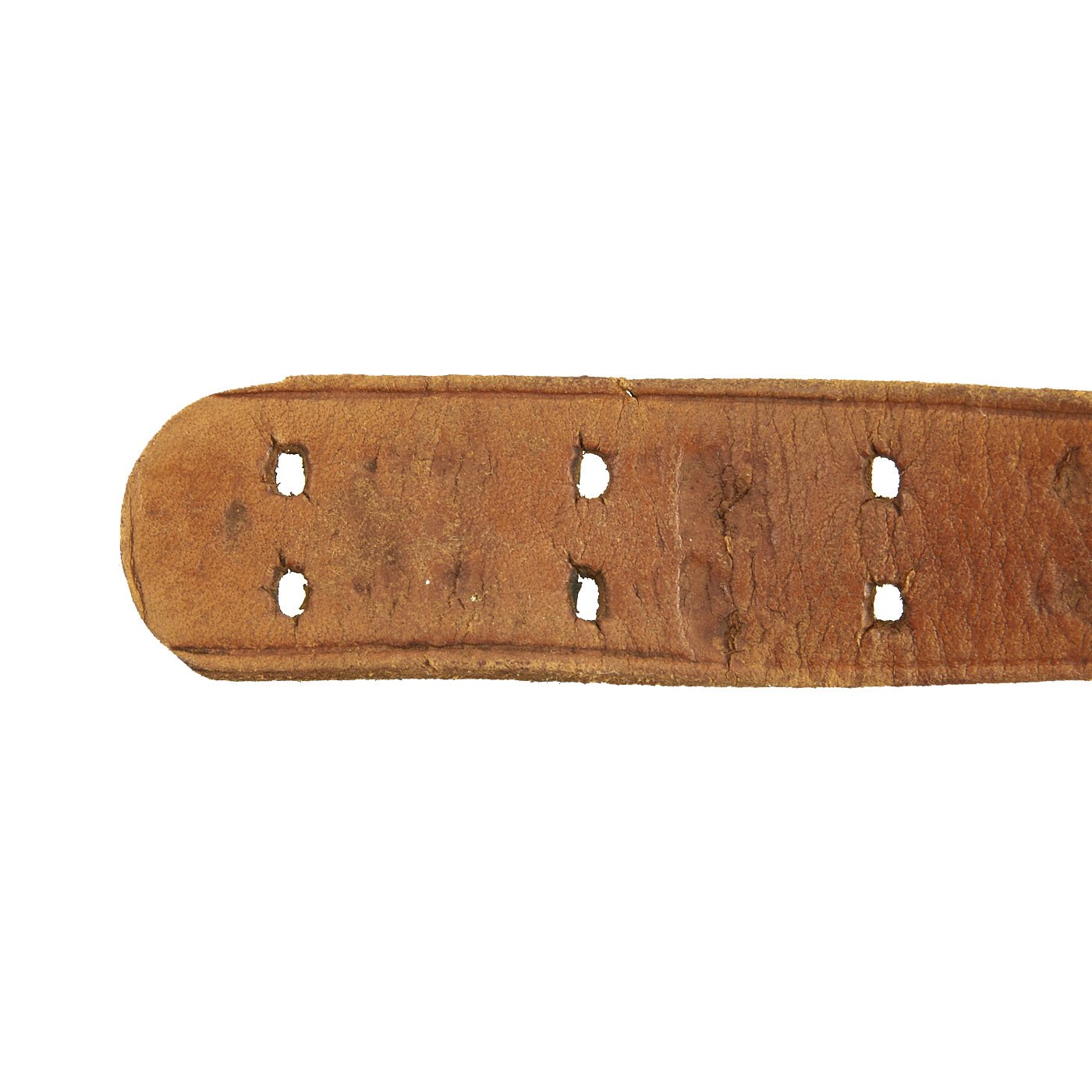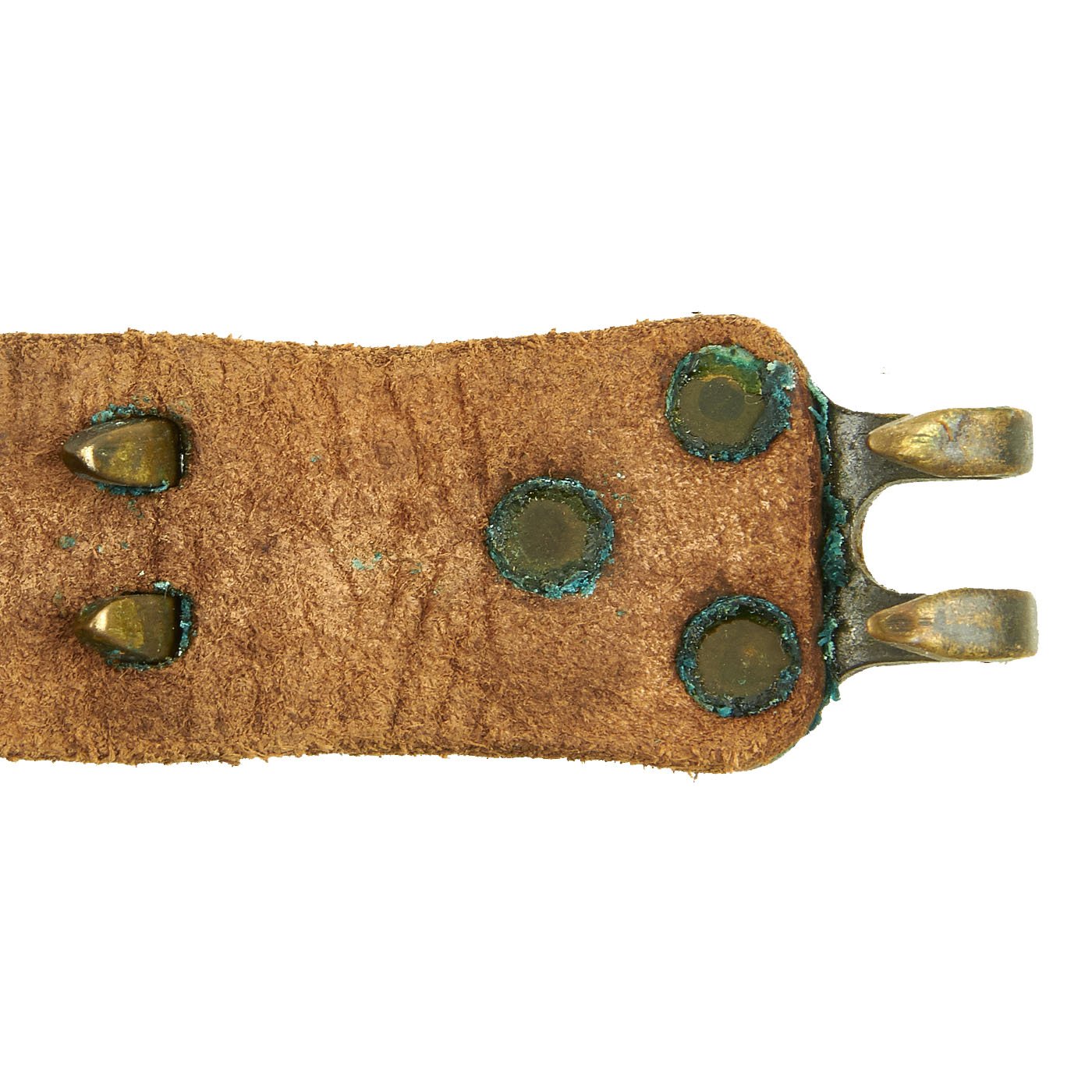 Condition of leather is good, though it is somewhat dry, and does show wear. It is complete with heavy stitching, proper adjustment holes and both correct pattern "blacked" brass hooks (fittings), though the finish has mostly worn away. Keeper loops are unfortunately missing. Some cracking is evident but overall it is totally functional and serviceable. There is a small amount of verdigris around all the metal fittings. An excellent upgrade for any U.S. issue WWI or WW2 rifle.