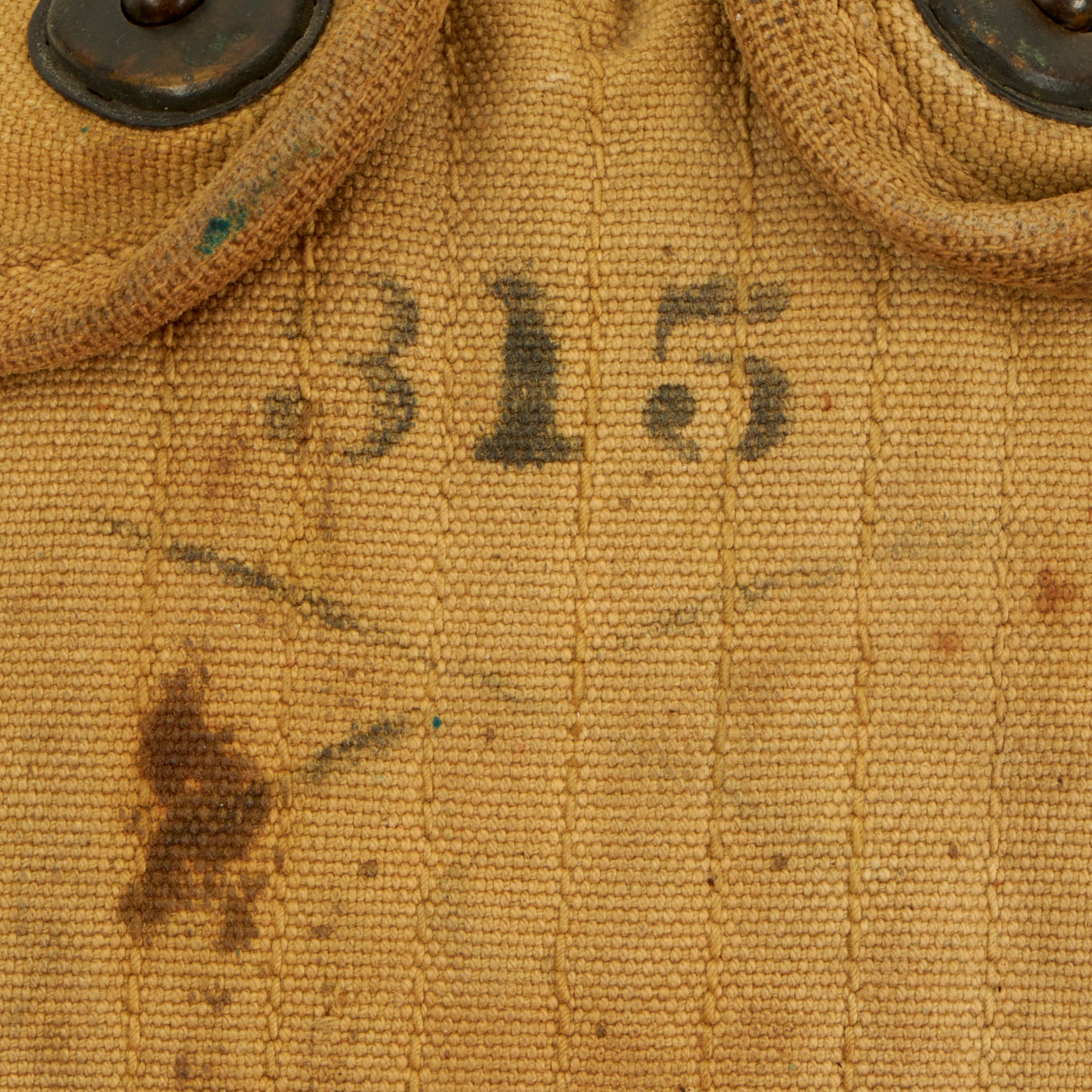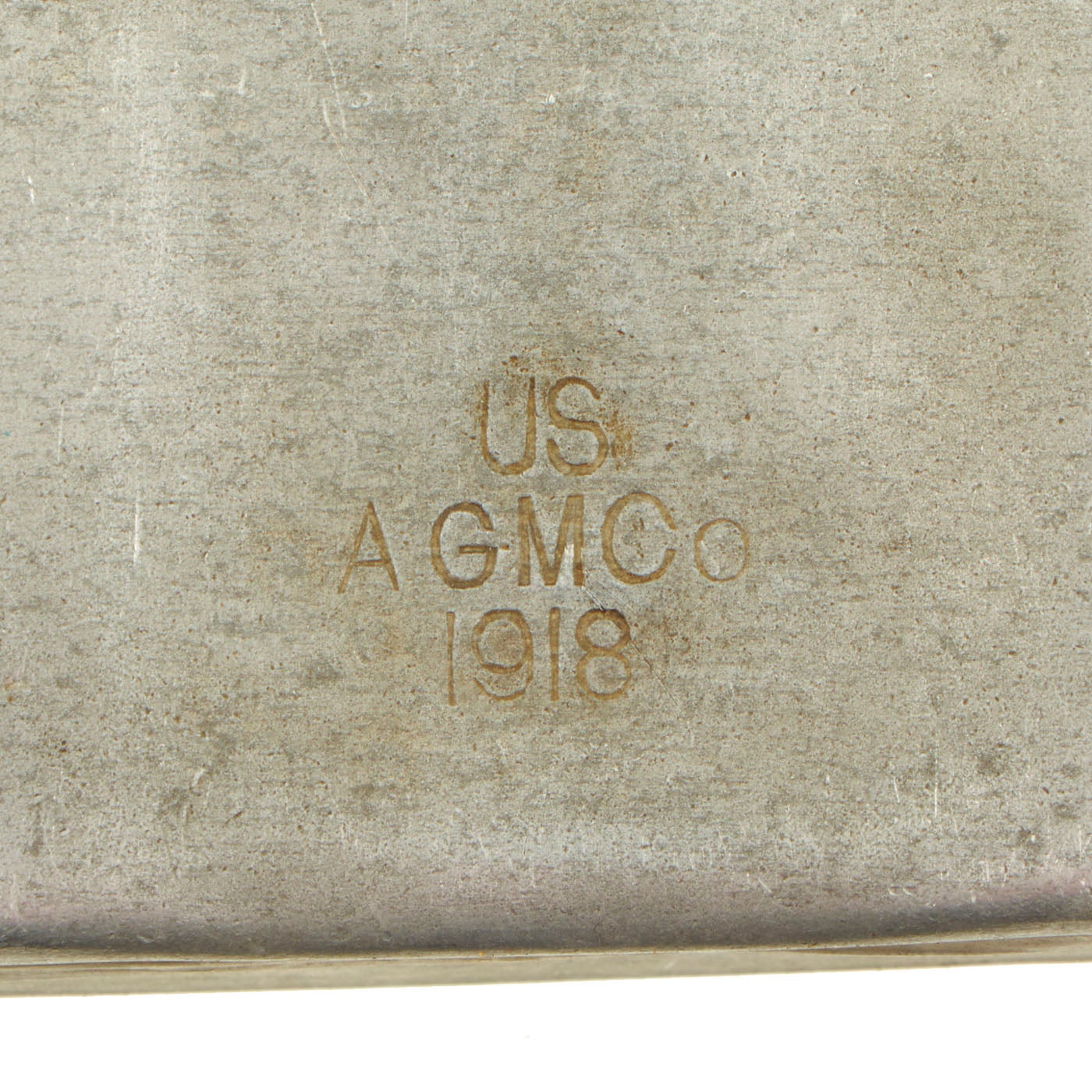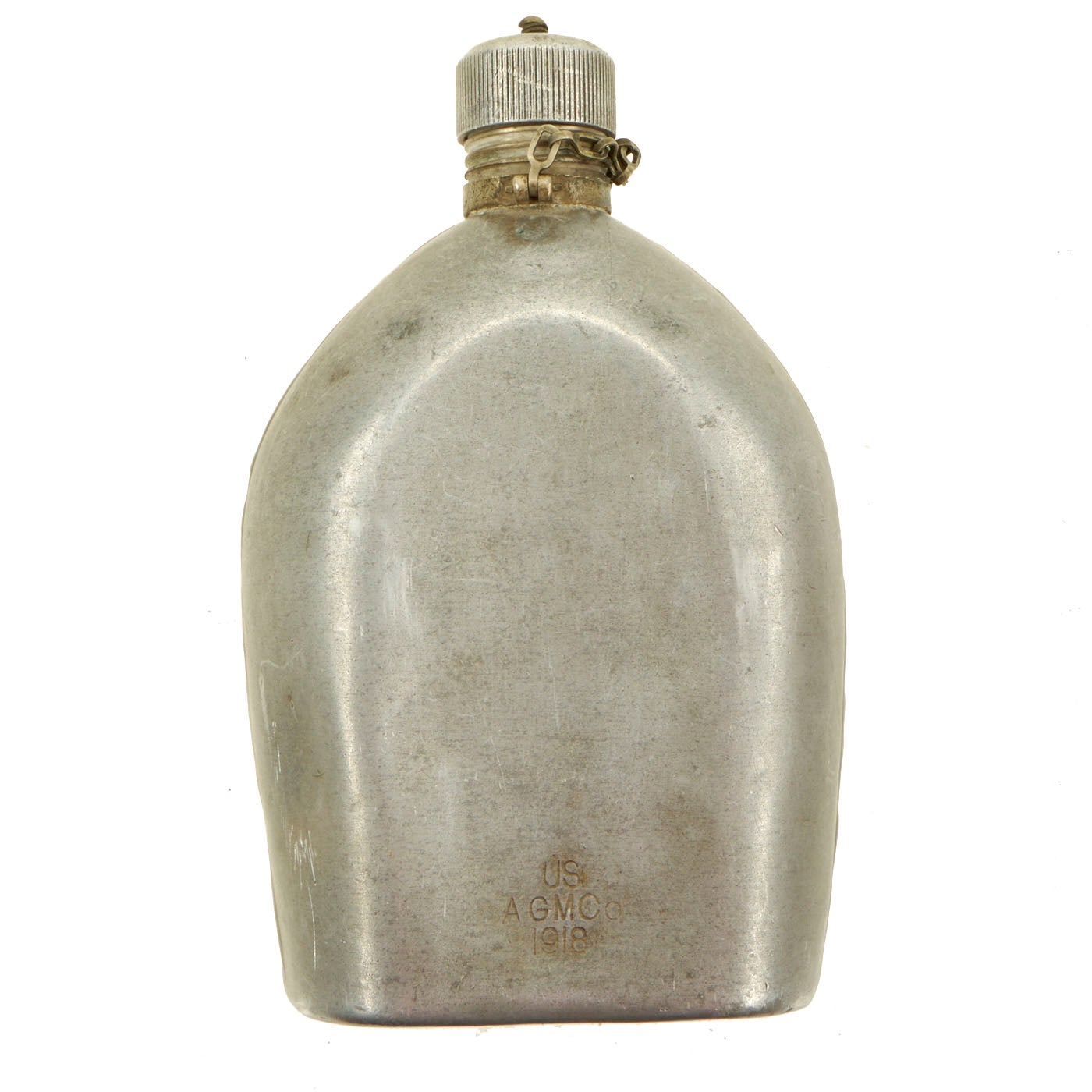 This example is in good condition, and looks to have seen moderate use during its service life. The canteen is fully non magnetic, made totally of aluminum, even the chain for the top. It is marked and dated U.S. / A.G.M. Co. / 1918, for the Aluminum Goods Manufacturing Co of Manitowoc, Wisconsin. This company manufactured various aluminum goods for the military. Unfortunately there was no cup included with the canteen.