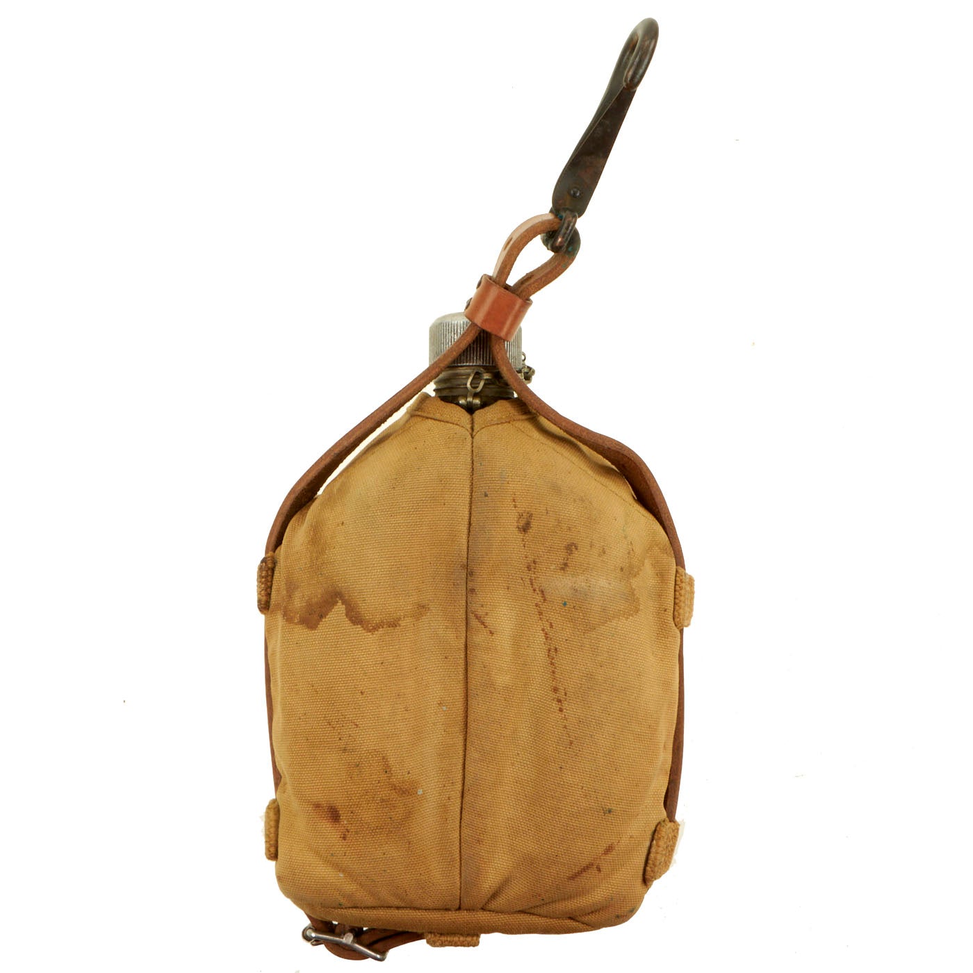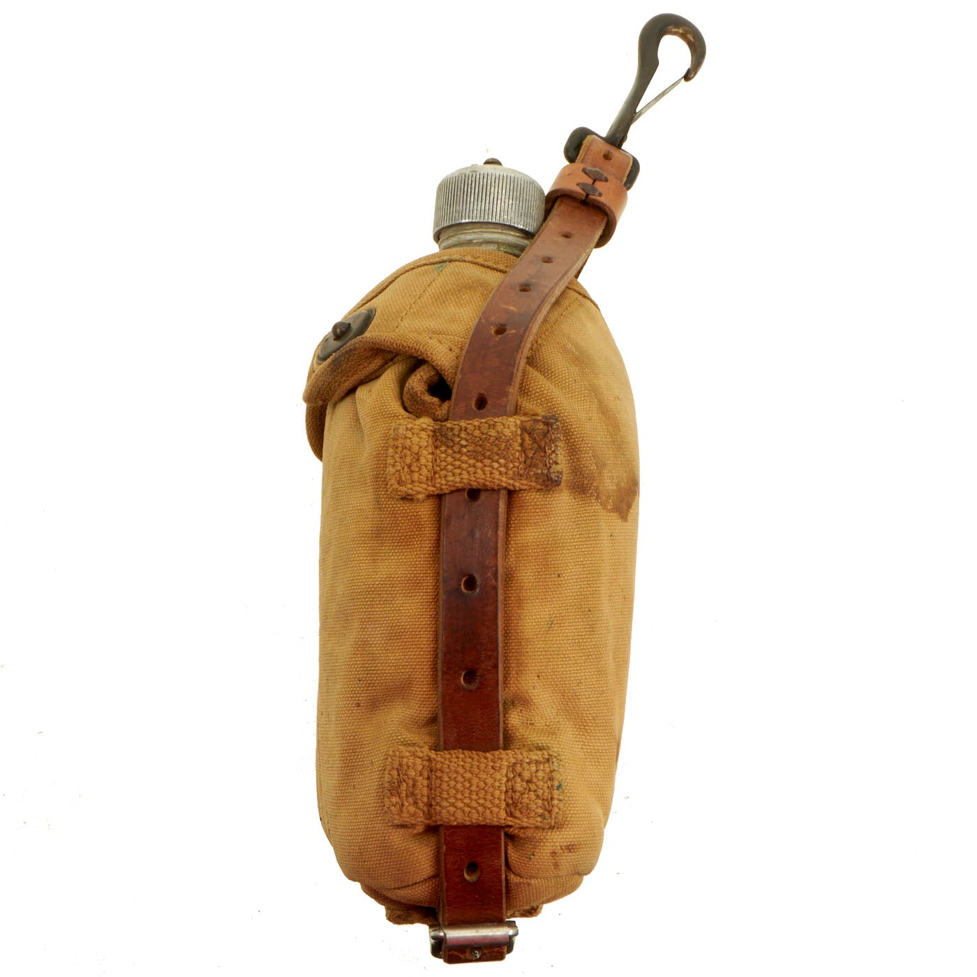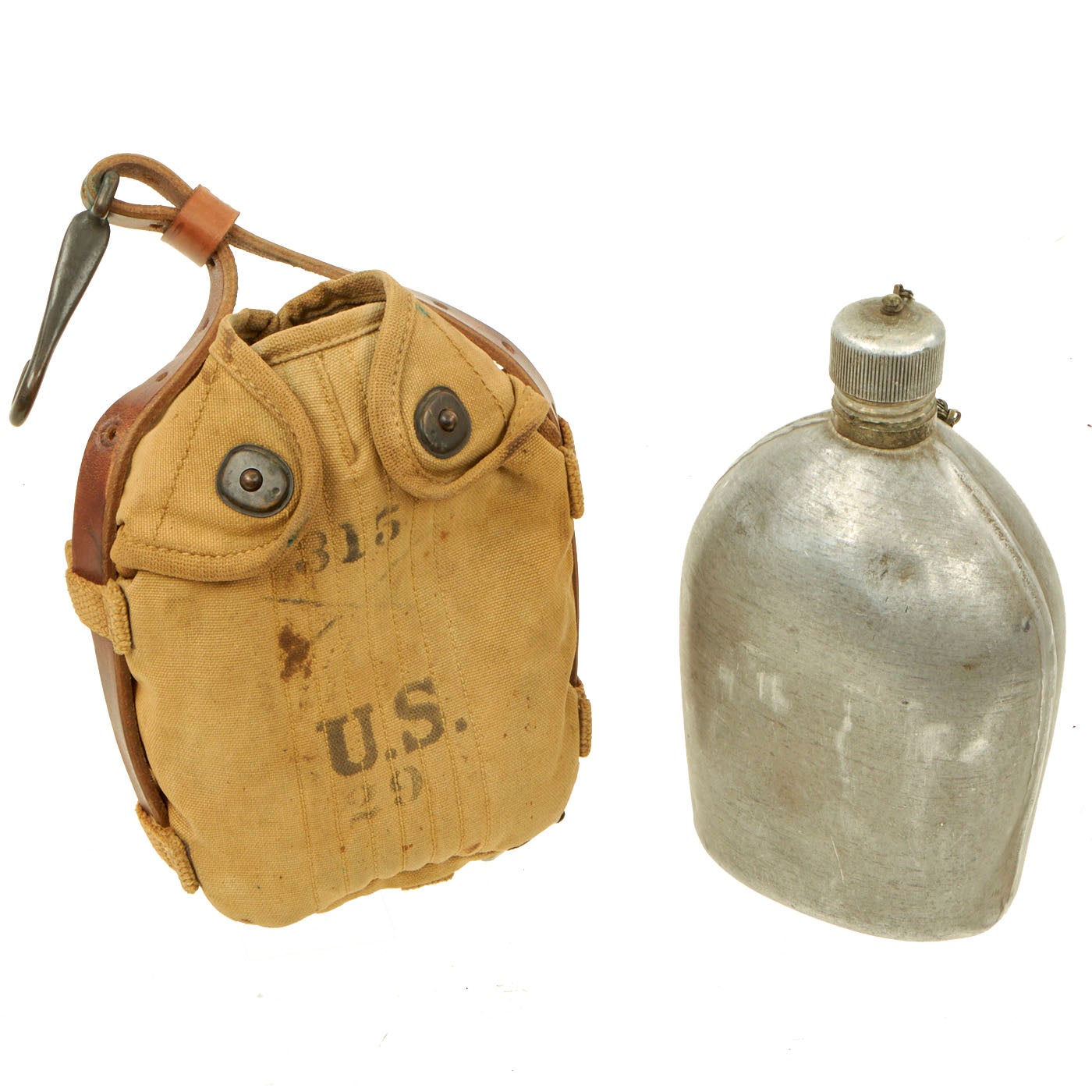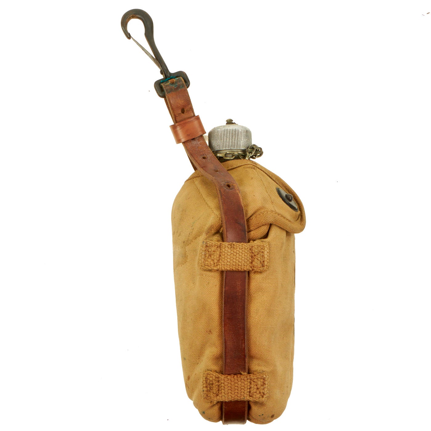 The U.S. military M1910-type one quart canteen was issued in a set with a nesting cup and, originally, a cotton duck carrier. As the canteen evolved from the original M1910 aluminum canteen model, the cover also was changed. The materials of which the cover was made, the flap fasteners, the attachment hardware and other features all went through multiple upgrades and revisions.