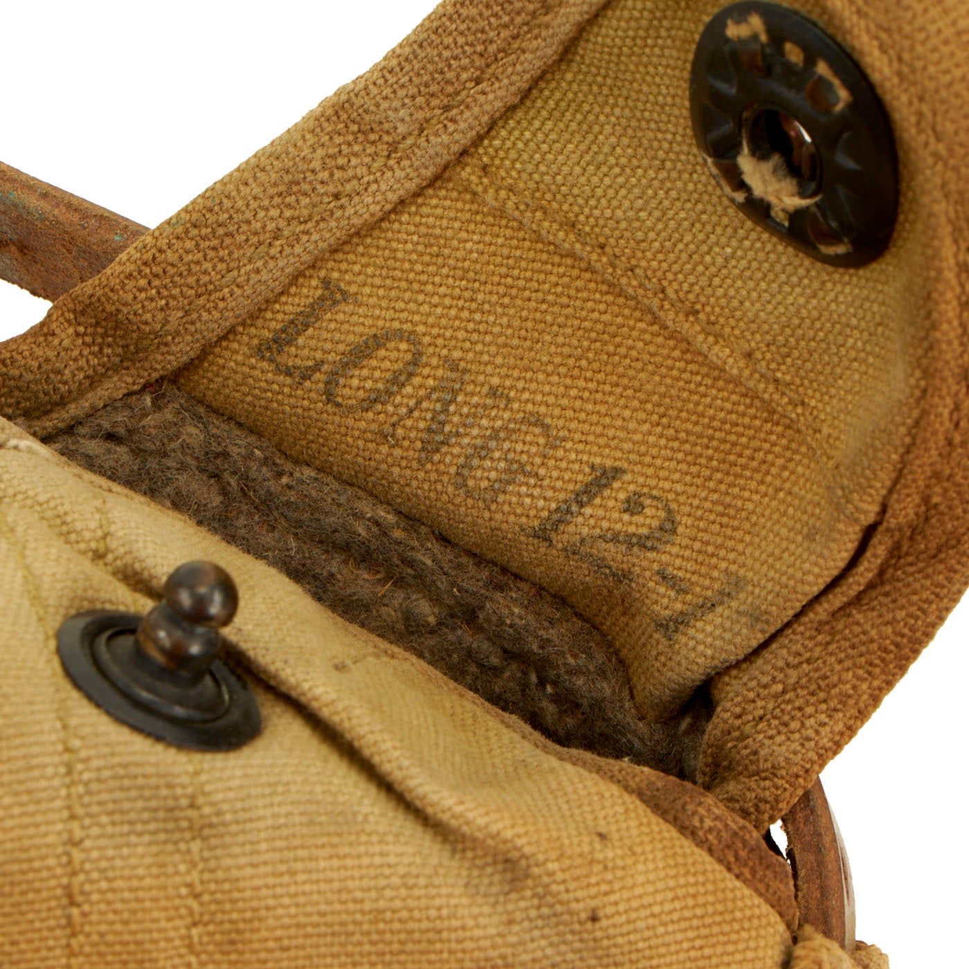 The carrier is in good shape, and is maker marked LONG 12-17 on the underside of the left side flap. The interior felt lining is retained very well, with no mothing or other insect damage. The snaps still have almost all of their original blacked brass finish, and the outer shell shows light wear but heavy fading. The leather strap is also in good shape, though it has degraded somewhat, being over a century old. There is some cracking and surface dry rot, but nothing what is expected for an item of this age.