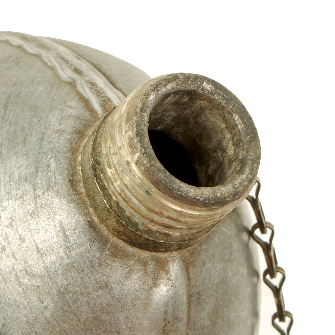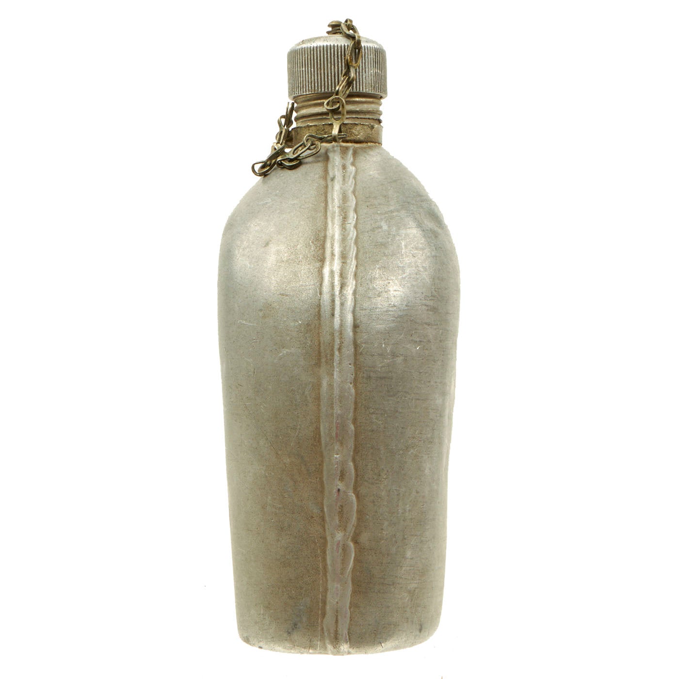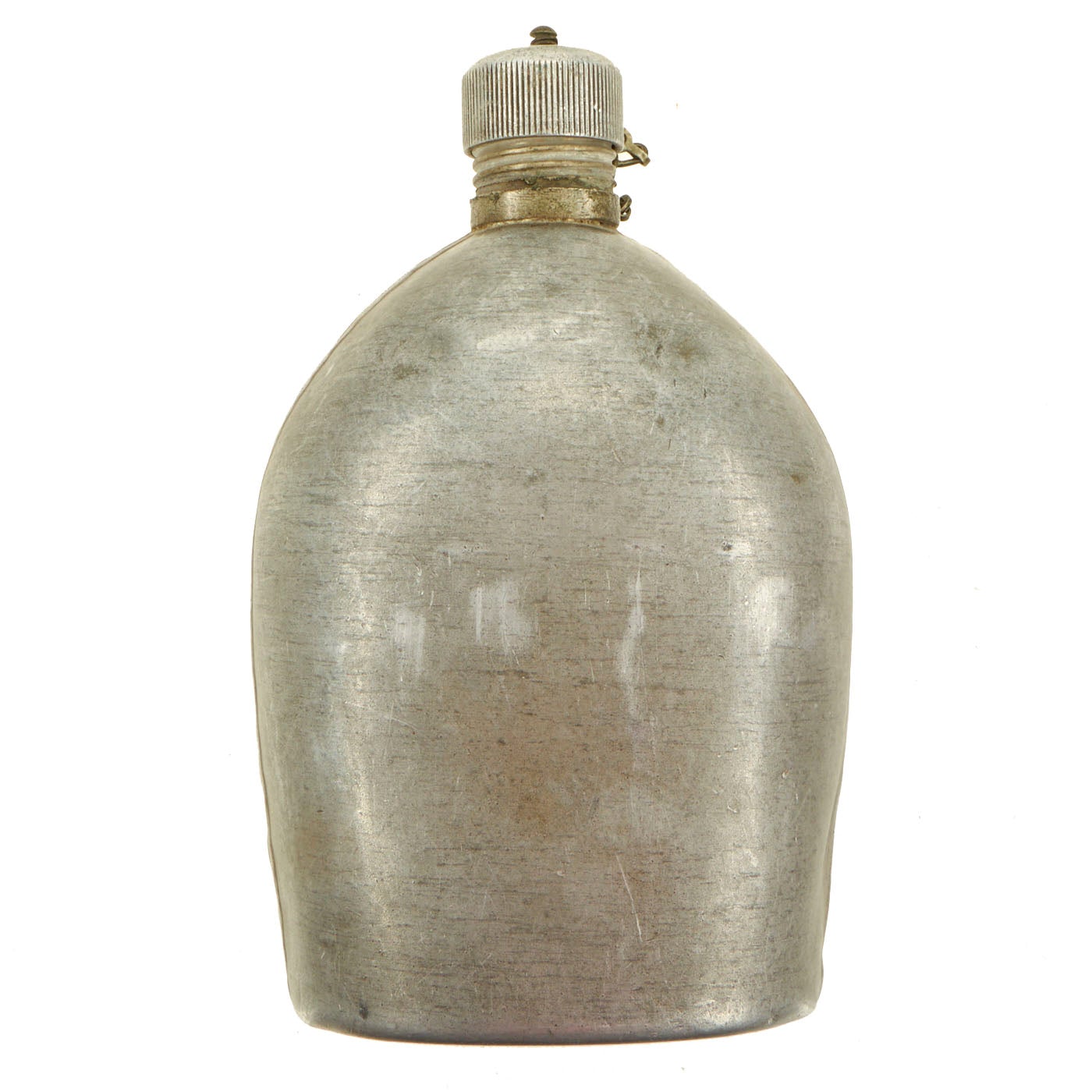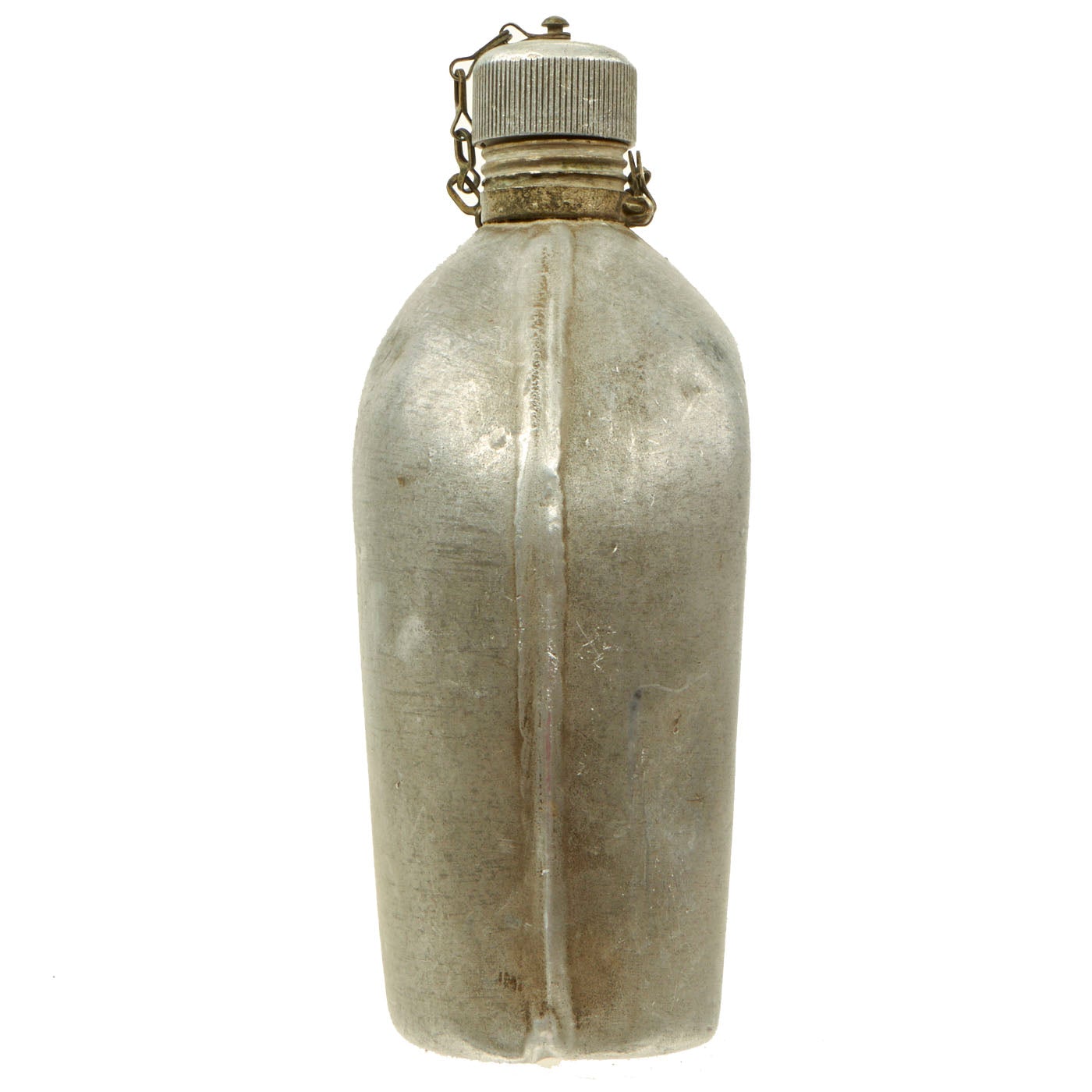 The canteen is in good shape, with the expected dents from use and age. The cap is present, with the original cork inside, and the securing chain intact.