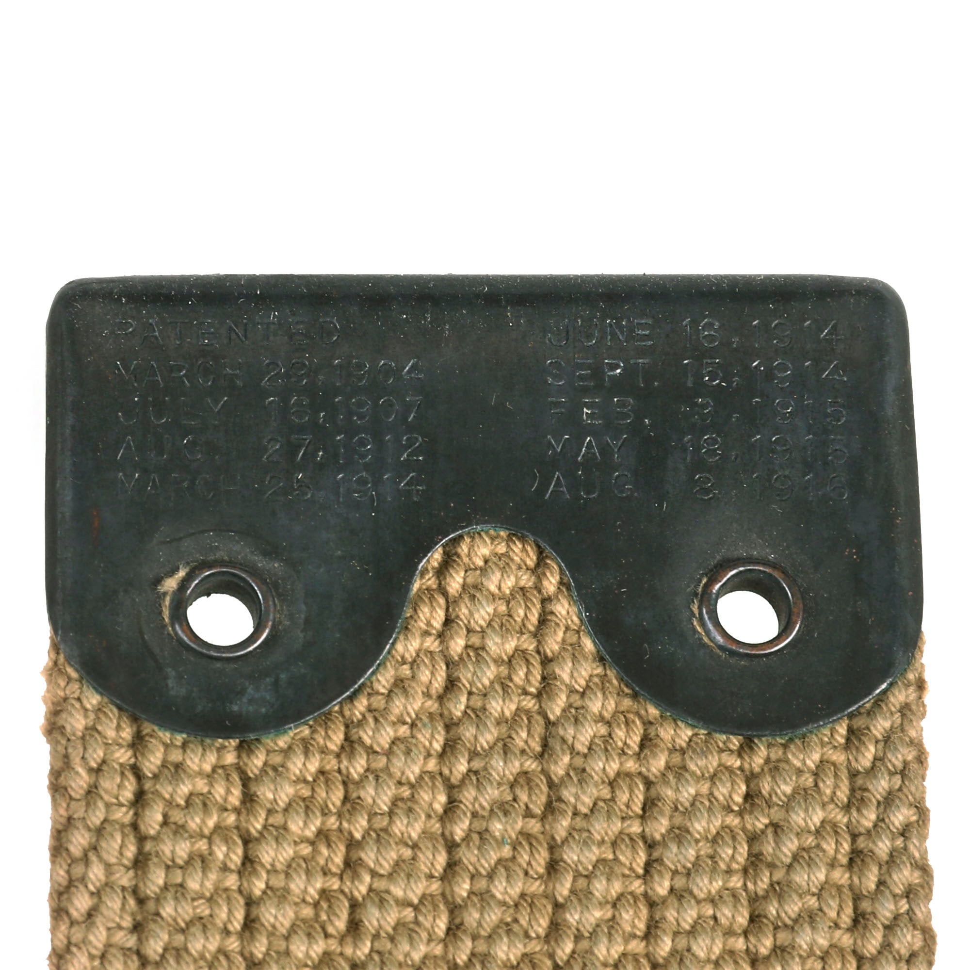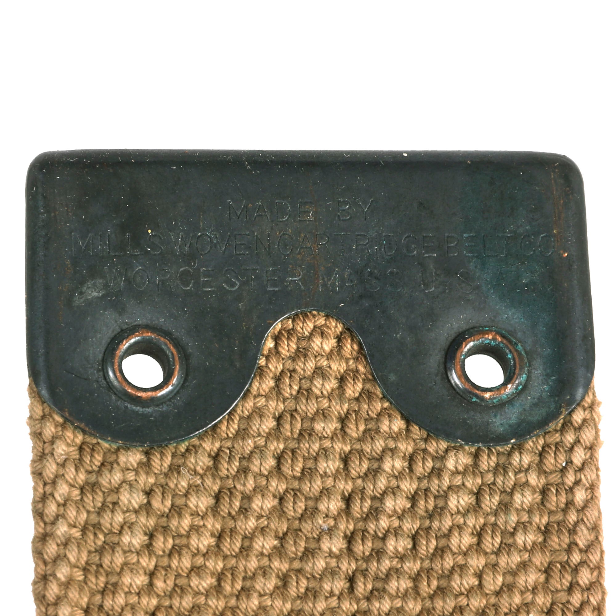 This is an unissued condition bandolier of the relatively scarce Mills Model 1912 Cavalry Cartridge Bandolier. In its original configuration, with no modifications, this bandolier has survived in excellent condition, with all of the “lift the dot” snaps intact, and with no tearing or wear around the snaps. The revolver ammunition pockets are intact, as are all the cartridge pocket flaps, with none of the flaps showing any wear. The original darkened finish is present on all the metal fittings. This Model 1912 Bandolier with the proper “U” curved body has a full length web billet on one end and the proper frame friction buckle on the other. There is a slight curve to the bandolier as these were meant to be crossbody worn. The darkened brass billet strap is stamped on both sides with all of the appropriate Mills Patent information and dates - the last date being 1916 - and the inside of the far left cartridge pocket flap is ink stamped JUN 1917 and MILLS inside the bullet logo.