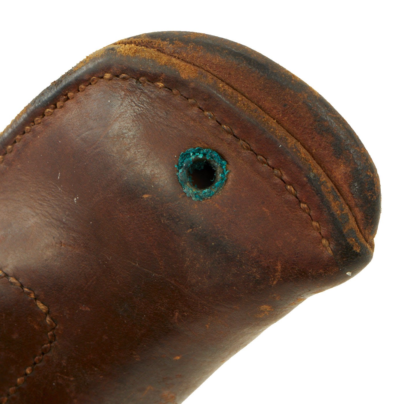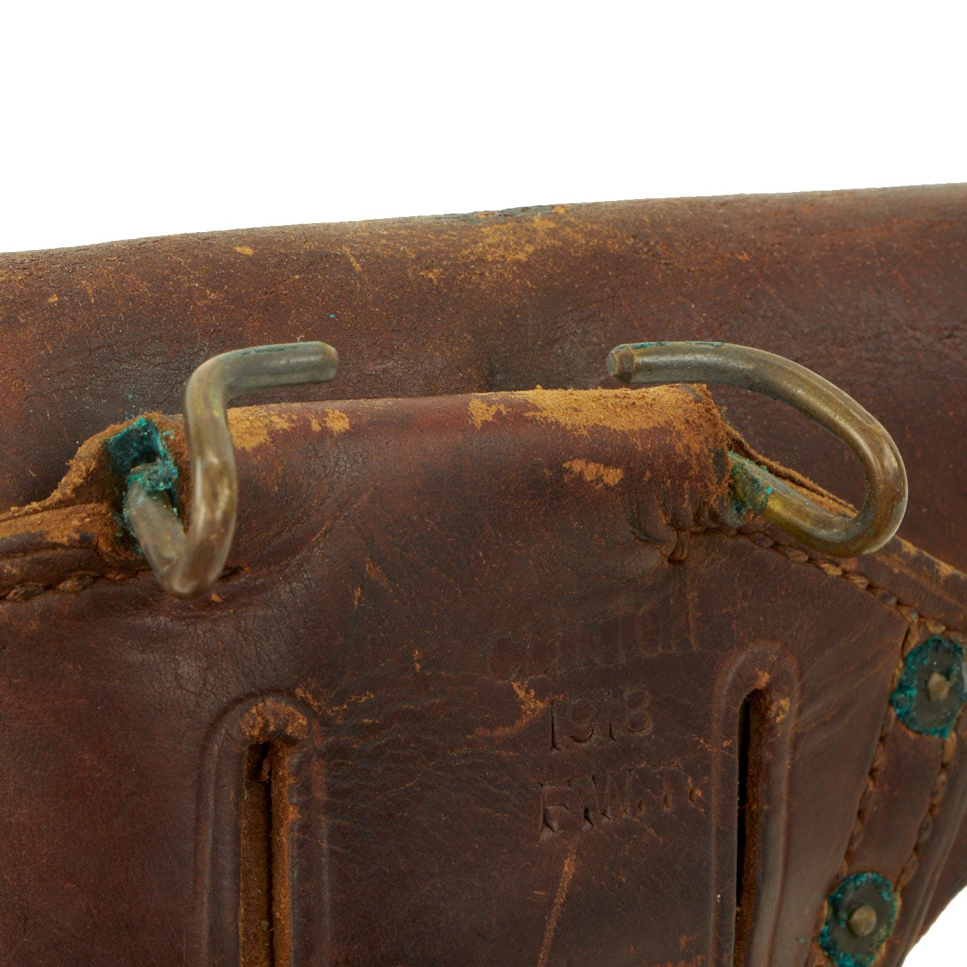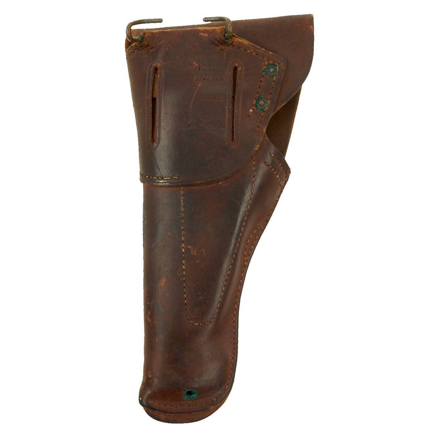 This M1916 holster in very good condition, with a deep russet brown color to the leather, with no major damage, and just wear and marks from age. All stitches still intact, with all brass parts still present, though there is some verdigris buildup around the rivets and hanger.