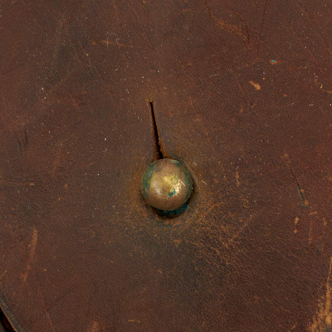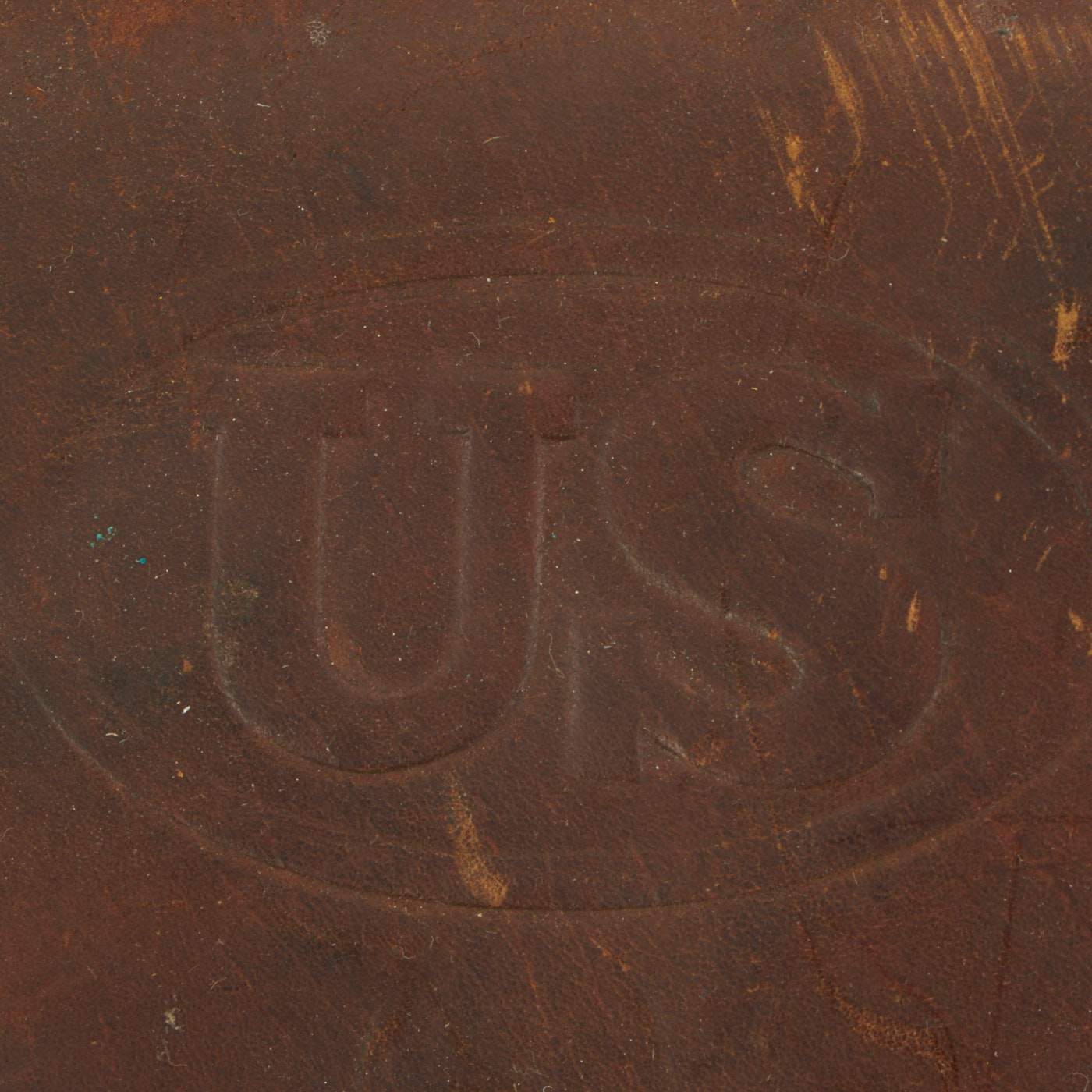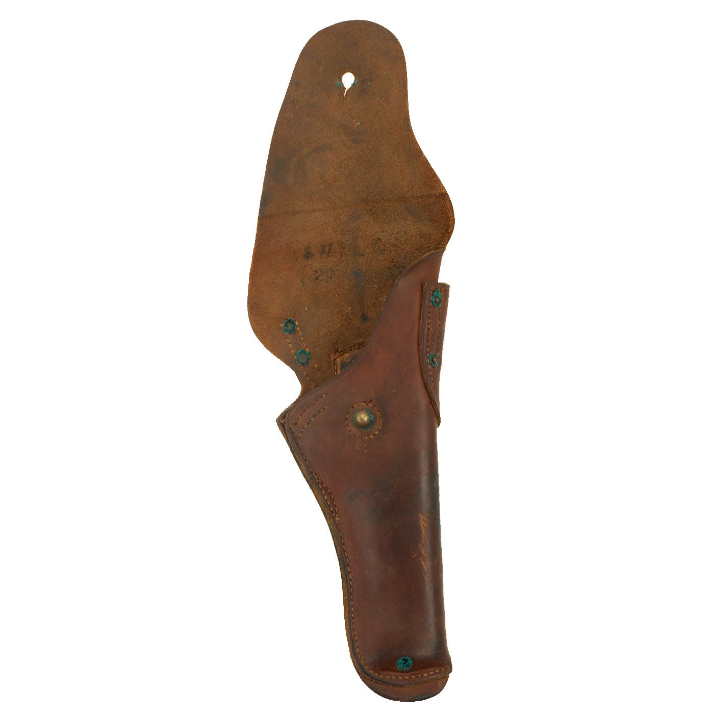This M1916 holster in very good condition, with a deep russet brown color to the leather, with no major damage, and just wear and marks from age. All stitches still intact, with all brass parts still present, though there is some verdigris buildup around the rivets and hanger.